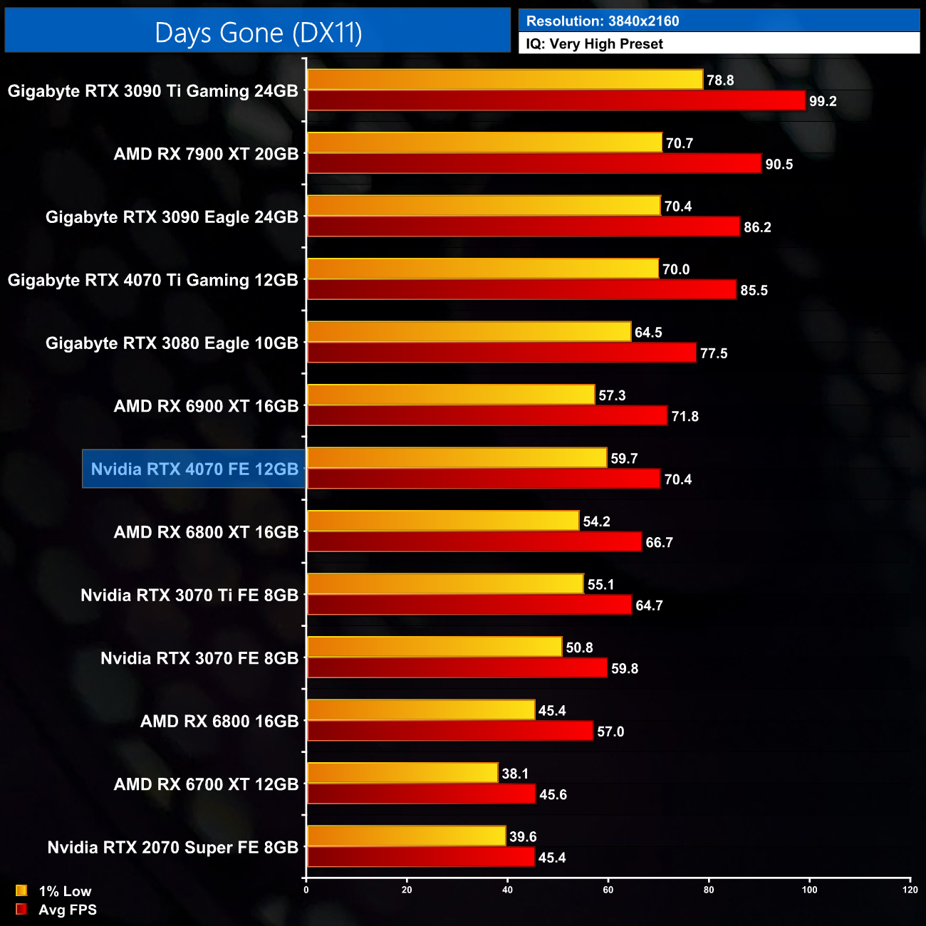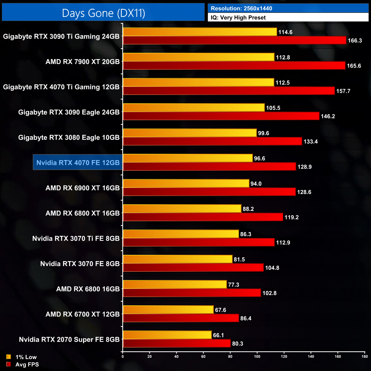 Days Gone is an Unreal Engine 4 title and this typically favours Nvidia, with the RTX 4070 dead level with the RX 6900 XT at 1440p. Things are very close between the 4070 and the 3080 as well, while we're looking at a 14% uplift over the RTX 3070 Ti.
