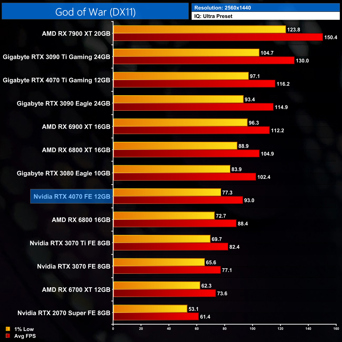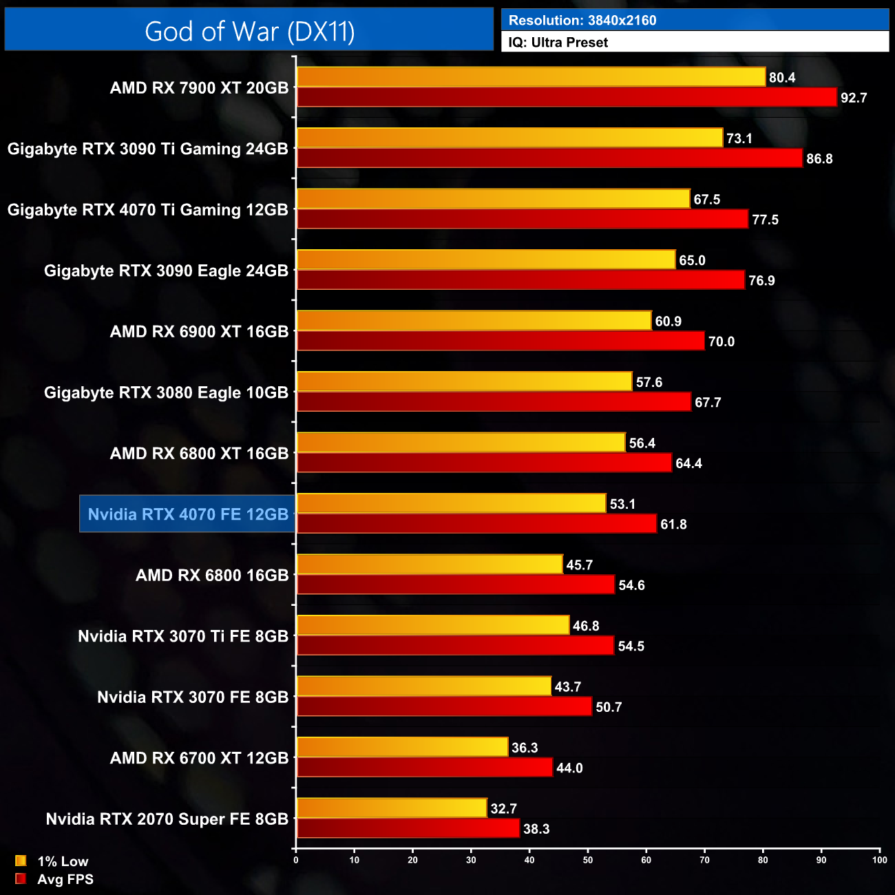 Performance levels in God of War are similar to Dying Light 2, as the RTX 4070 again delivers 93FPS on average, but this time that makes it 9% slower than the RTX 3080 and just 5% faster than the RX 6800. We're also looking at just a 13% improvement versus the RTX 3070 Ti.