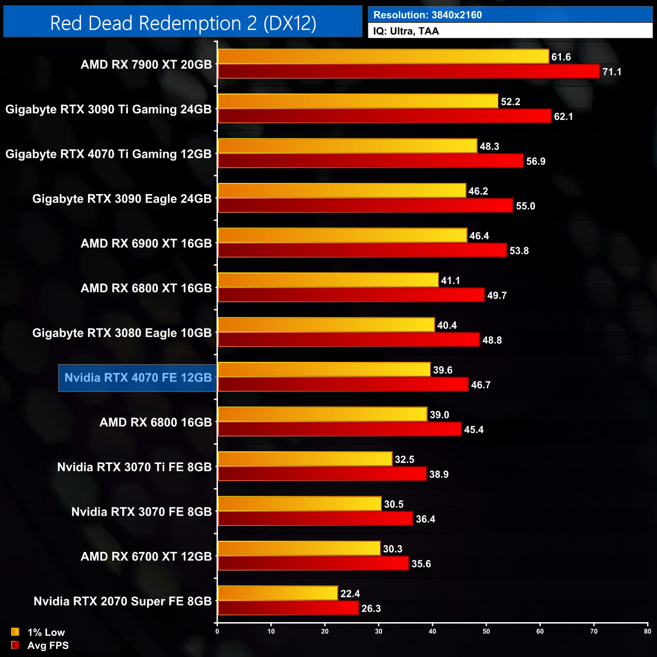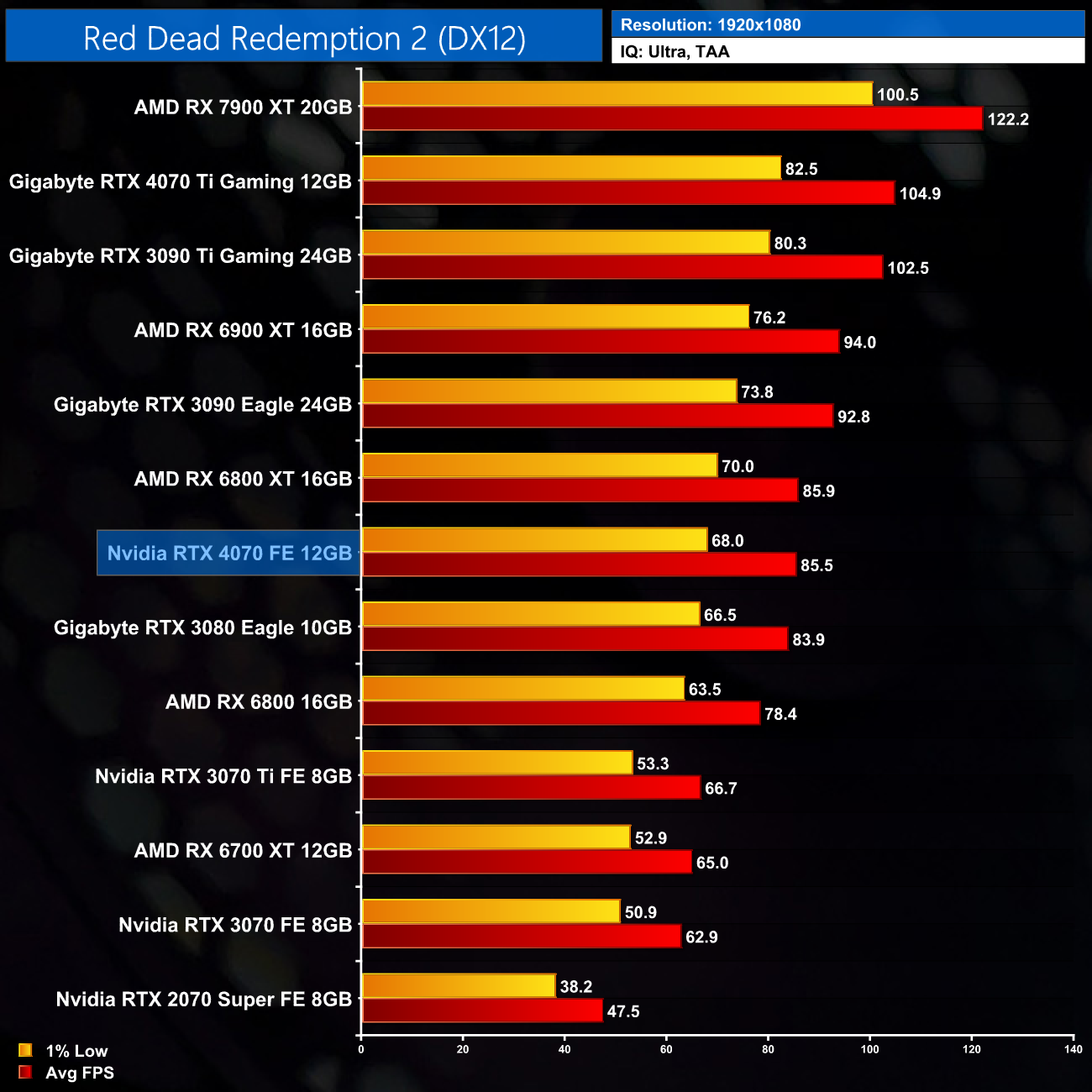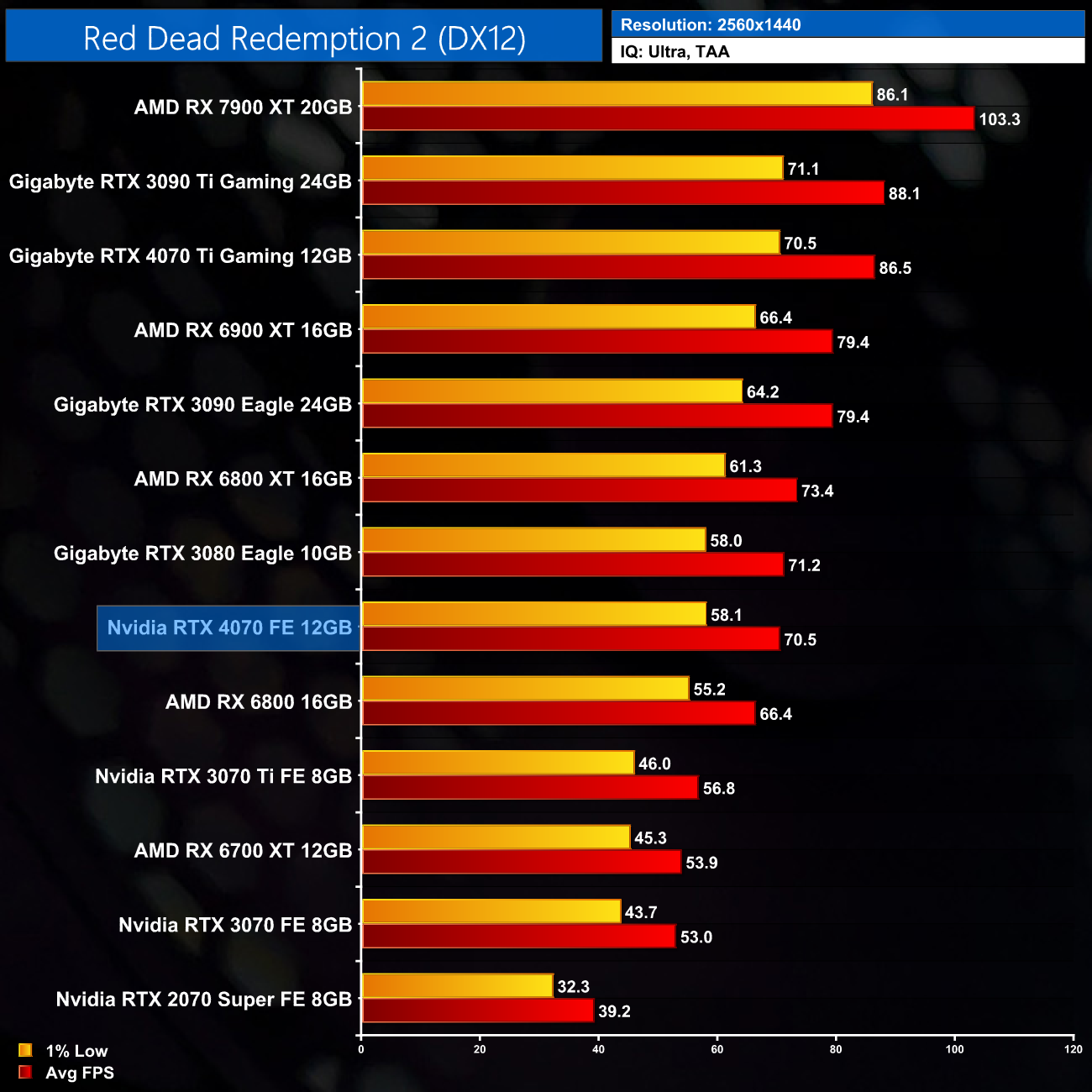 Read Dead Redemption 2 is an all time classic and remains incredible testing for modern hardware, with the 4070 delivering just under 71FPS in our demanding test scene. That puts it level with the RTX 3080 but 4% slower than the RX 6800 XT at 1440p.