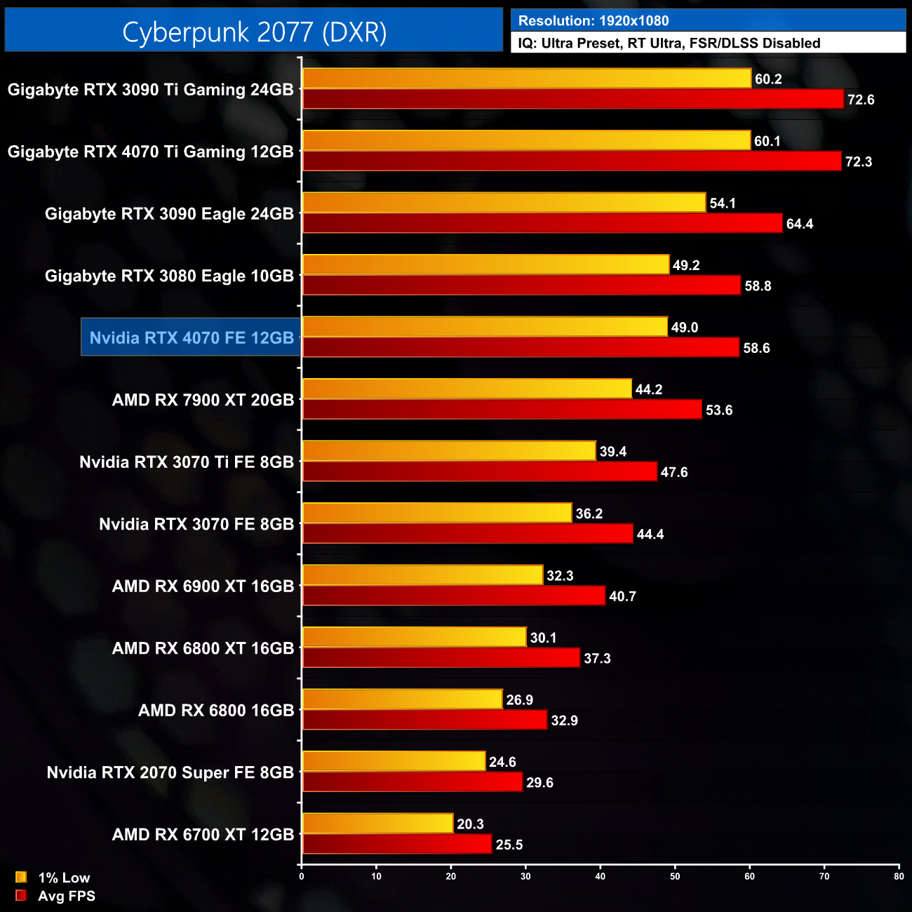 Cyberpunk is one of the most taxing ray traced games currently – and that's without even touching on the new RT Overdrive mode! At 1080p the 4070 delivers just under 59FPS, where it is on par with the RTX 3080, but impressively 9% faster than AMD's much more expensive RX 7900 XT.