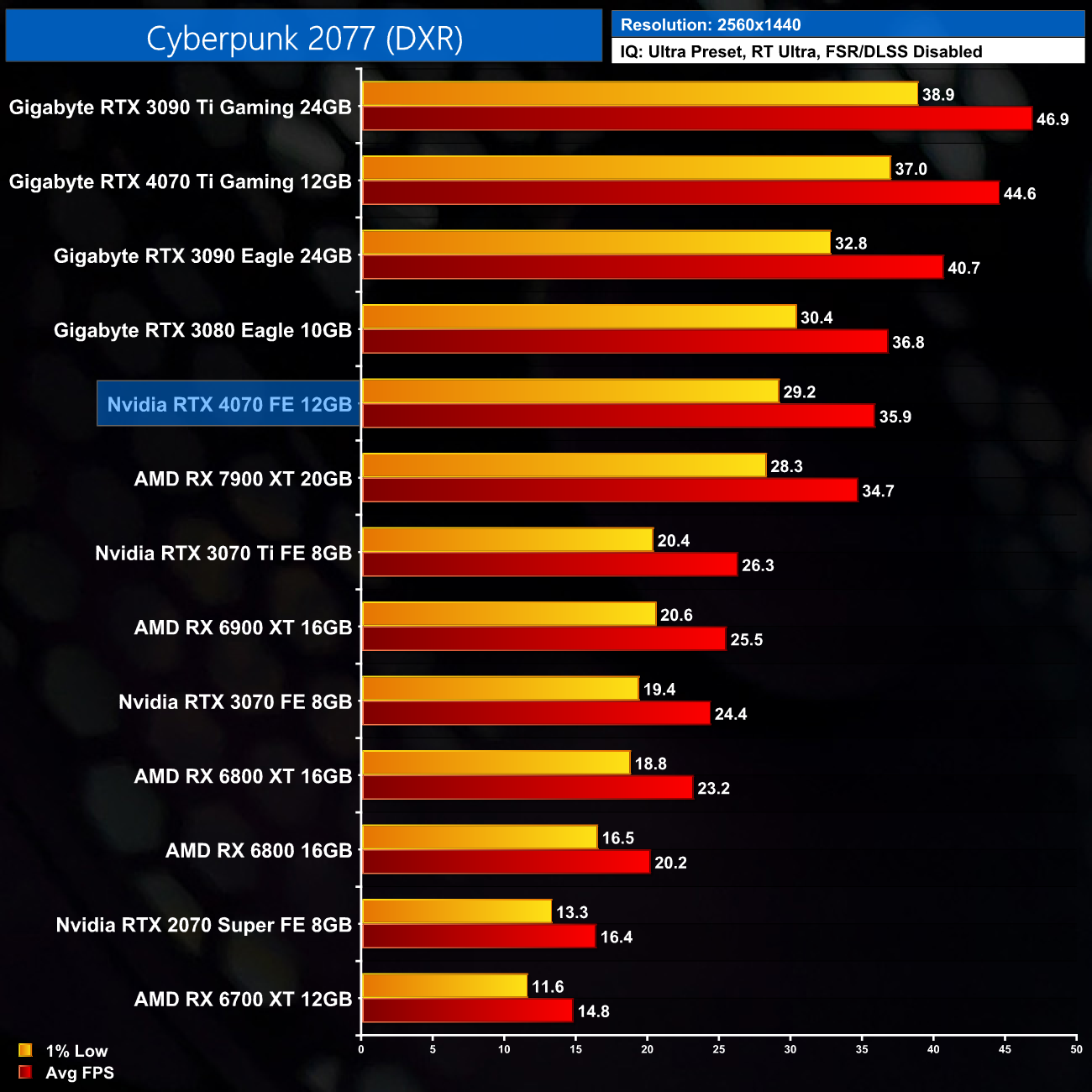 At 1440p you'd likely want to engage DLSS (which we benchmark later in this review), with 36FPS at native resolution it's not overly smooth, but the 4070 is still roughly level with the RTX 3080, but now a hefty 37% faster than the RTX 3070 Ti, with VRAM again a possible factor there.