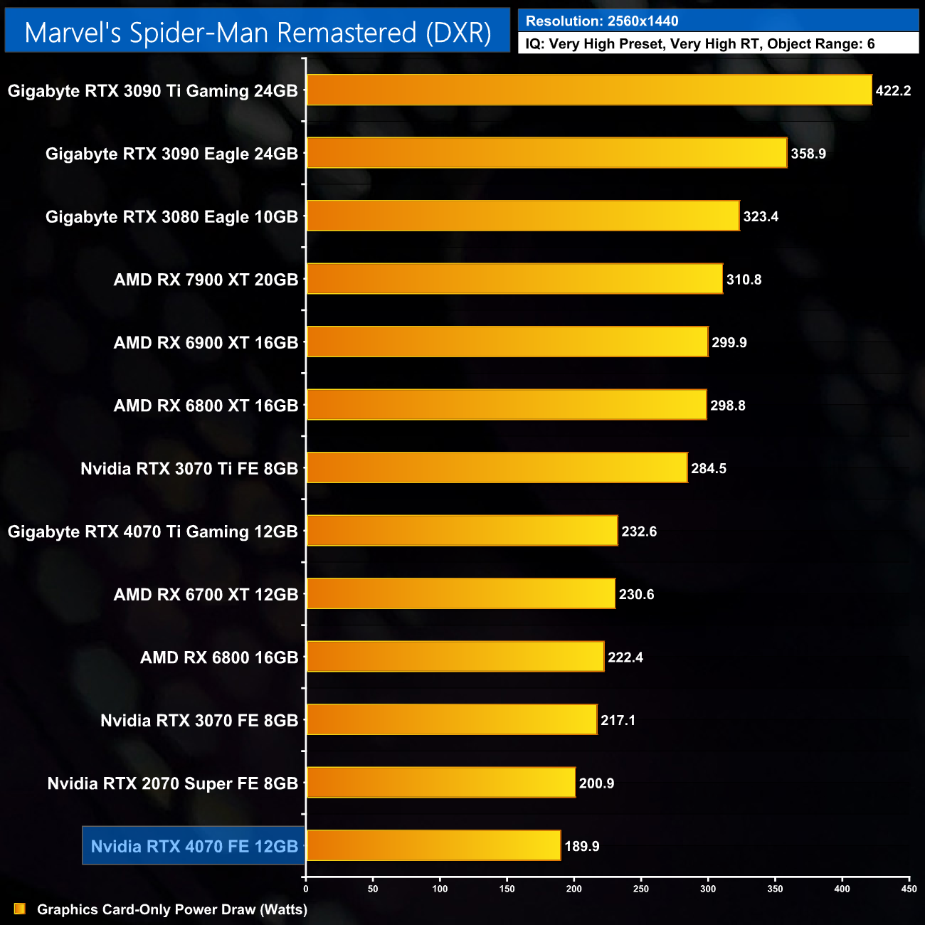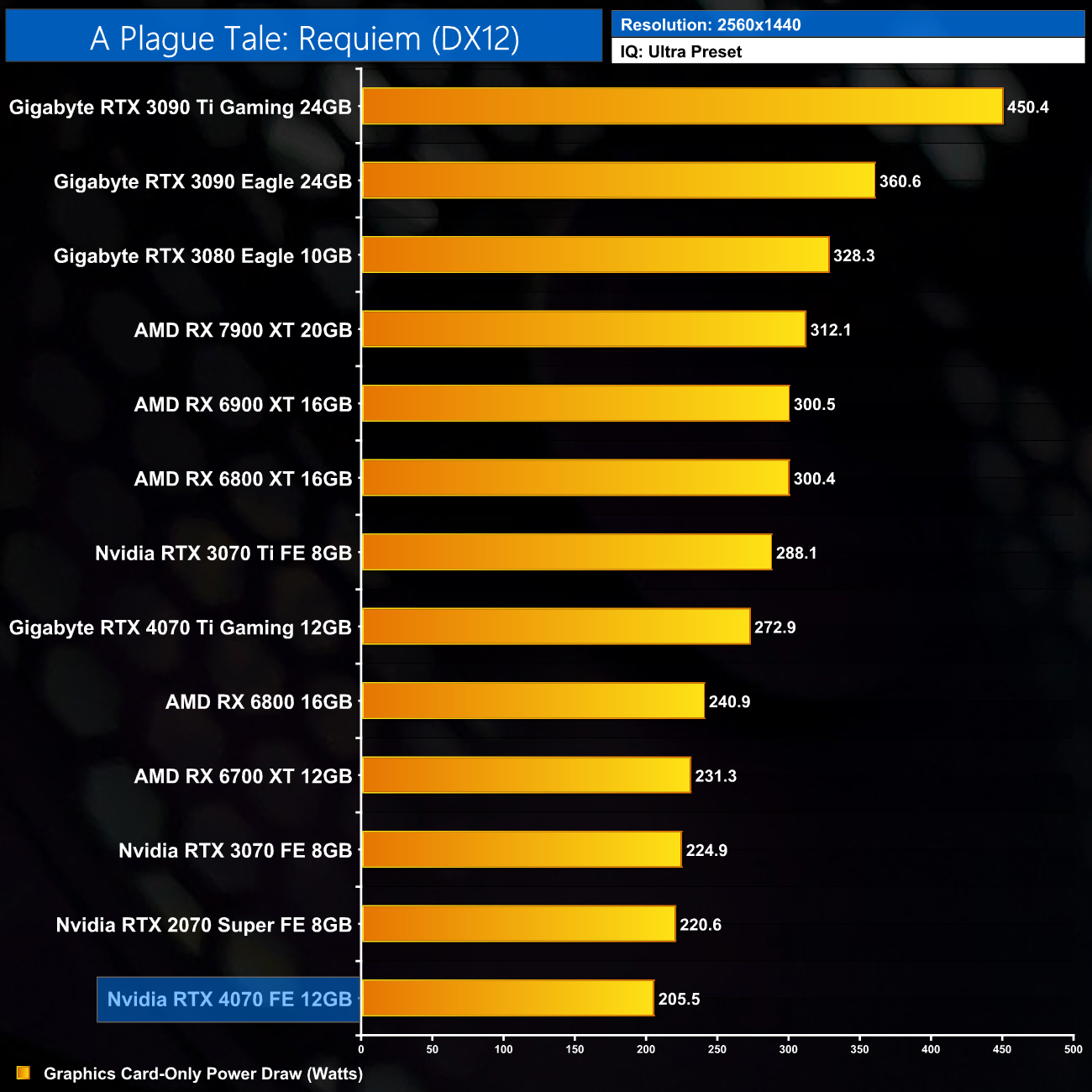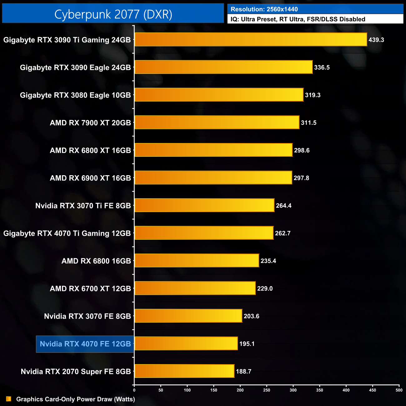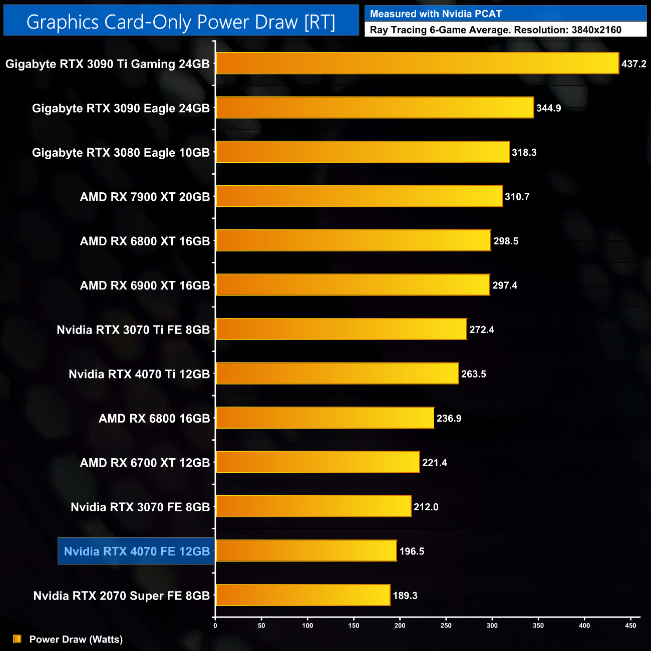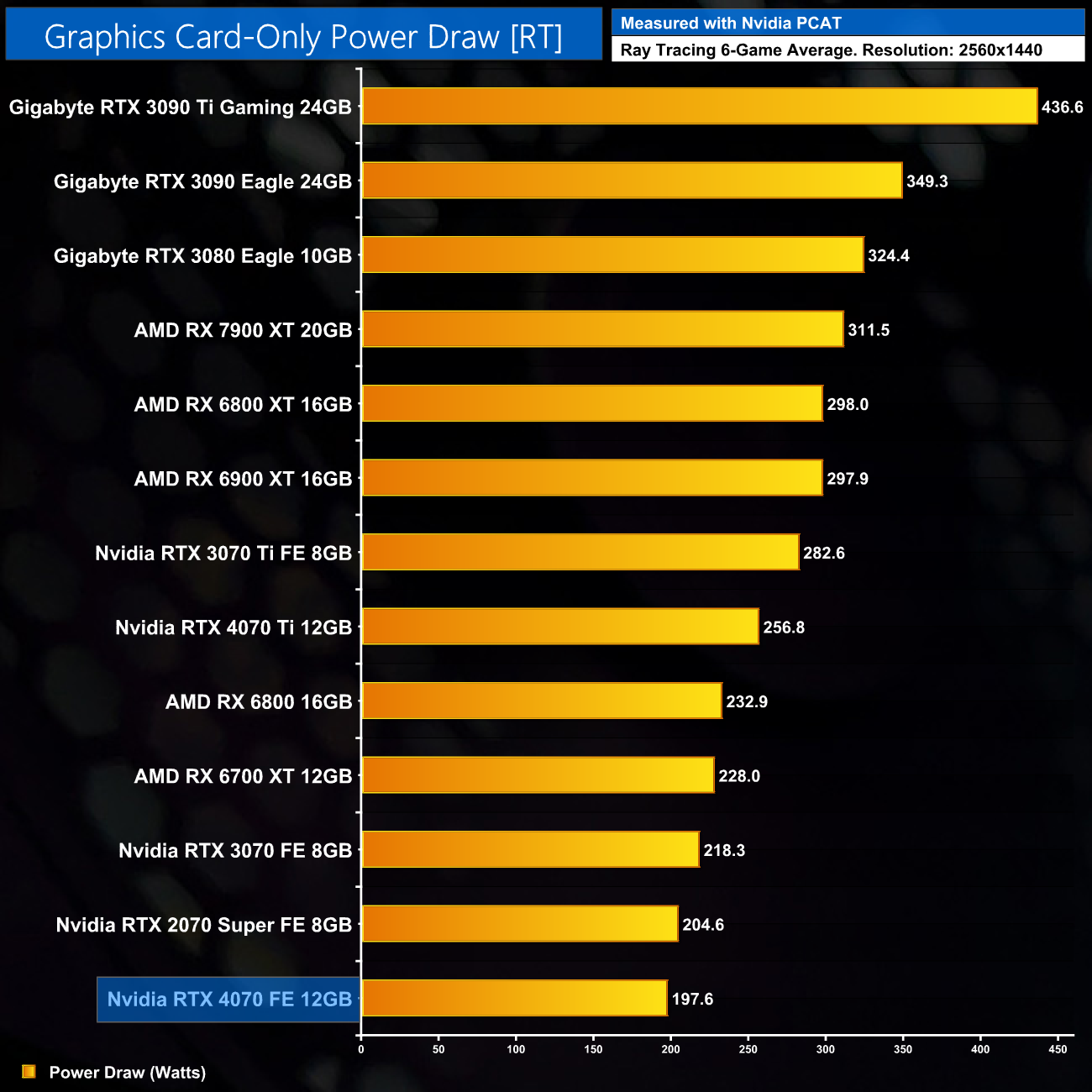 It's not much different at 1440p with ray tracing engaged either, with the 4070 now averaging 197.6W.