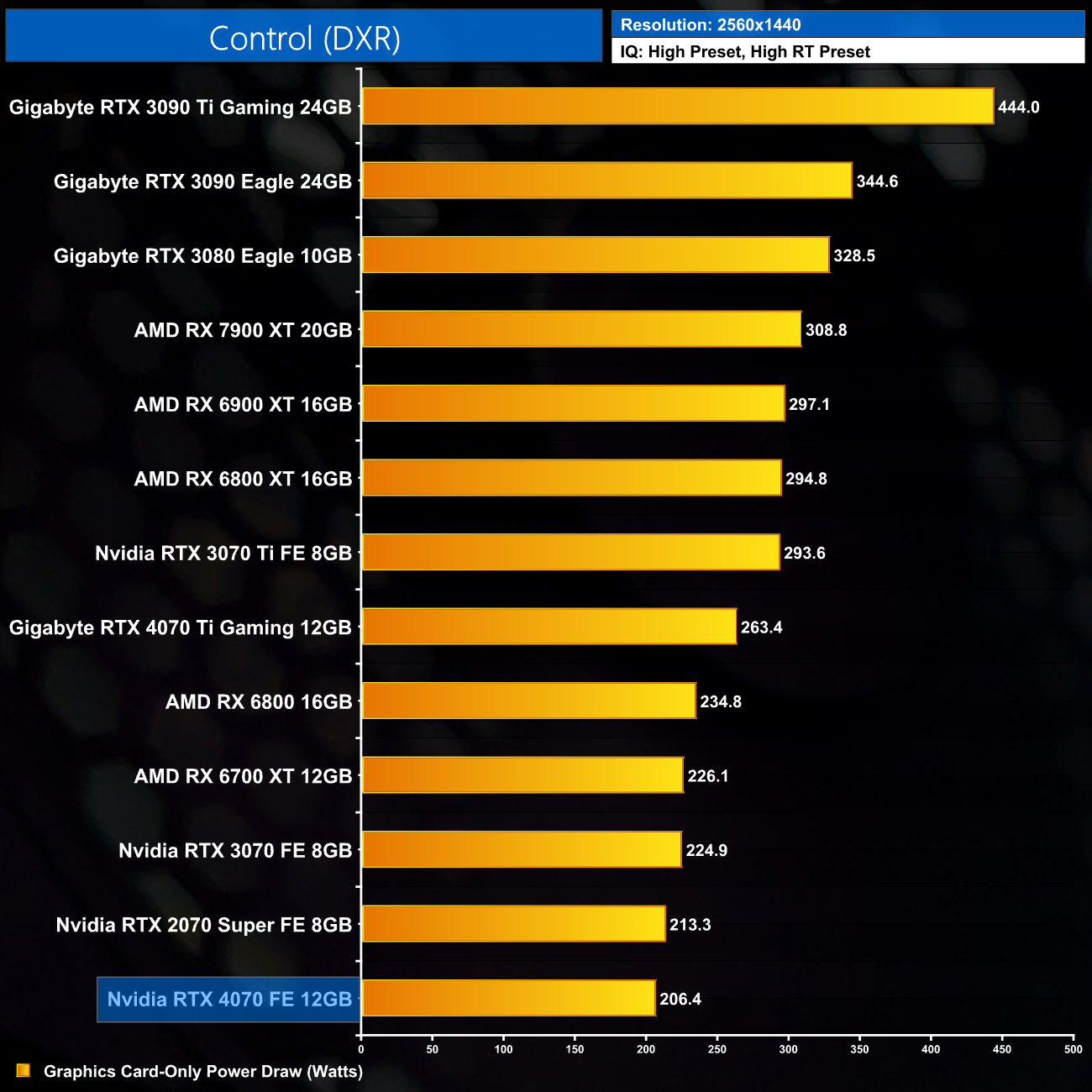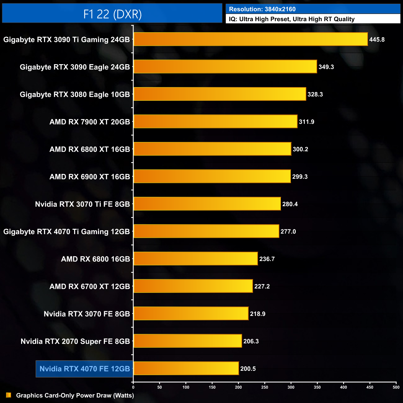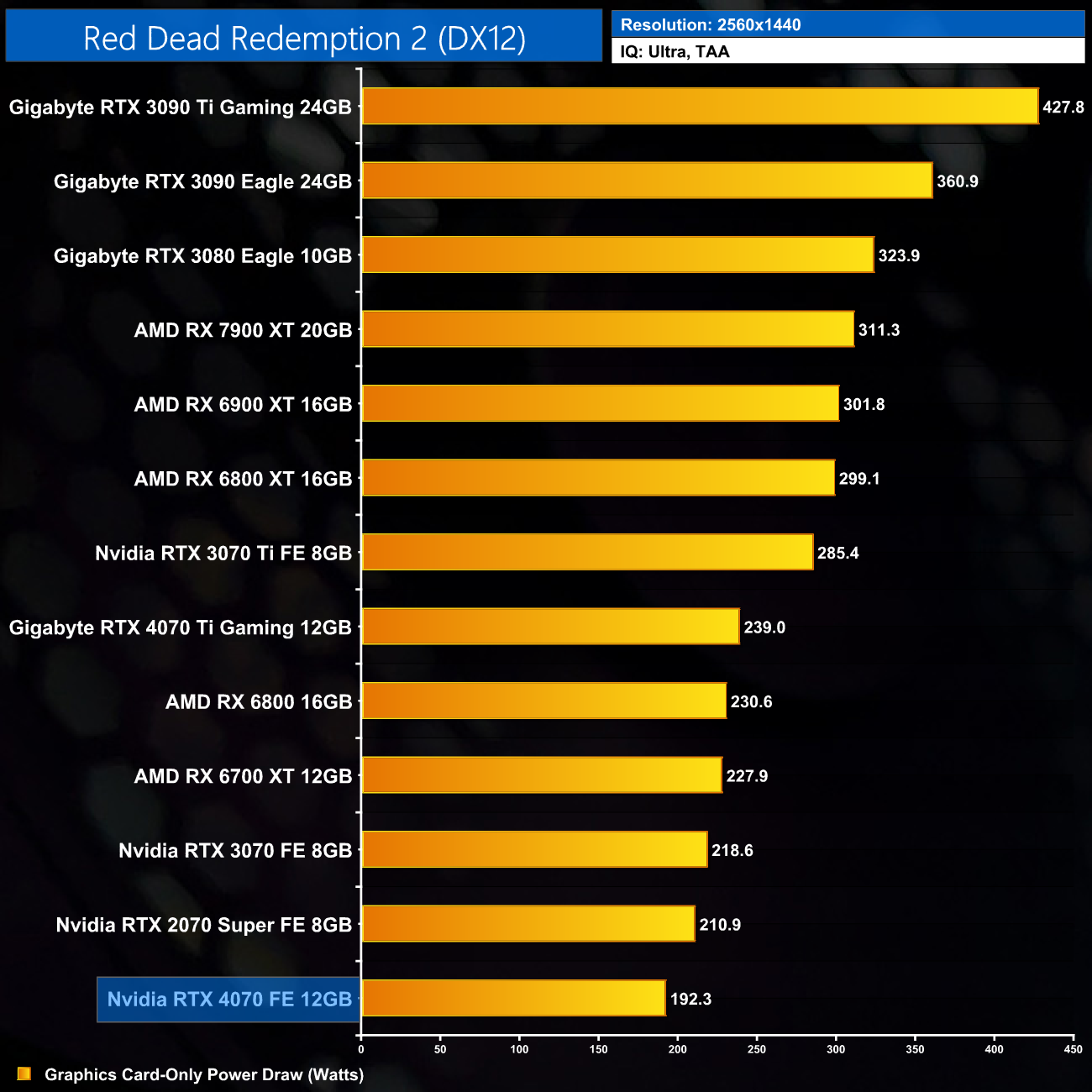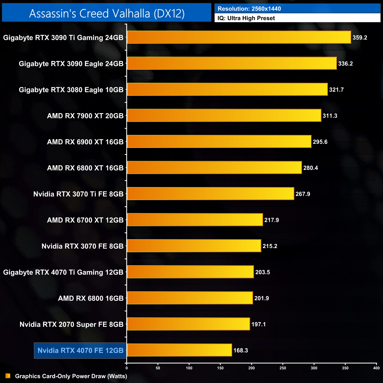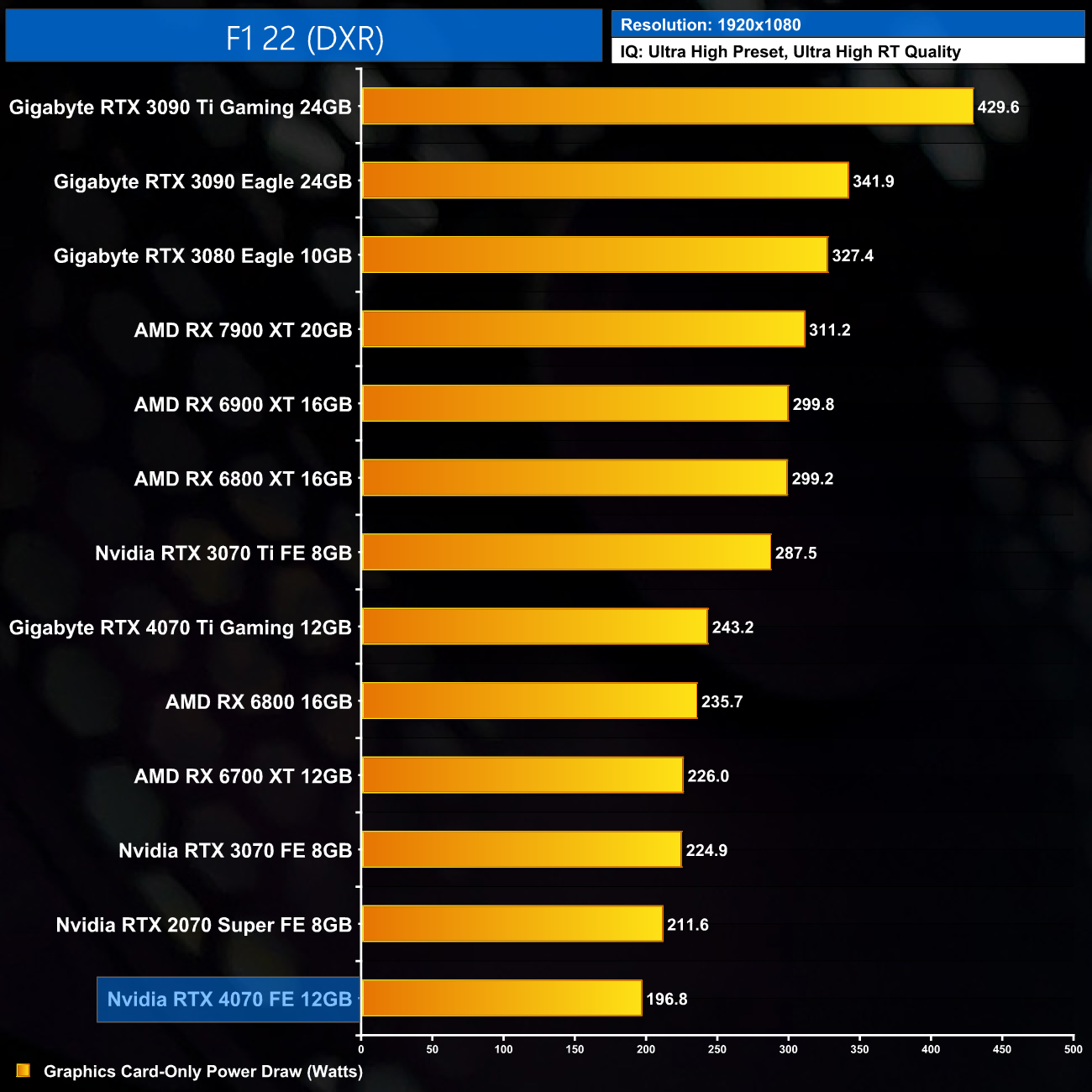 It's not much different at 1440p with ray tracing engaged either, with the 4070 now averaging 197.6W.