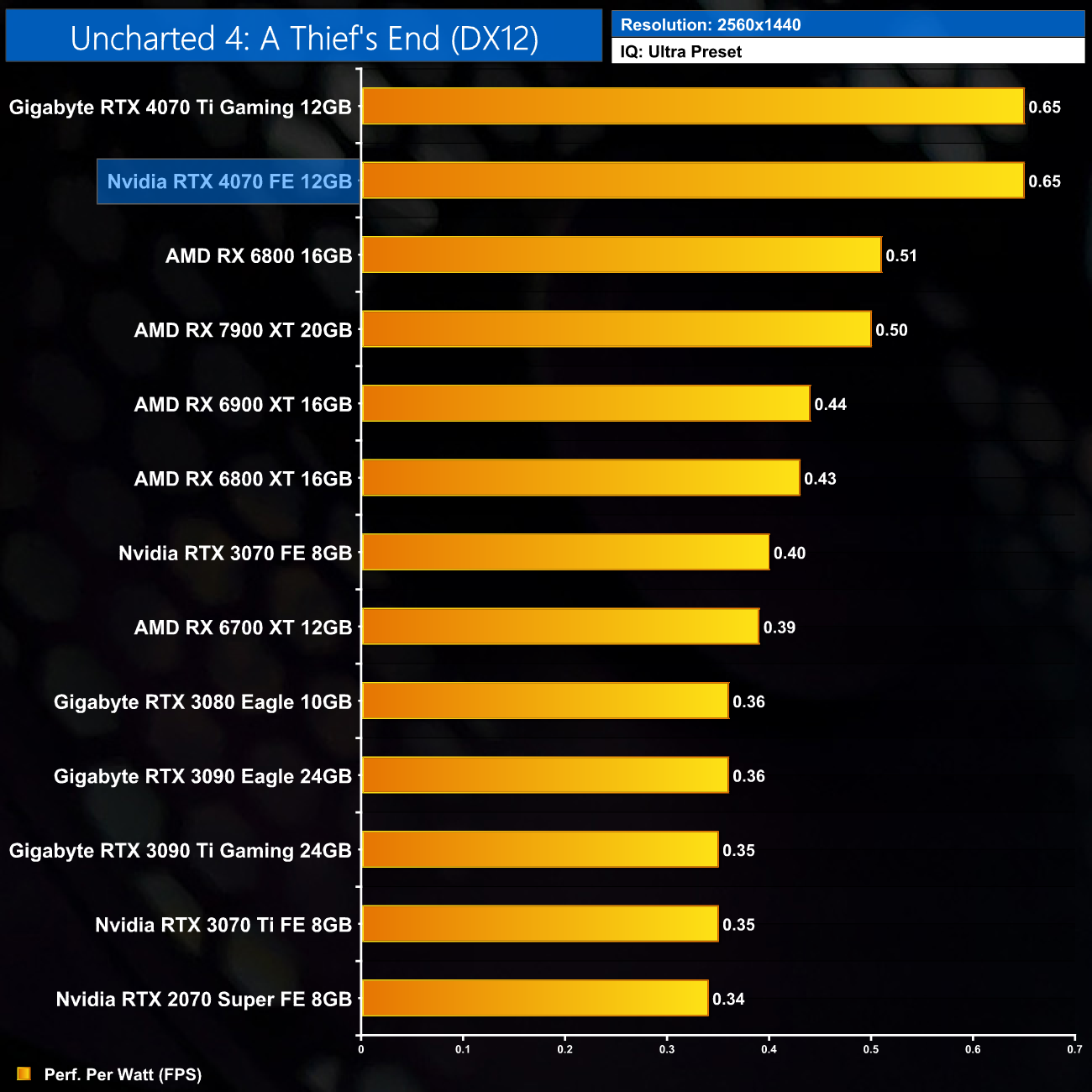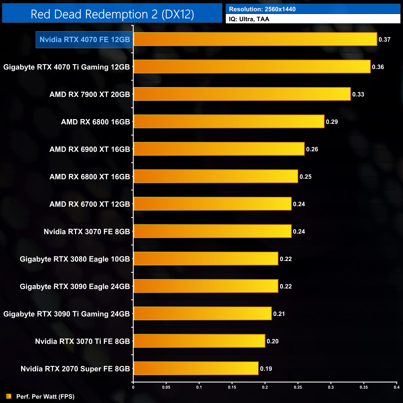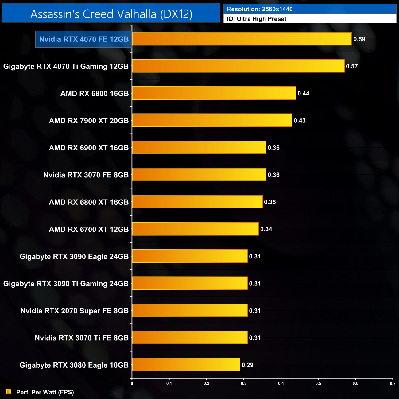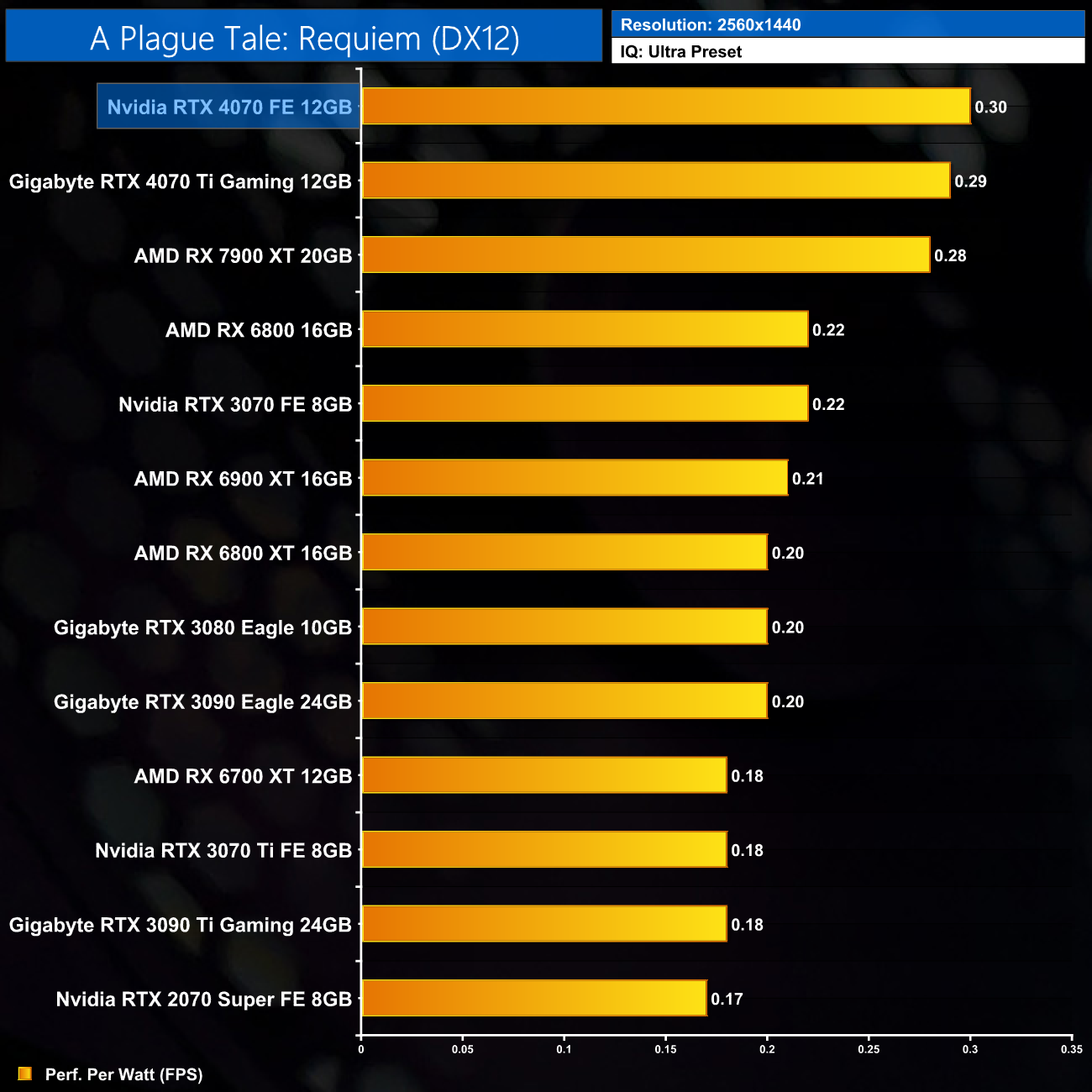 At 1440p, the 4070 remains a highly efficient GPU, now just about edging ahead of the RTX 4070 Ti. It's still 67% more efficient than the RTX 3080, while offering a 17% improvement in performance per Watt versus the RX 7900 XT.