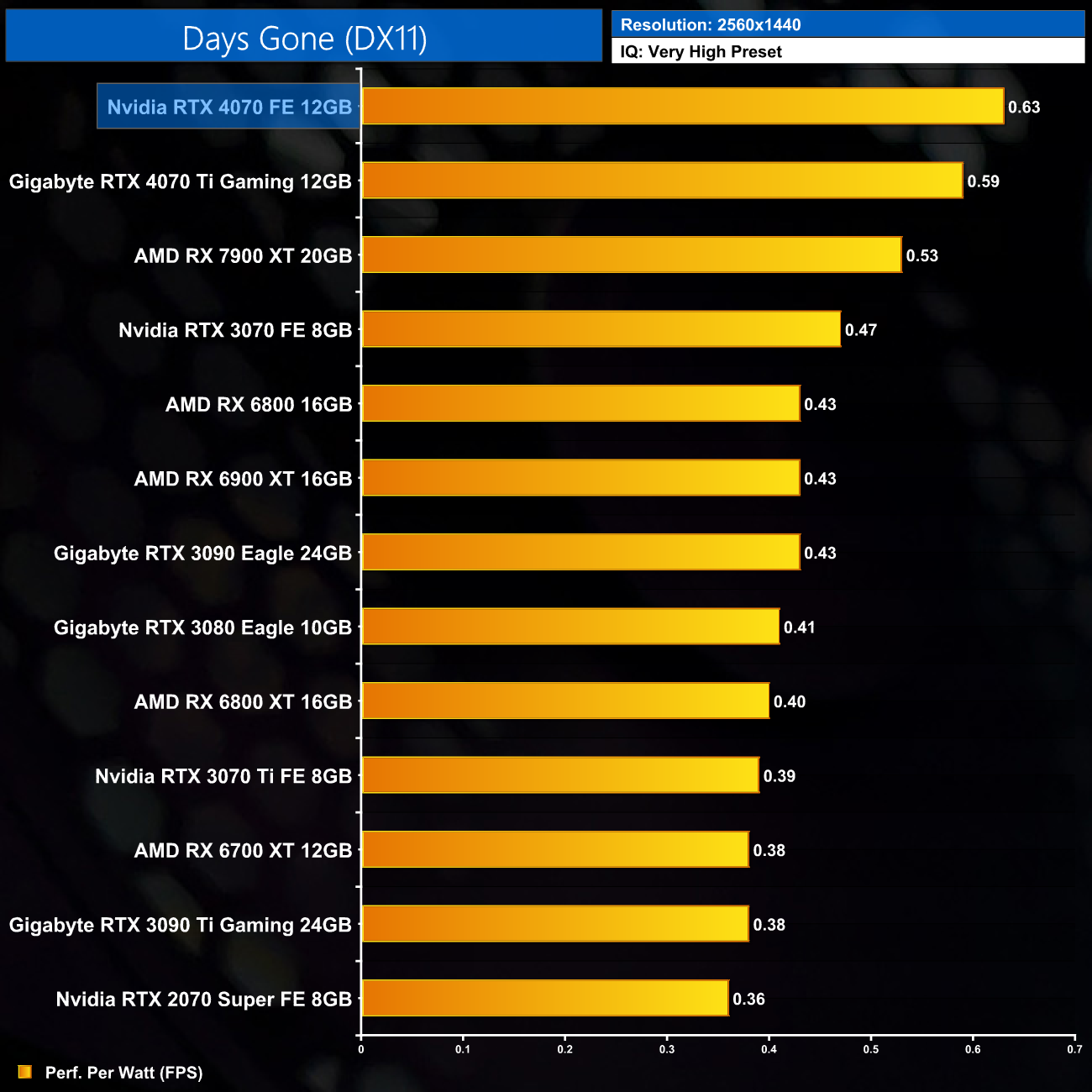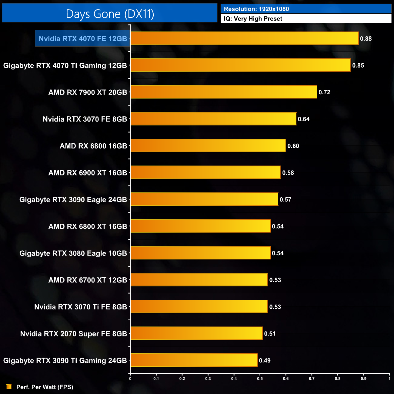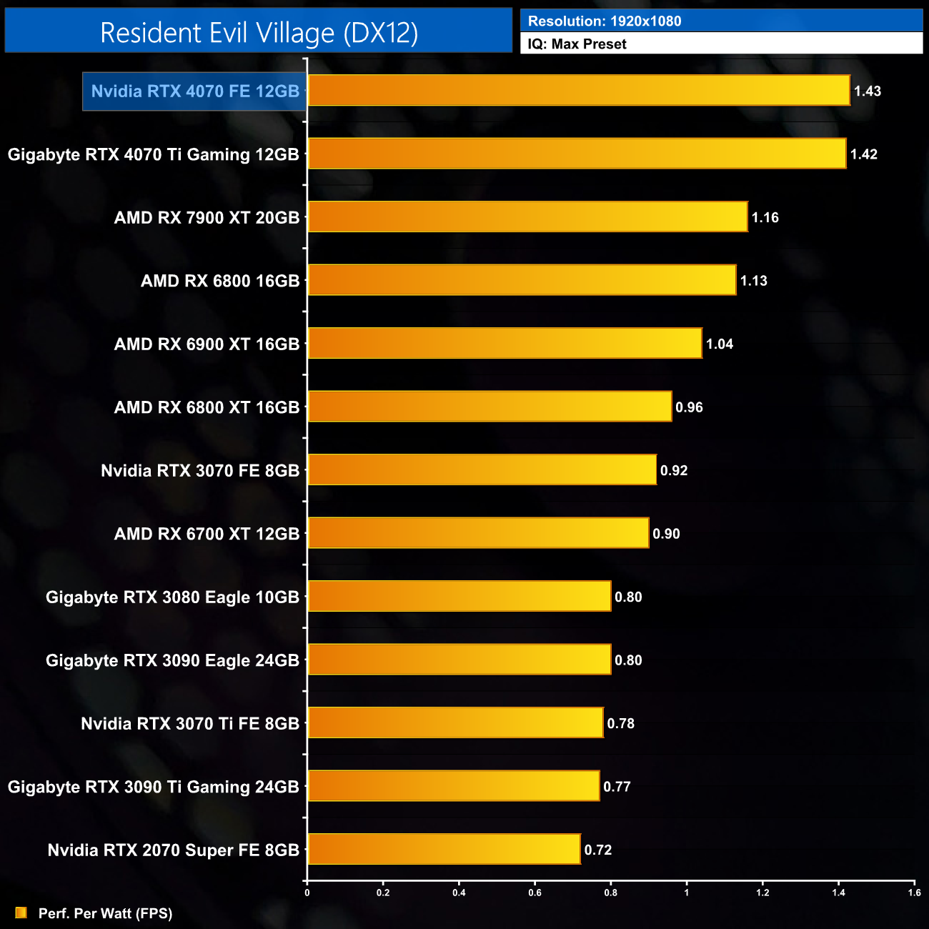 At 1440p, the 4070 remains a highly efficient GPU, now just about edging ahead of the RTX 4070 Ti. It's still 67% more efficient than the RTX 3080, while offering a 17% improvement in performance per Watt versus the RX 7900 XT.