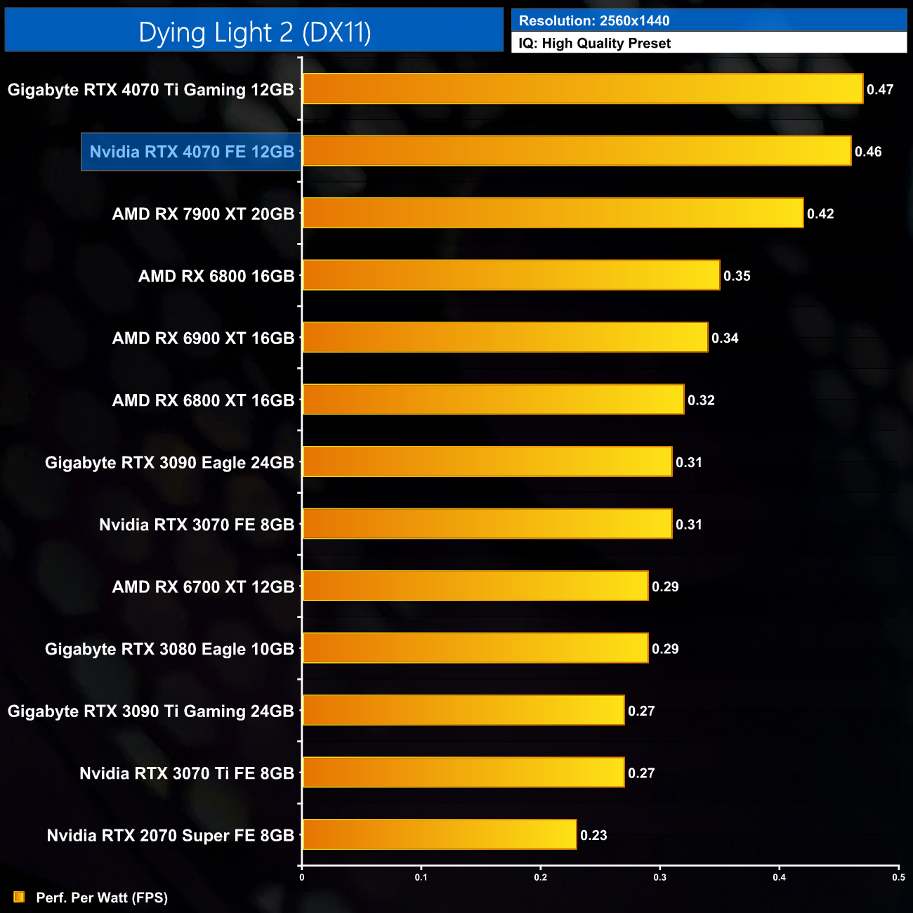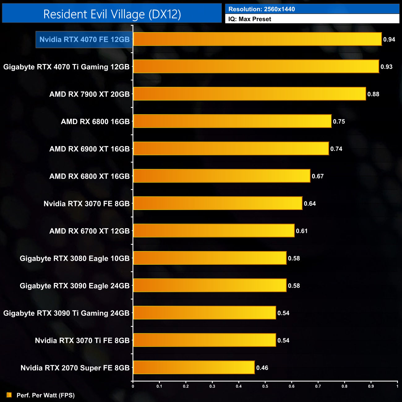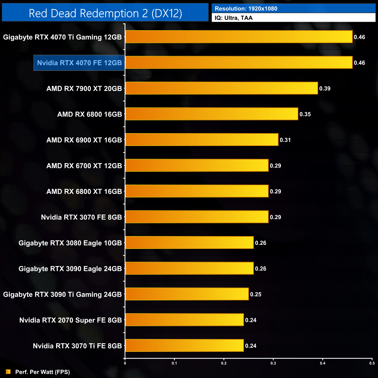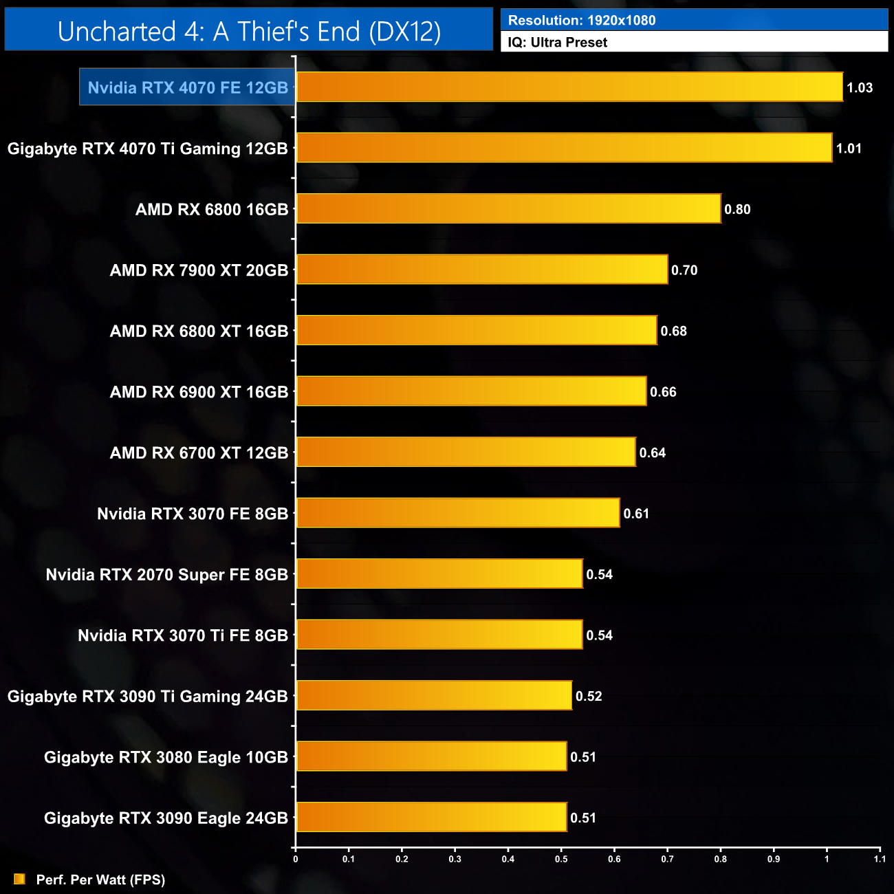 At 1440p, the 4070 remains a highly efficient GPU, now just about edging ahead of the RTX 4070 Ti. It's still 67% more efficient than the RTX 3080, while offering a 17% improvement in performance per Watt versus the RX 7900 XT.