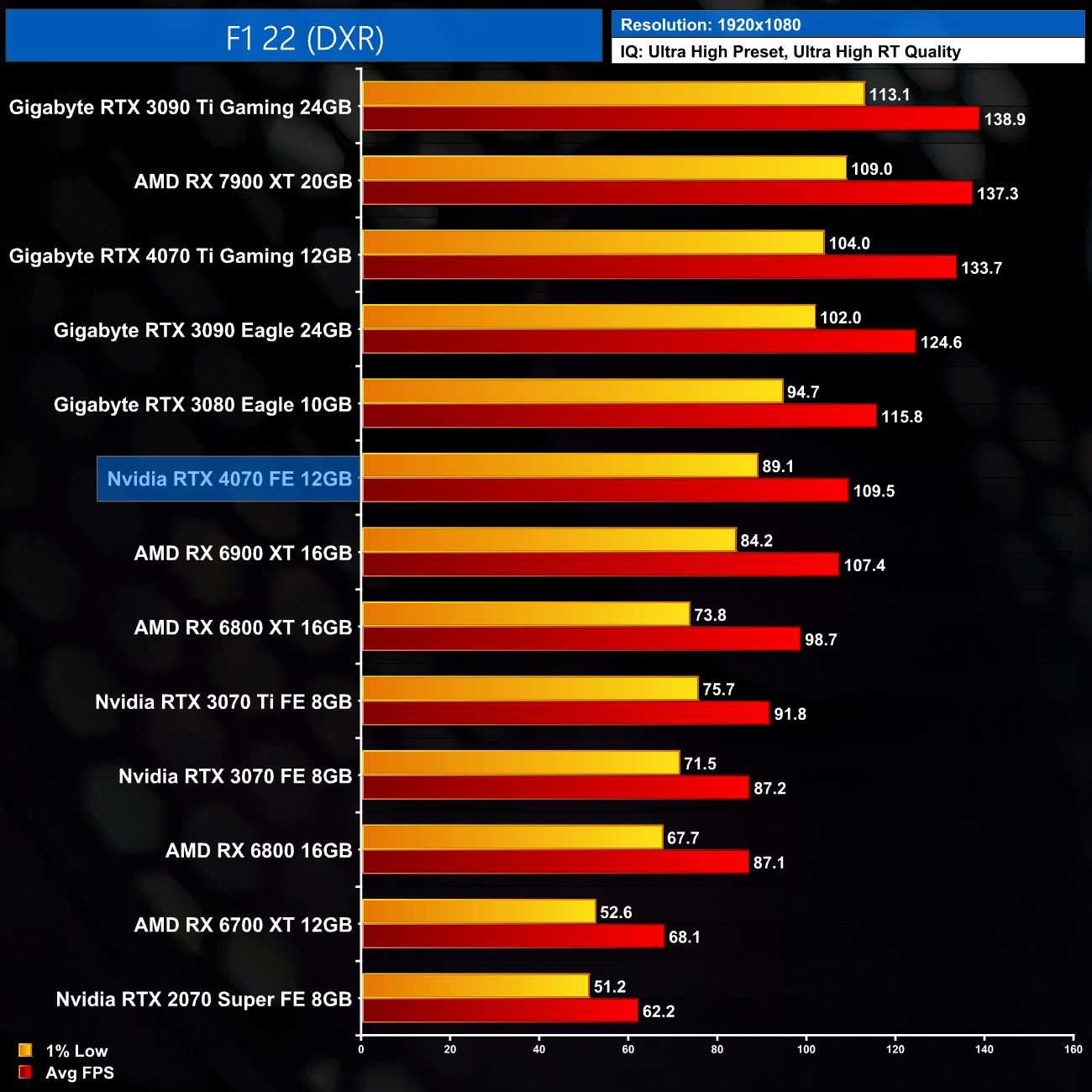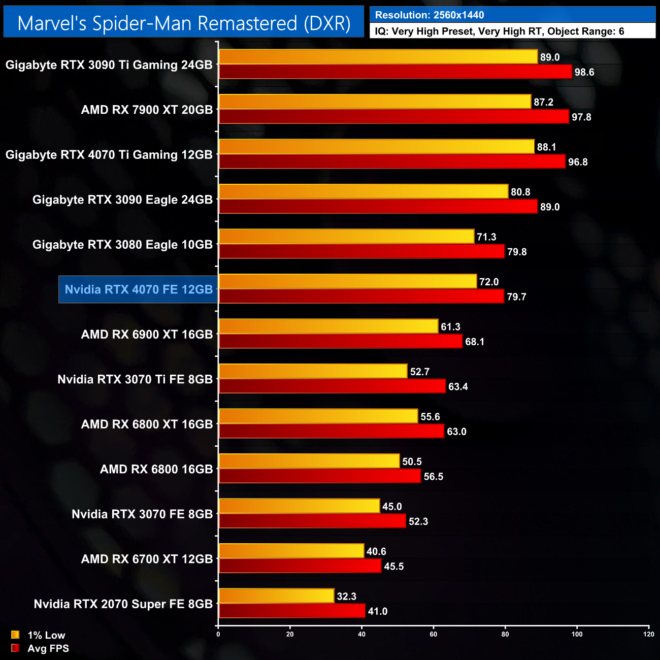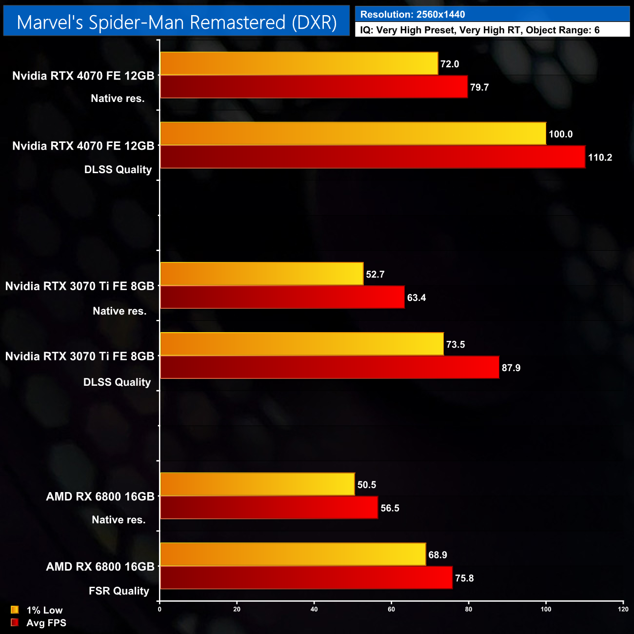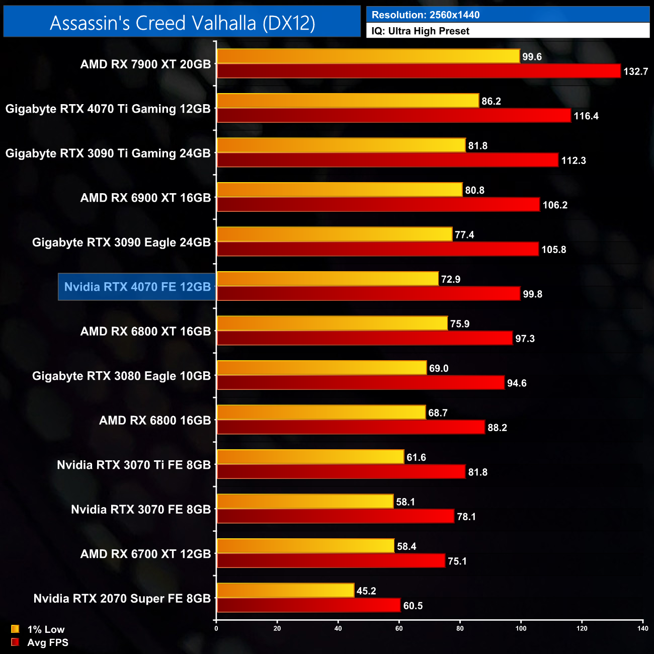 Even at 1440p we see a frame rate north of 87FPS, with the 4070 now just 5% slower than the 7900 XT – although its 1% lows aren't quite so smooth. Versus the 3070 Ti, we're looking at a 22% margin of victory for the Ada GPU.