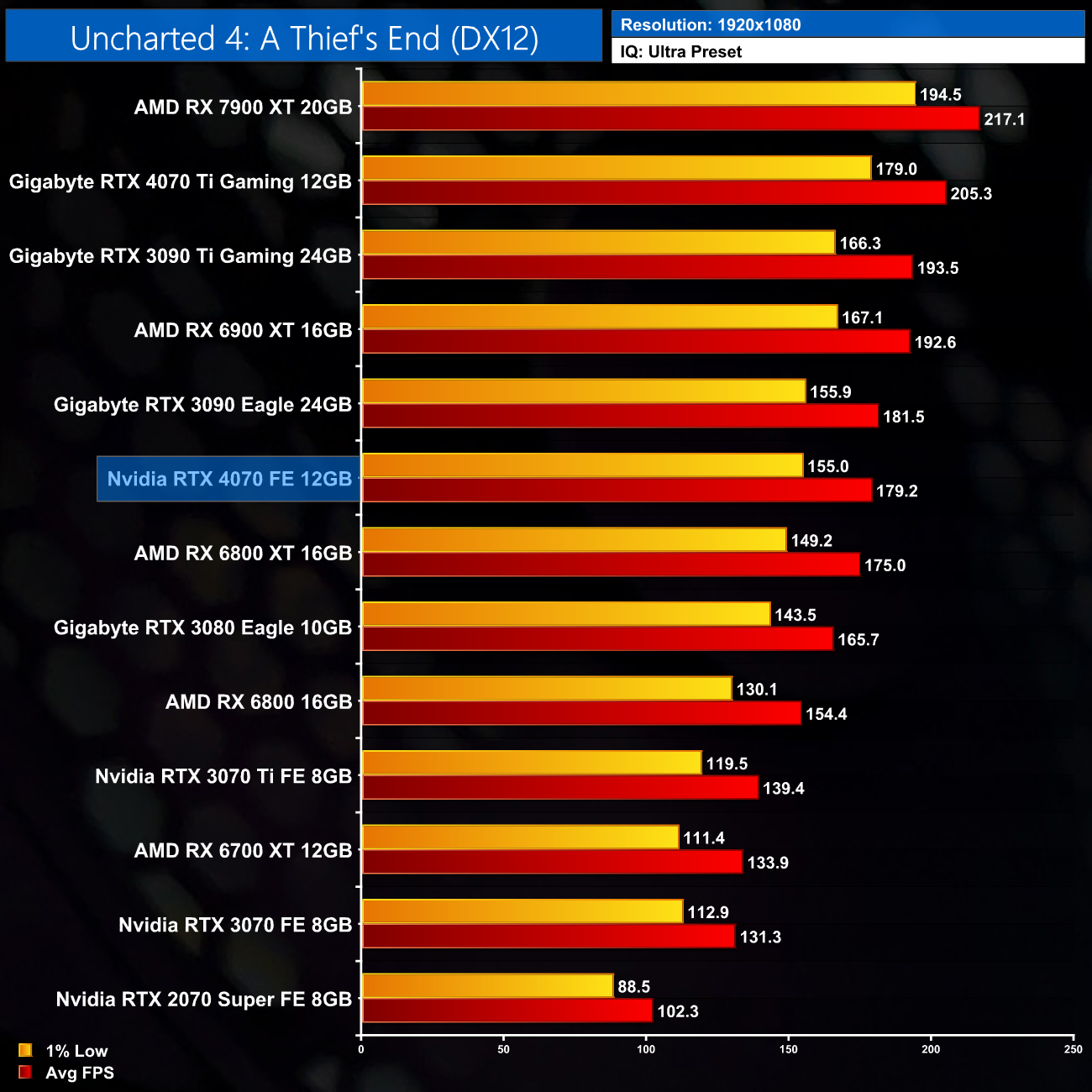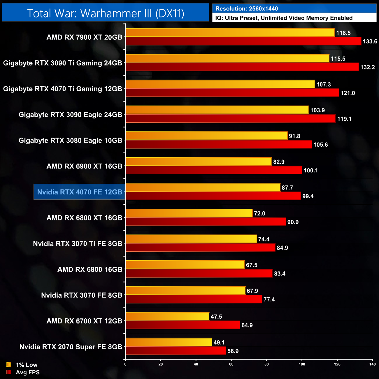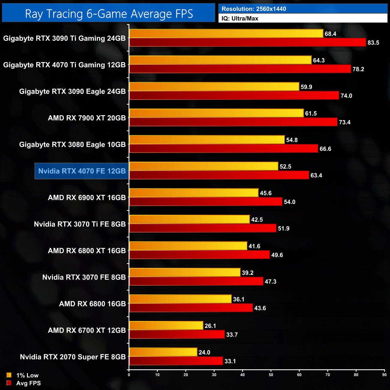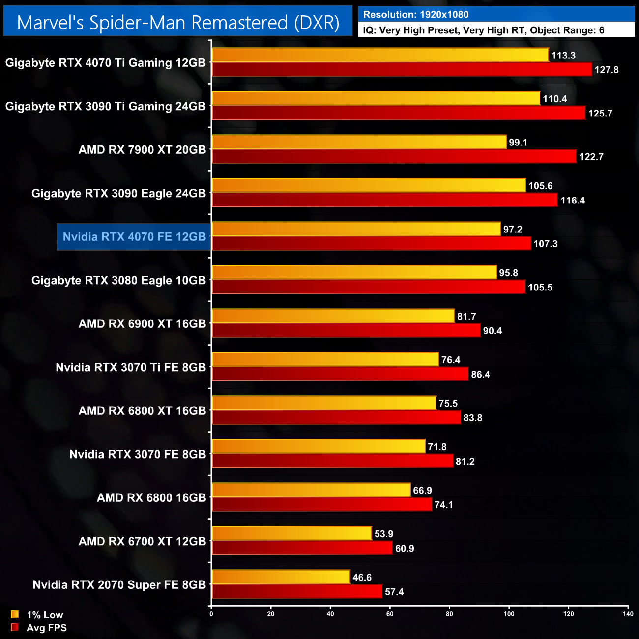 Even at 1440p we see a frame rate north of 87FPS, with the 4070 now just 5% slower than the 7900 XT – although its 1% lows aren't quite so smooth. Versus the 3070 Ti, we're looking at a 22% margin of victory for the Ada GPU.