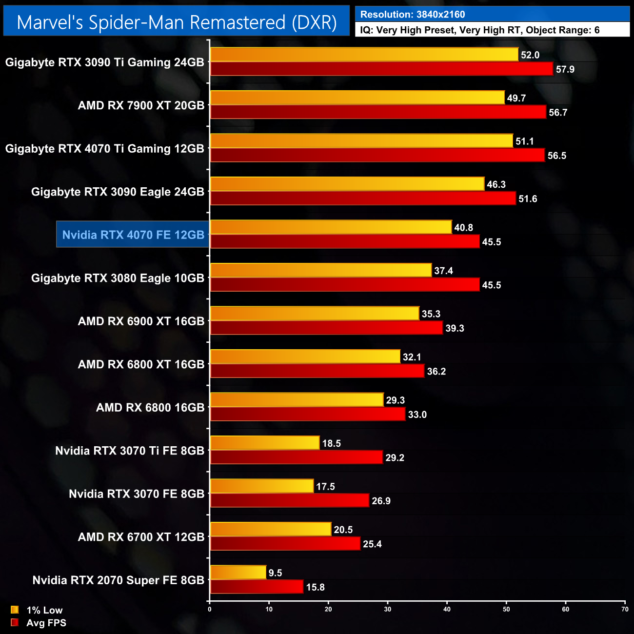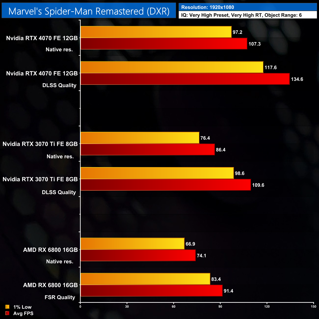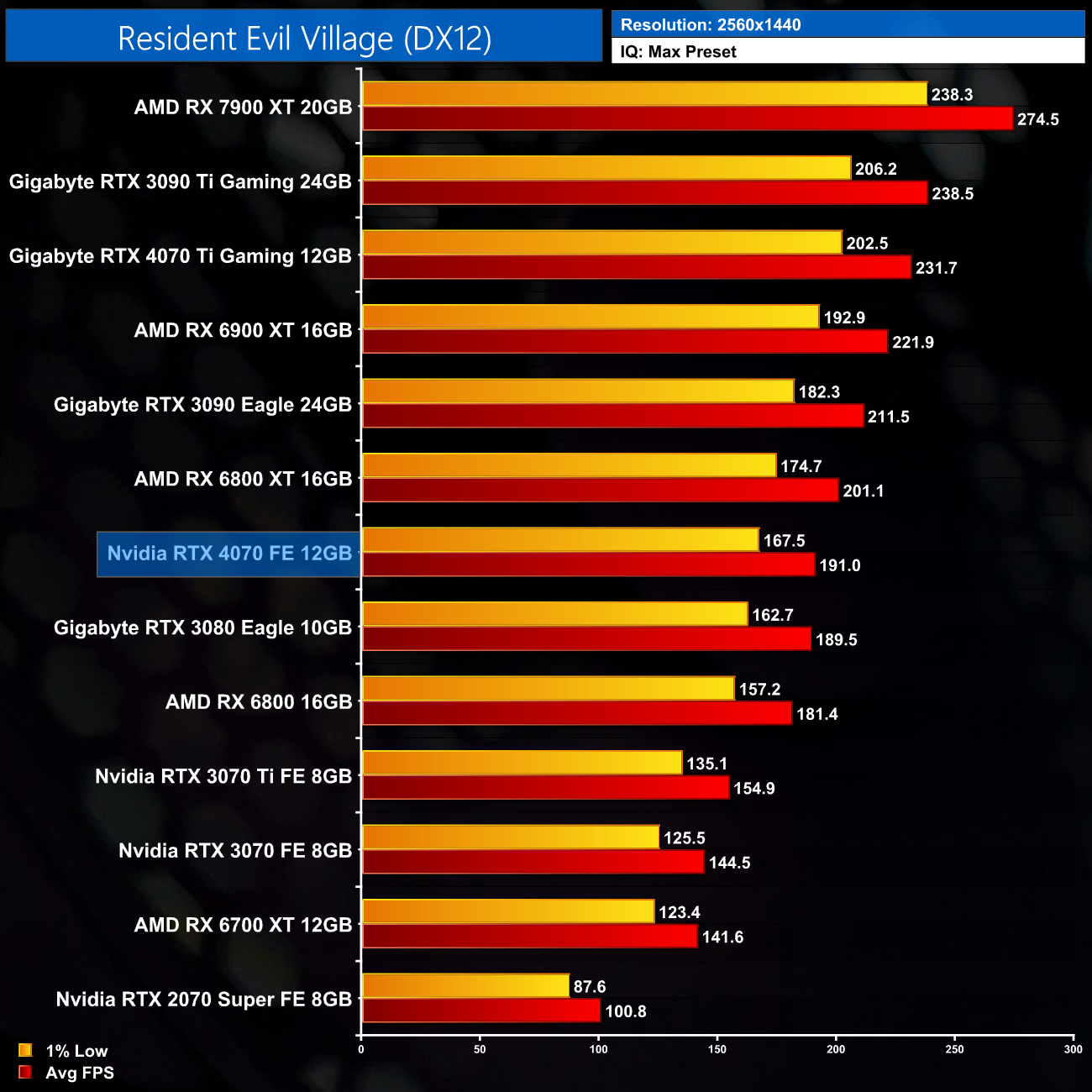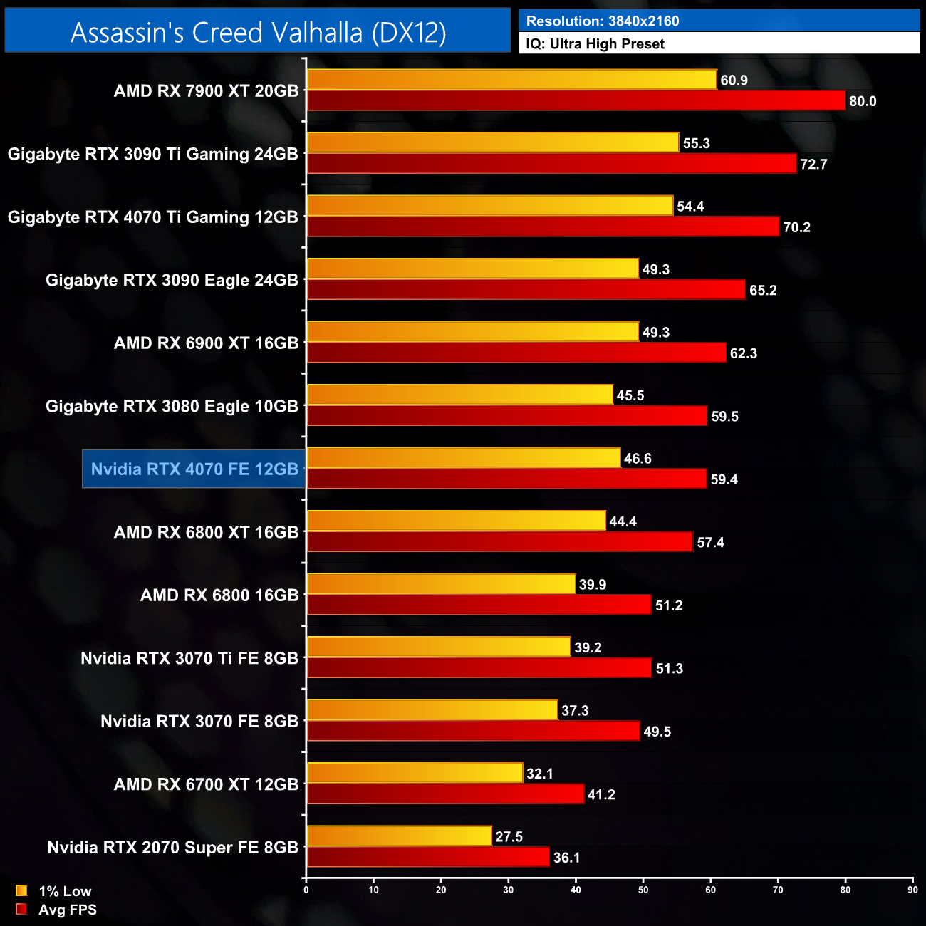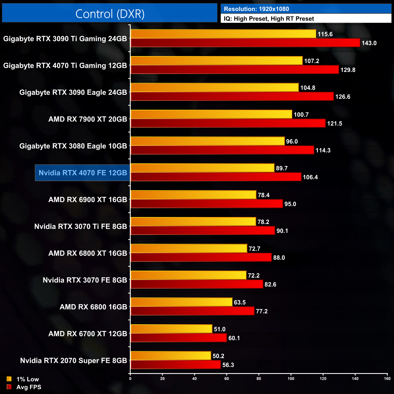 Even at 1440p we see a frame rate north of 87FPS, with the 4070 now just 5% slower than the 7900 XT – although its 1% lows aren't quite so smooth. Versus the 3070 Ti, we're looking at a 22% margin of victory for the Ada GPU.