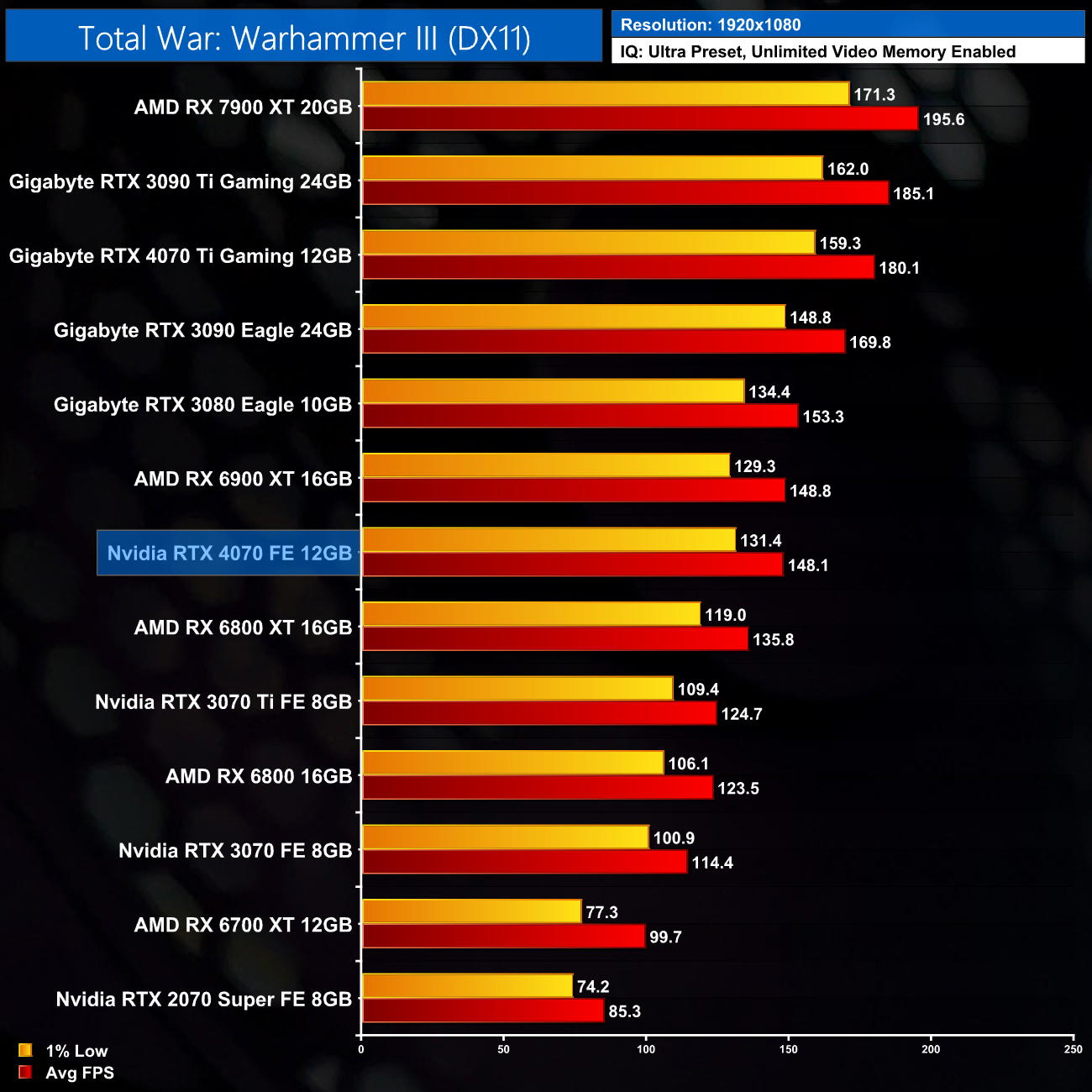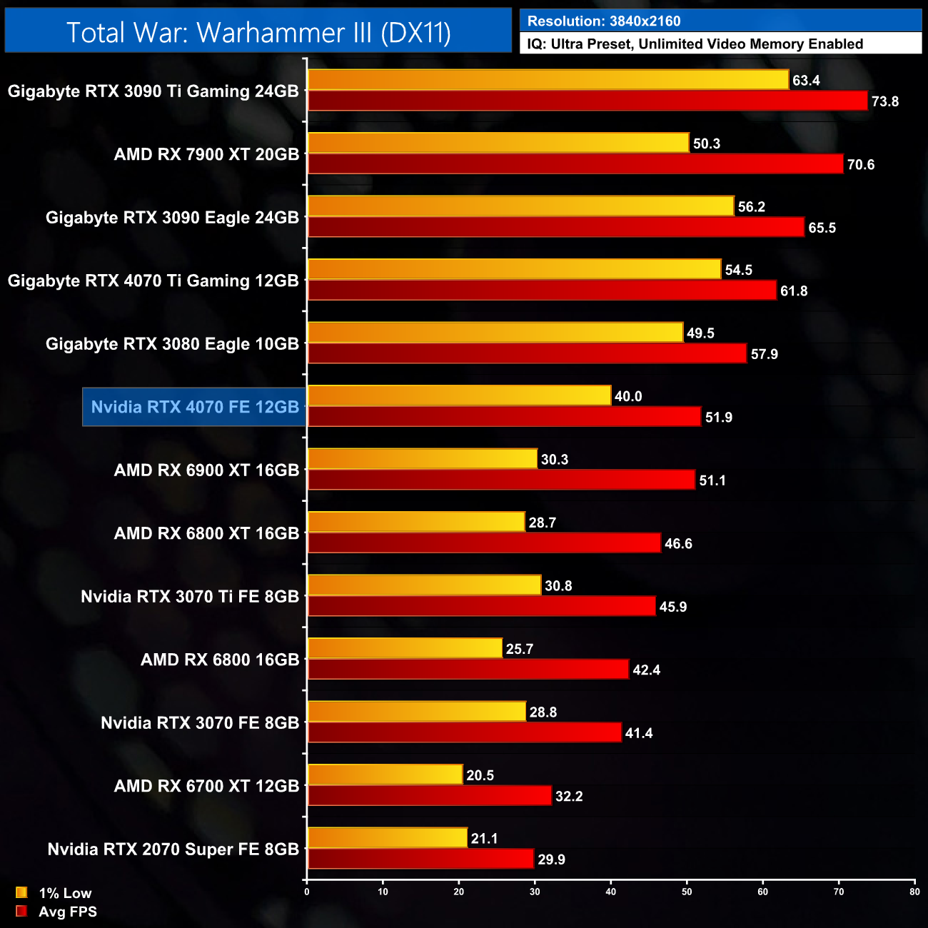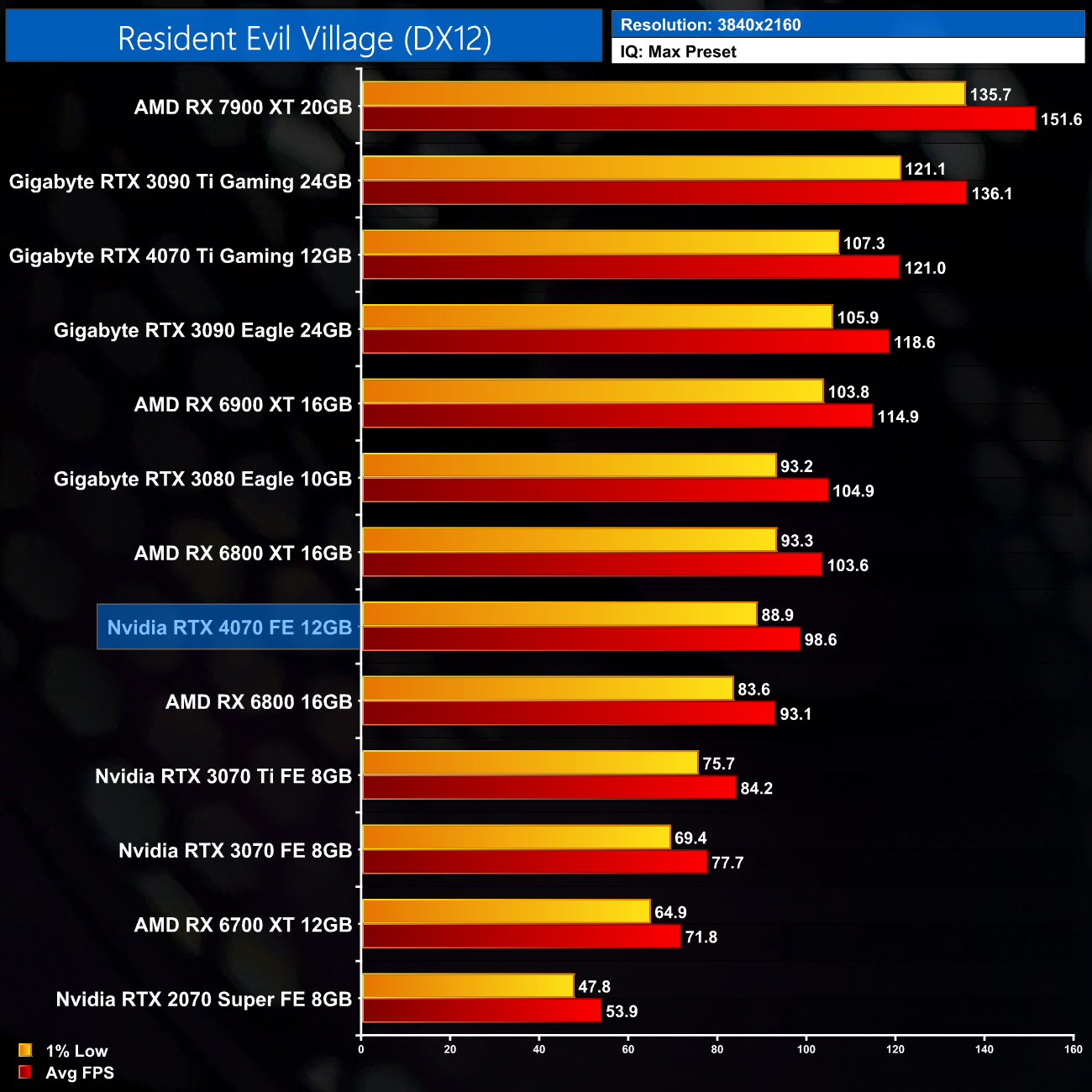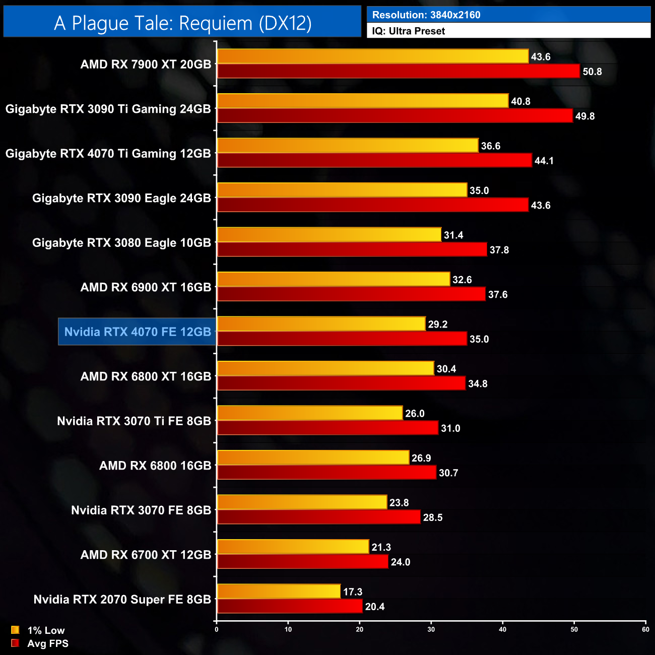 Even at 1440p we see a frame rate north of 87FPS, with the 4070 now just 5% slower than the 7900 XT – although its 1% lows aren't quite so smooth. Versus the 3070 Ti, we're looking at a 22% margin of victory for the Ada GPU.