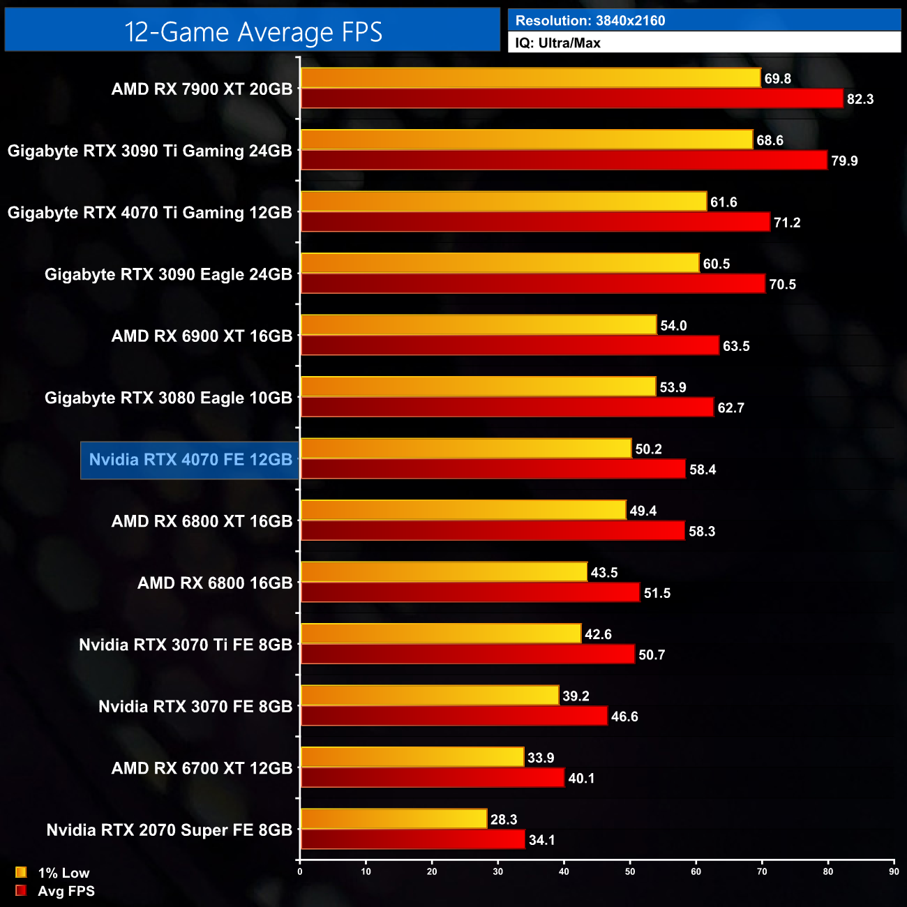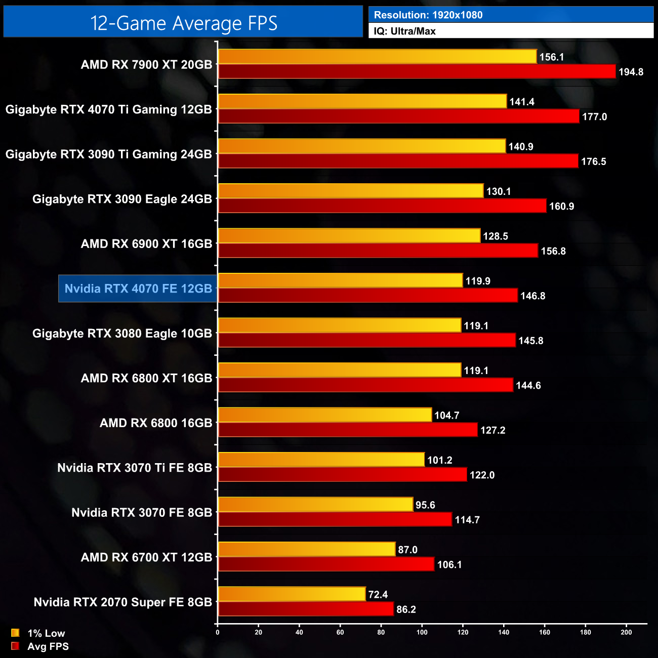 The good news is, despite coming in 24% cheaper than the 4070 Ti, the RTX 4070 is only 18% slower, so that means this is the best value Ada Lovelace GPU yet. Of course, there is more to the story than that however, but let's first summarise the overall gaming performance on offer.
