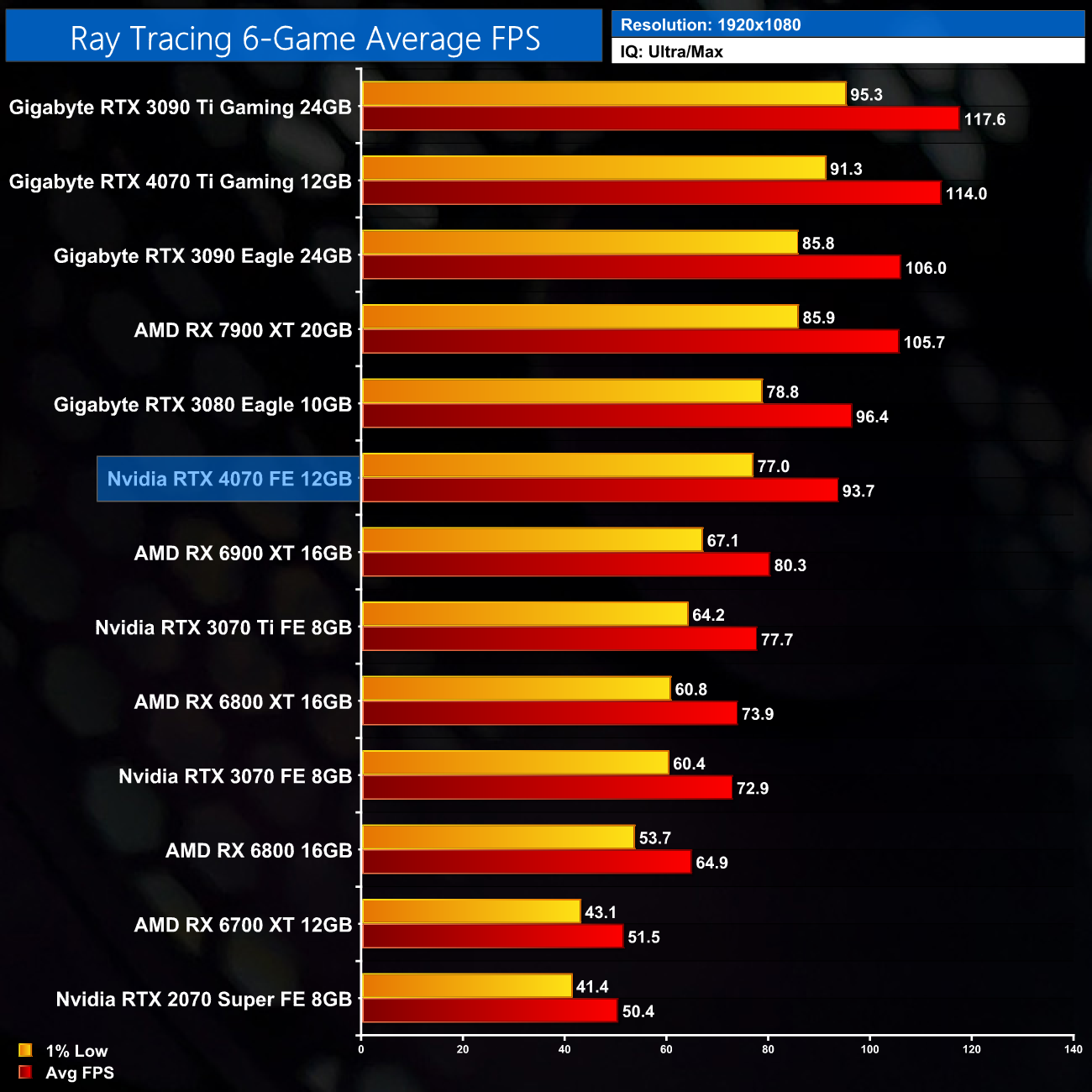 Over the 6 games with ray tracing that we benchmarked, performance of the RTX 4070 scales closely in line with the RTX 3080, with just a 3% margin between the two cards at 1080p. The 4070 is once more 21% faster than the 3070 Ti, but it's faster than the RX 6900 XT by 17%, which goes to show Nvidia still has a clear lead in terms of ray tracing performance.