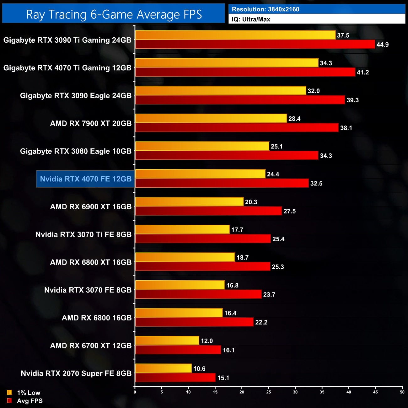 Likewise, using current retail pricing, there's even smaller differences between the 4070 and 30-series, many of which can be found under MSRP – including the 3070 Ti. The 4070 is still the best value when it comes to ray tracing performance, just not by very much at all.