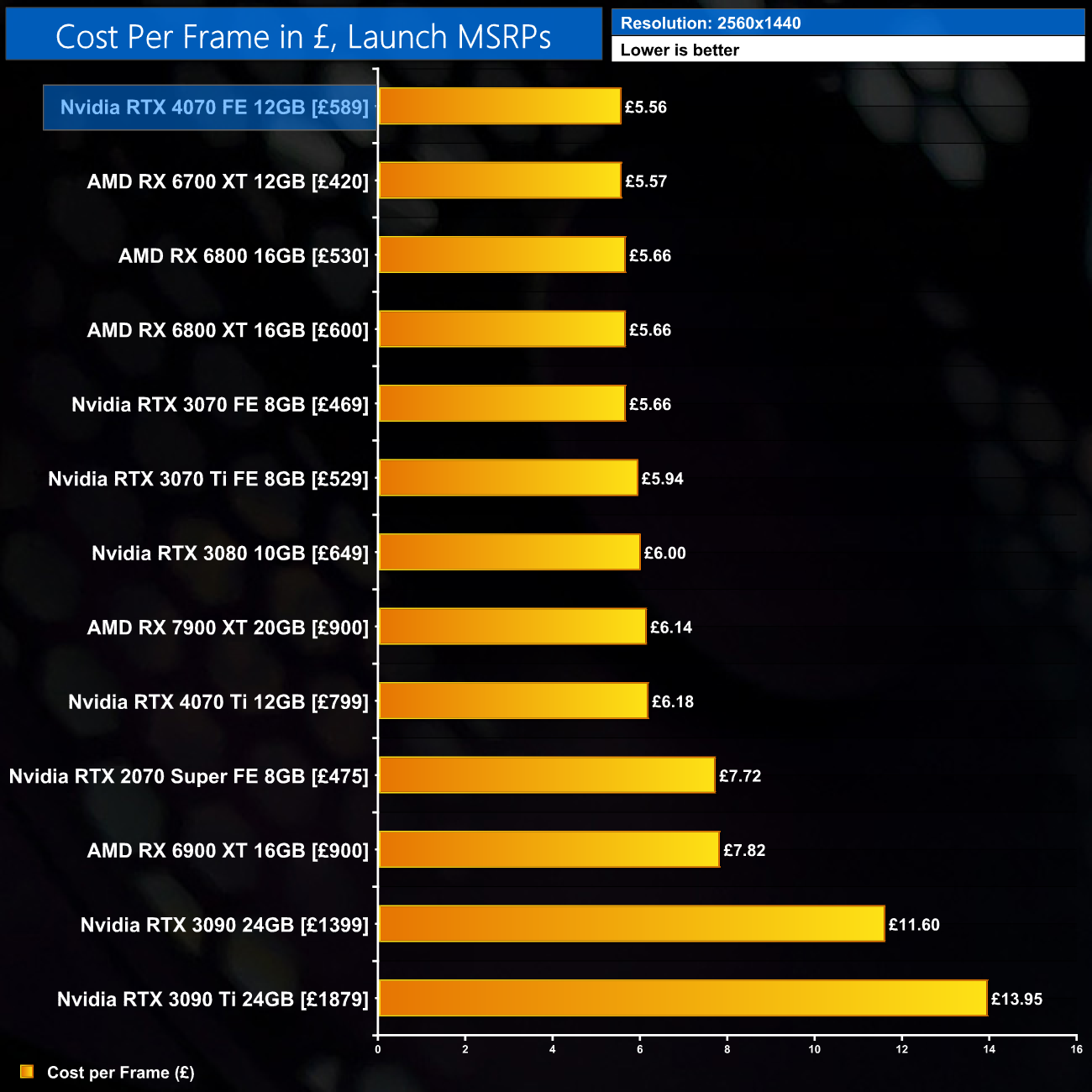 Then again, an extra 15-20% performance over the RTX 3070 Ti is hardly much to get excited about, in fact it is pretty lacklustre it has to be said. That's on top of an 11% price hike over the £529 MSRP for the 3070 Ti, negating a lot of that performance improvement. Cost per frame is just not moving forward from the previous generation, in fact several deals on RDNA 2 GPUs result in a better cost per frame for the likes of the RX 6700 XT and RX 6800 XT than what we get from the RTX 4070, though admittedly RDNA 2's ray tracing performance is a fair bit behind the 4070.