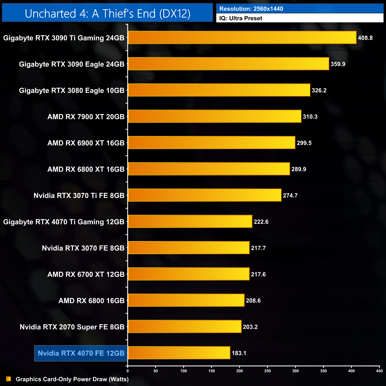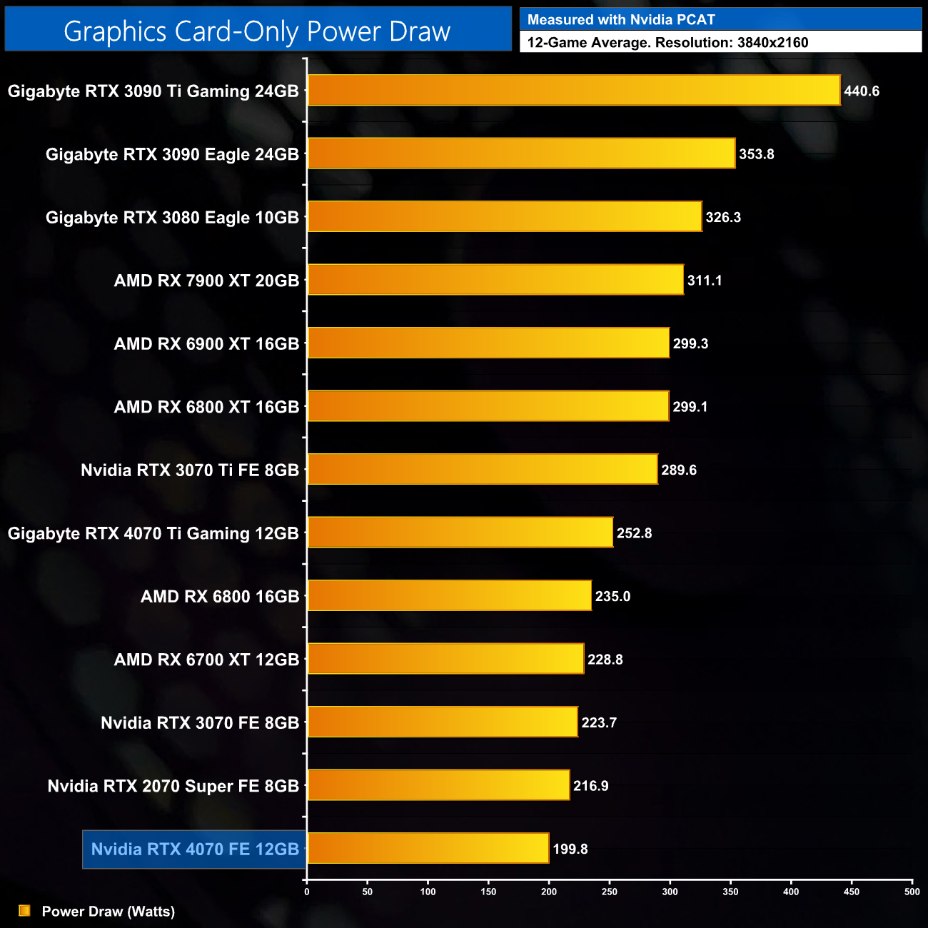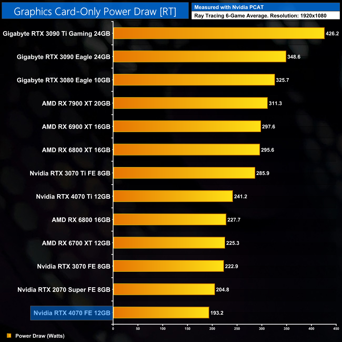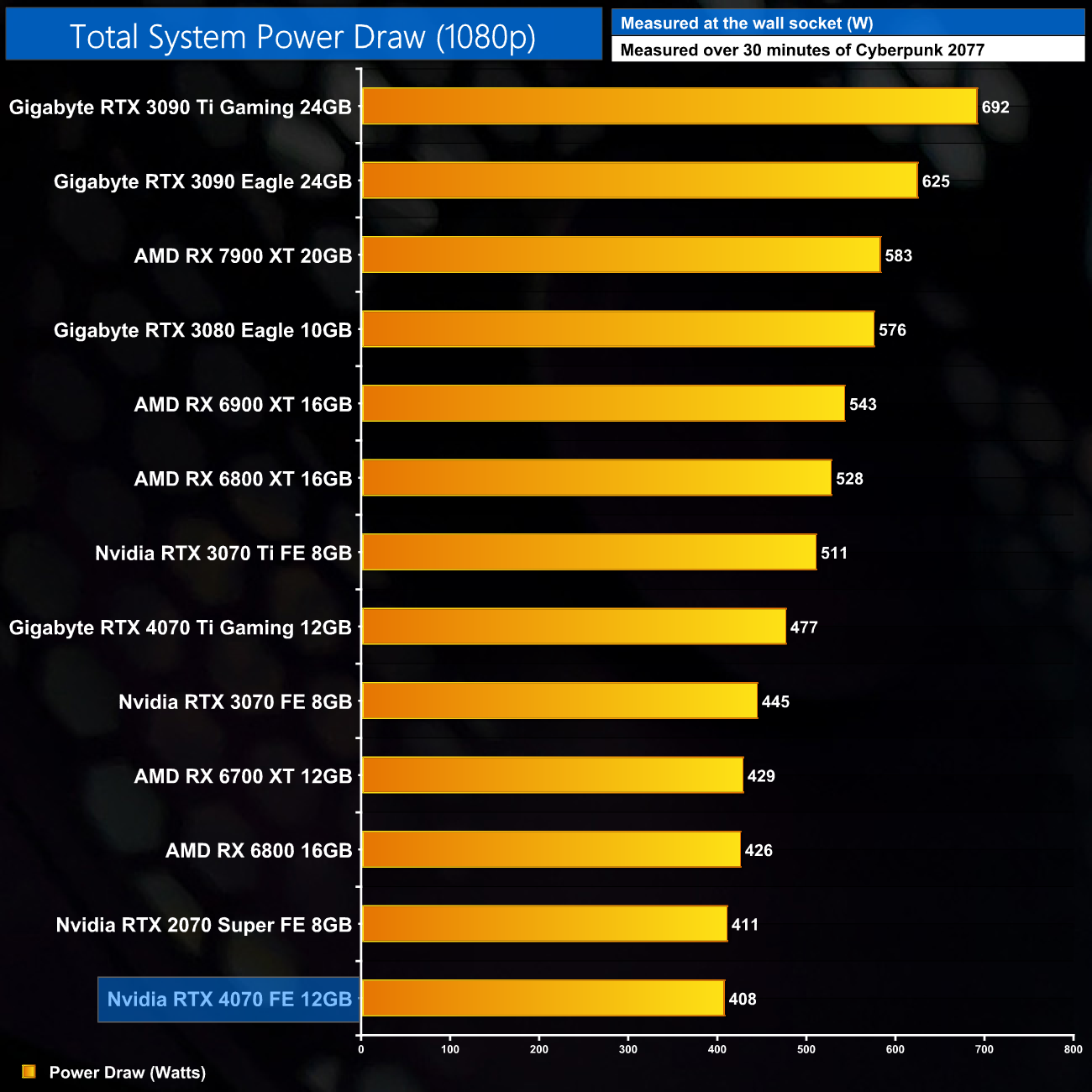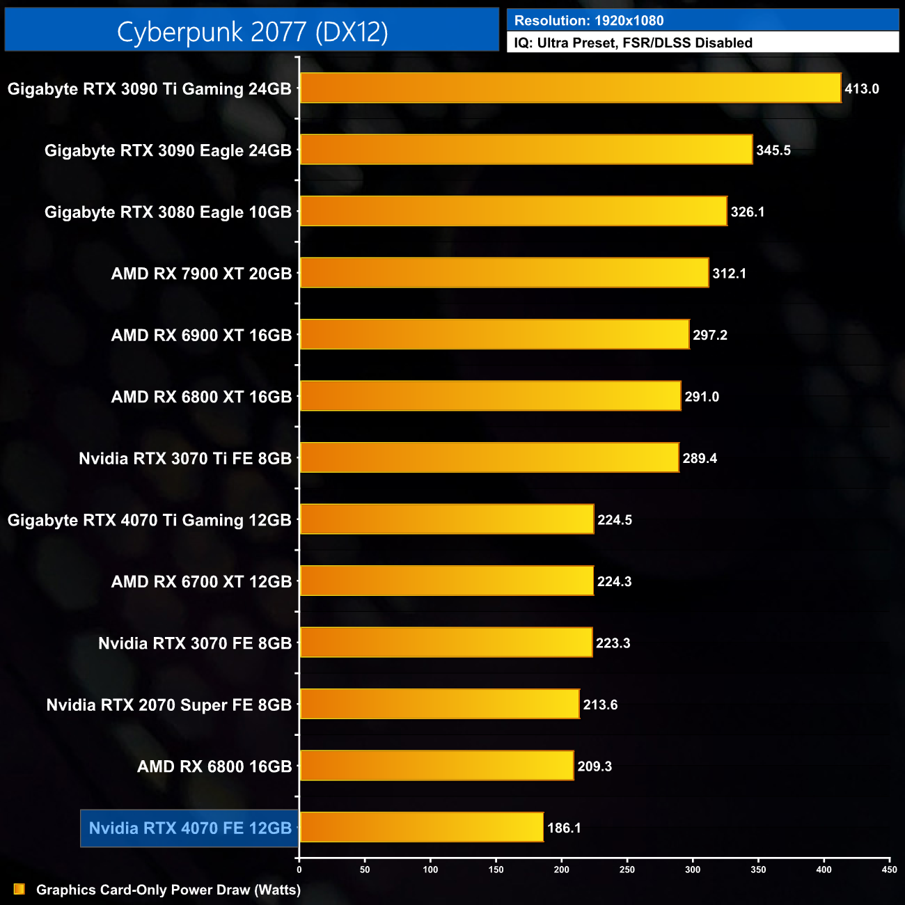 Power draw for the RTX 4070 is nice and low, averaging 186W at 1080p. That's almost a 100W reduction versus the RTX 3070 Ti, though it's still 35W lower than the RTX 3070 too.