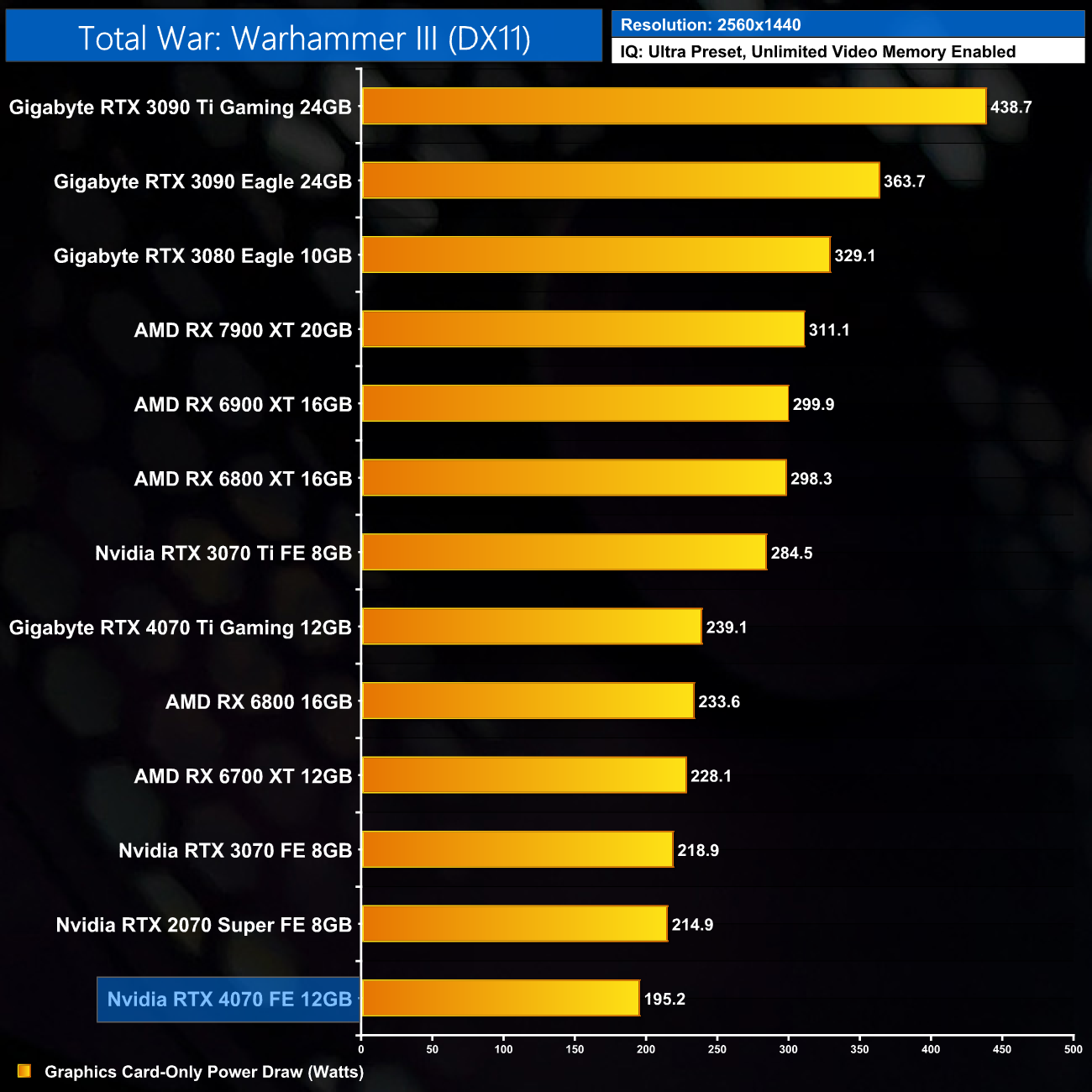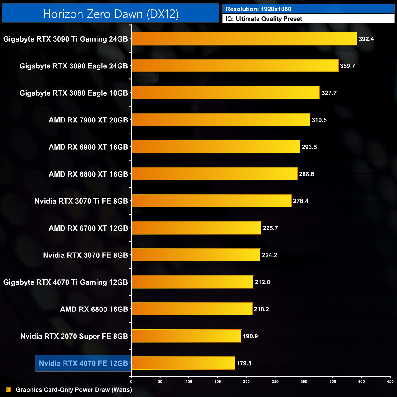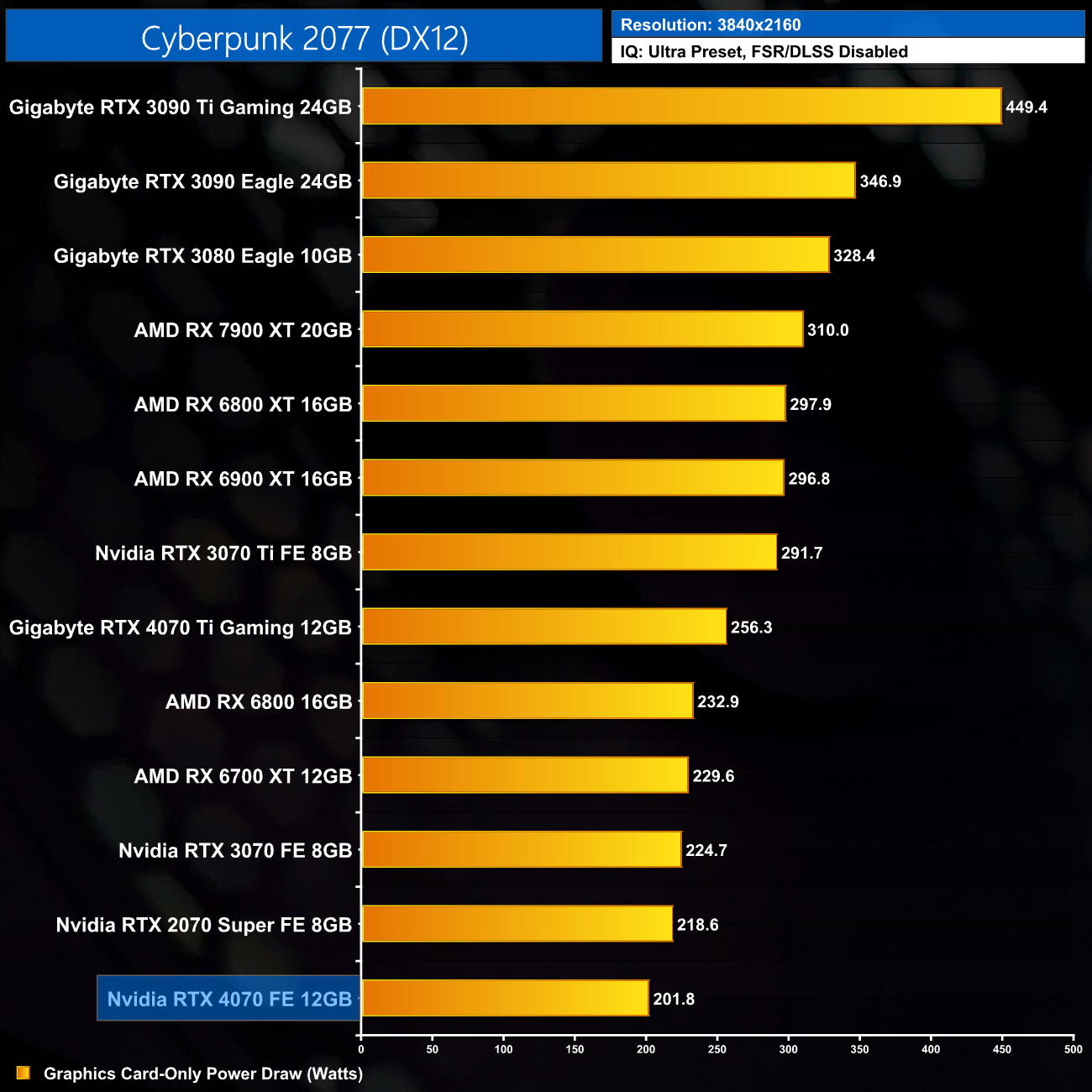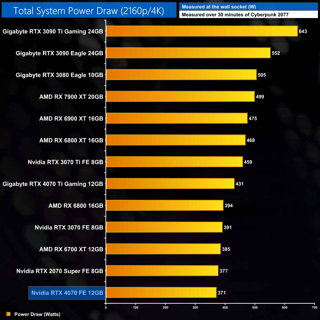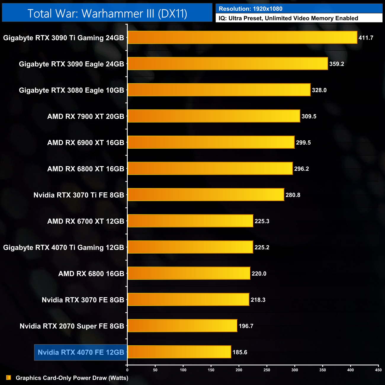 Power draw for the RTX 4070 is nice and low, averaging 186W at 1080p. That's almost a 100W reduction versus the RTX 3070 Ti, though it's still 35W lower than the RTX 3070 too.