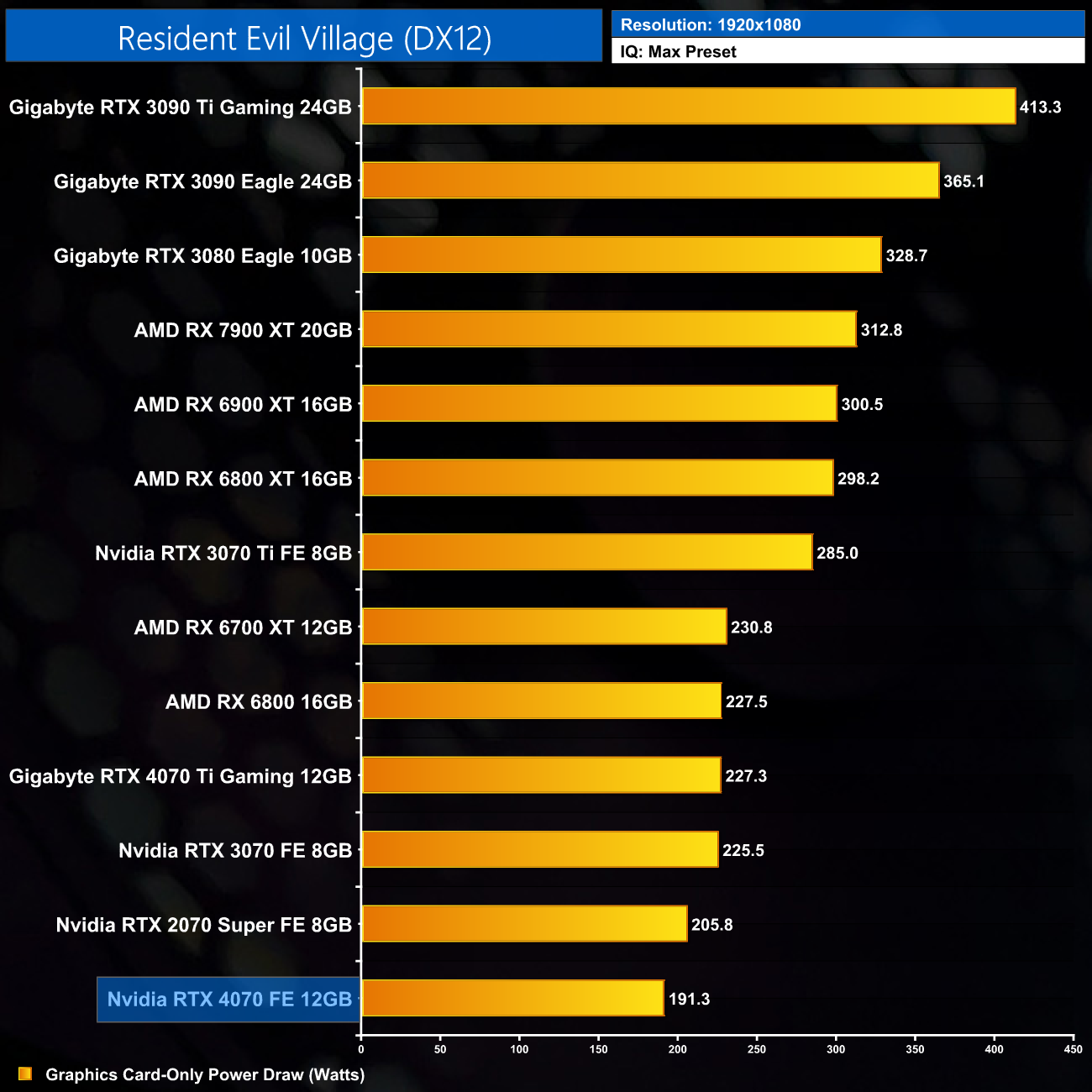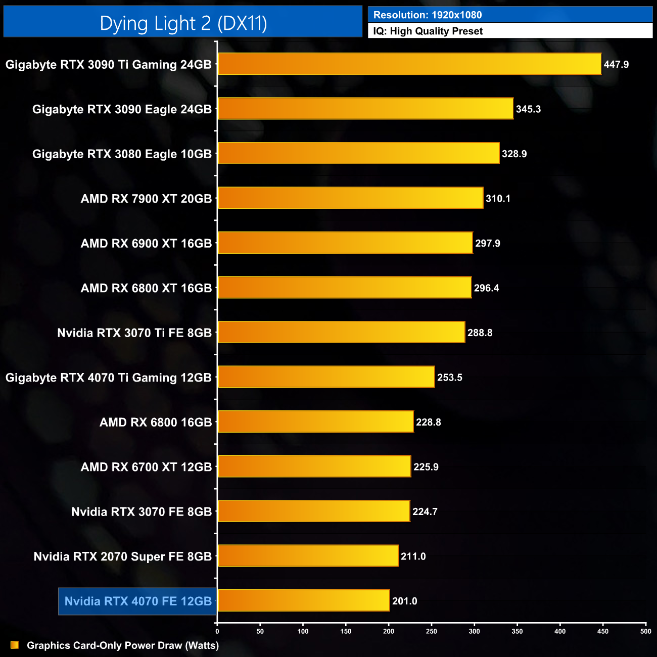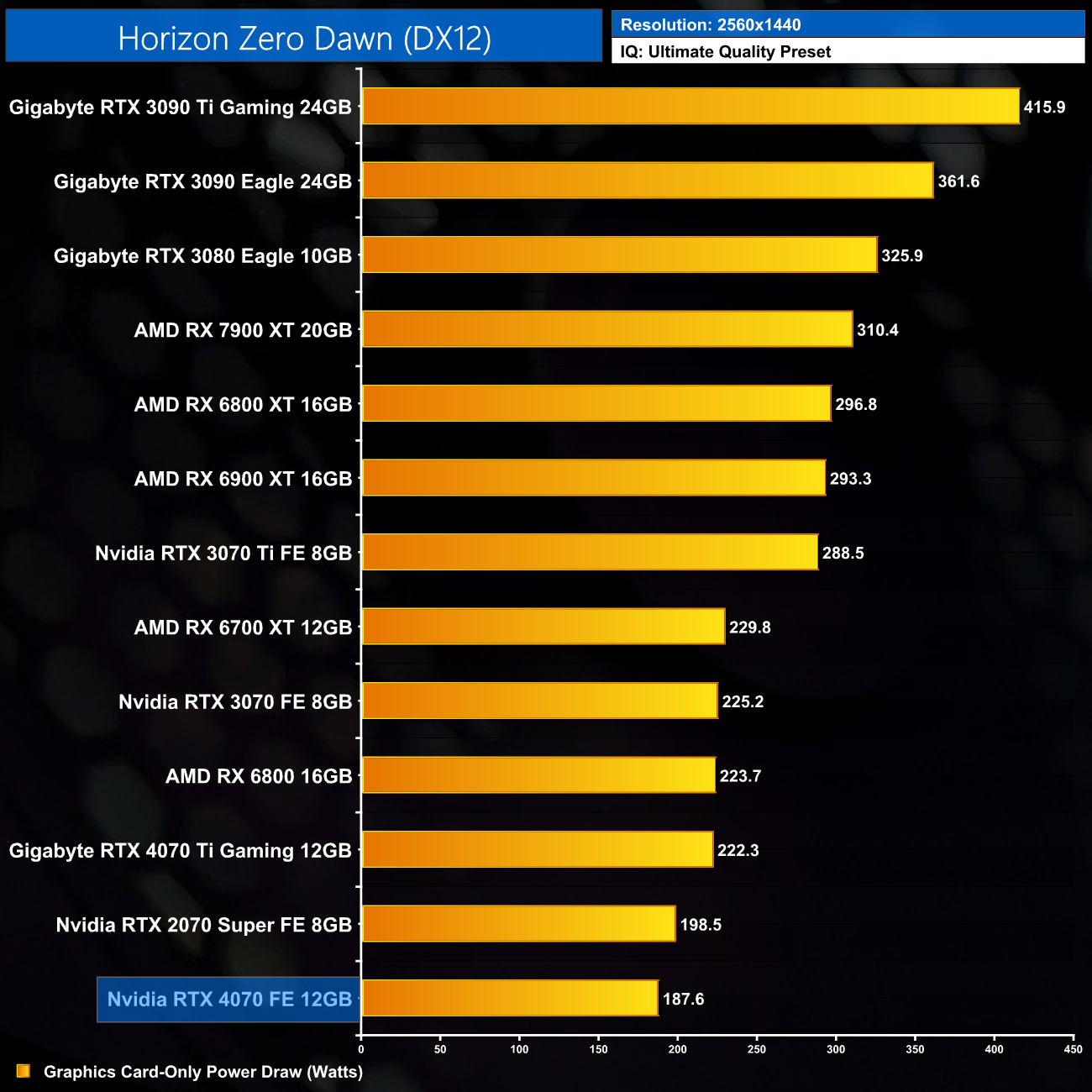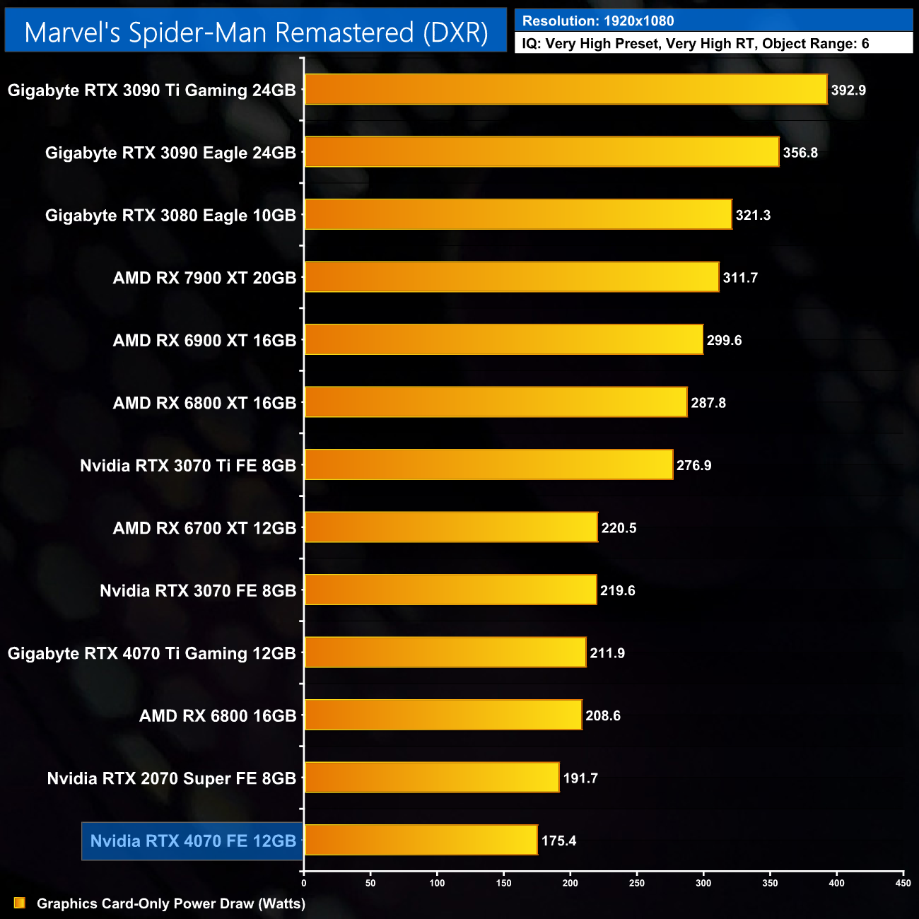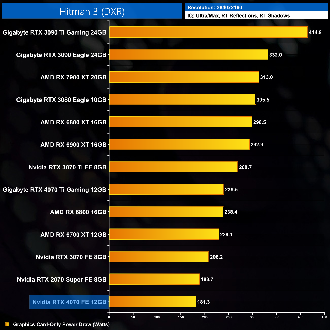 Power draw for the RTX 4070 is nice and low, averaging 186W at 1080p. That's almost a 100W reduction versus the RTX 3070 Ti, though it's still 35W lower than the RTX 3070 too.