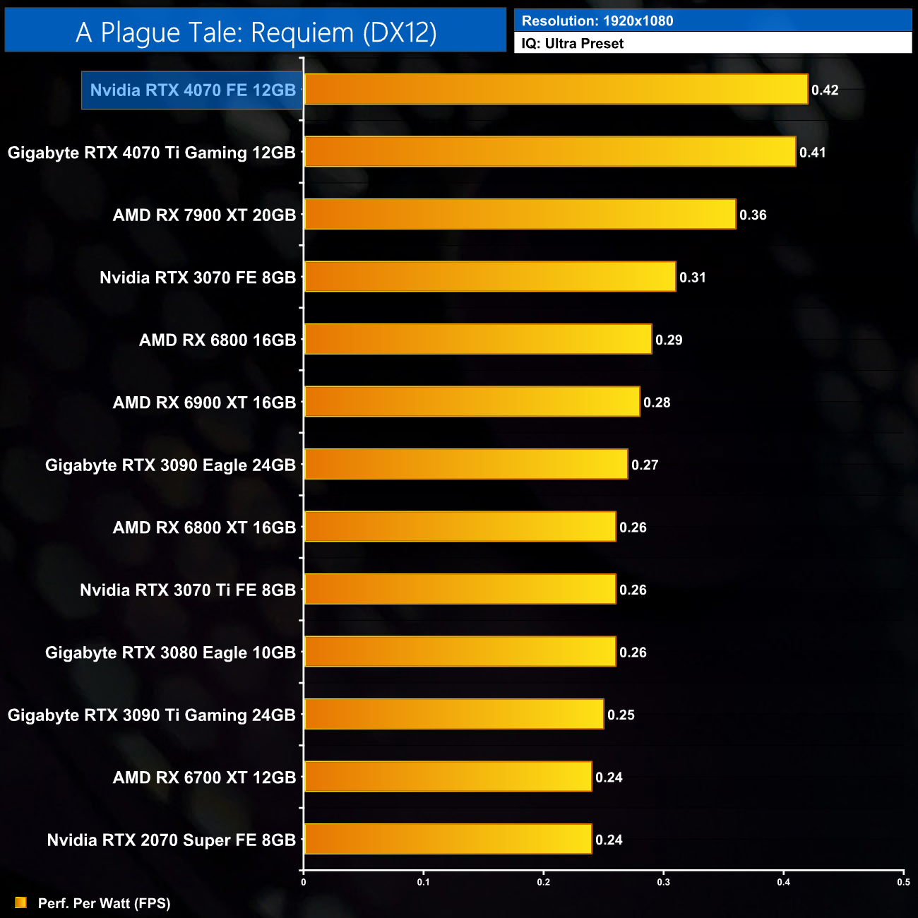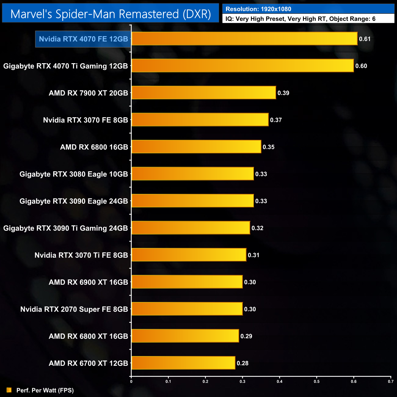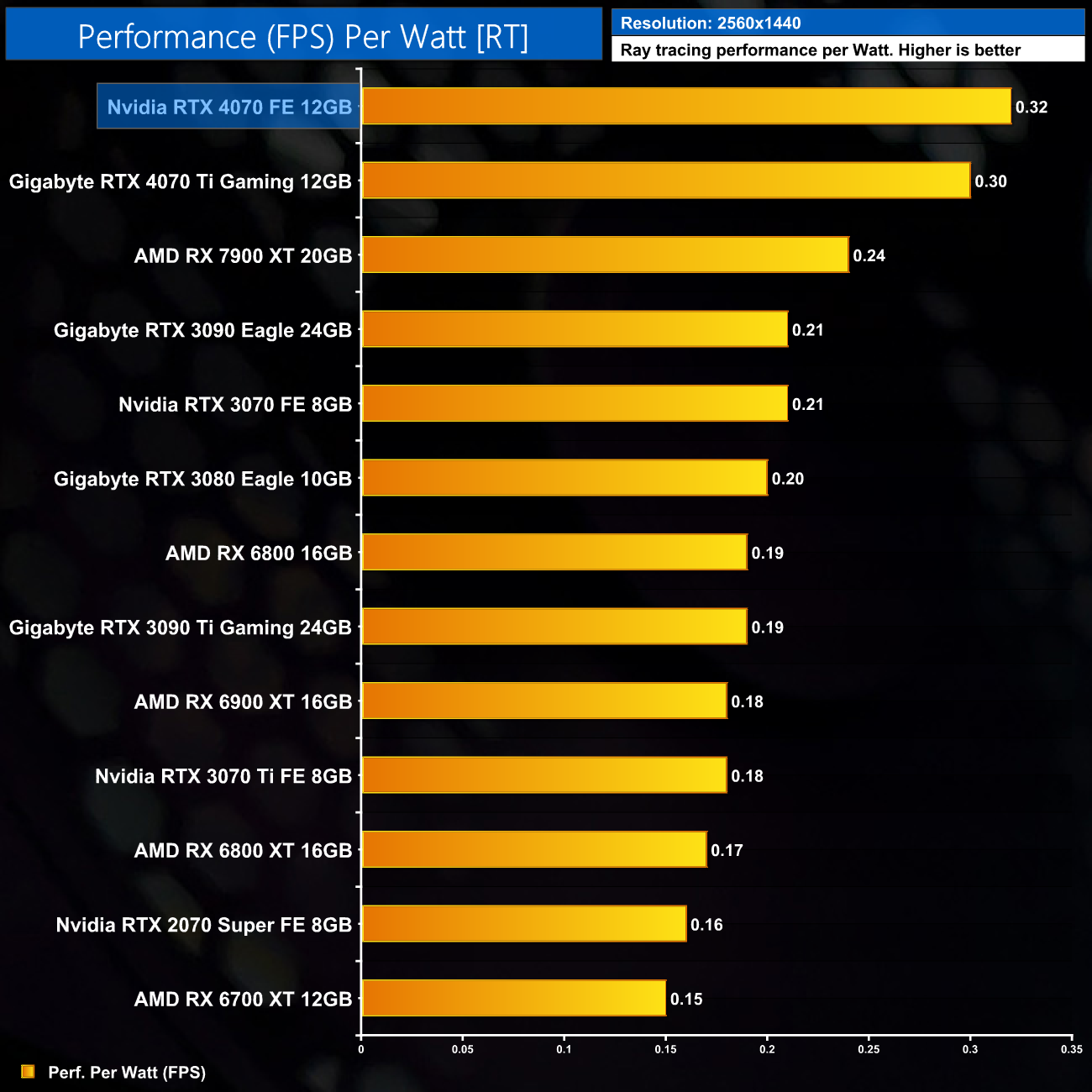 Interestingly, when looking at performance per Watt for our ray traced games, the gain for the 4070 over the RTX 3080 is slightly smaller, with a 60% increase in efficiency on show. Compared to the RX 7900 XT though, the RTX 4070 offerings 41% more performance per Watt for ray traced gaming.