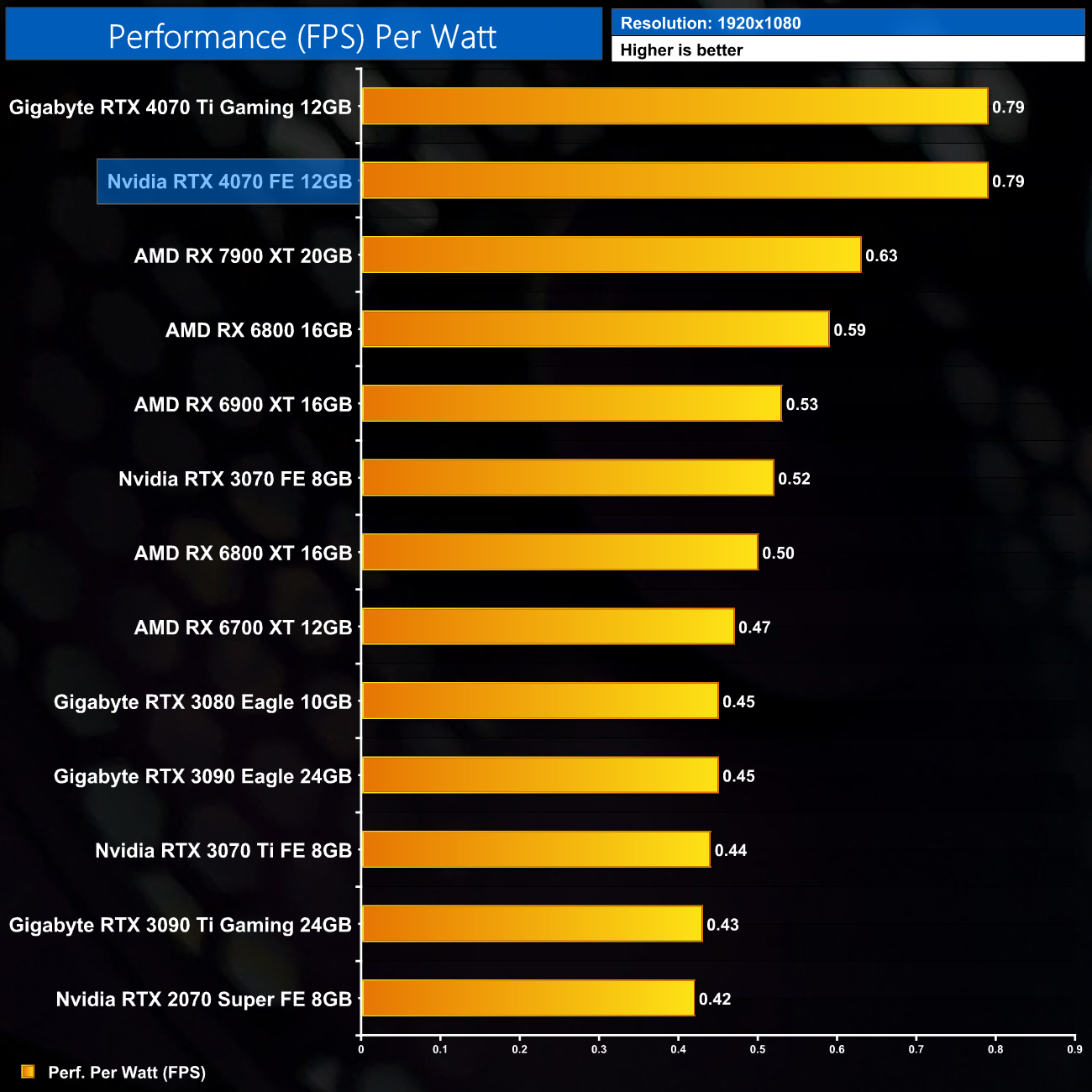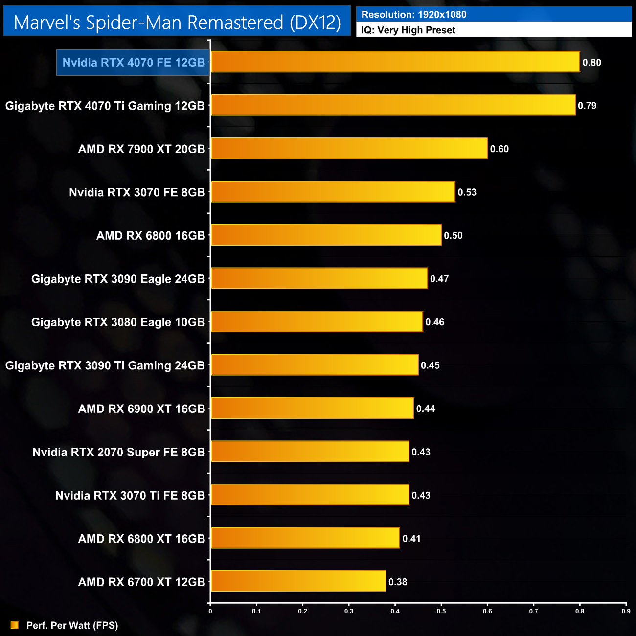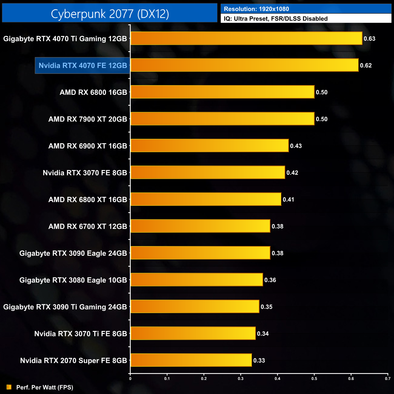 Interestingly, when looking at performance per Watt for our ray traced games, the gain for the 4070 over the RTX 3080 is slightly smaller, with a 60% increase in efficiency on show. Compared to the RX 7900 XT though, the RTX 4070 offerings 41% more performance per Watt for ray traced gaming.