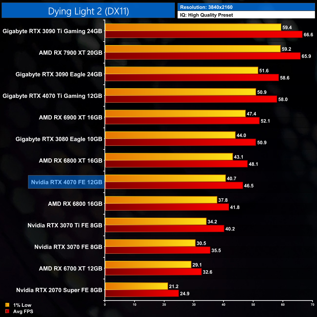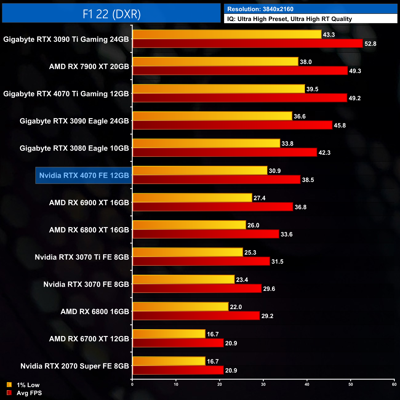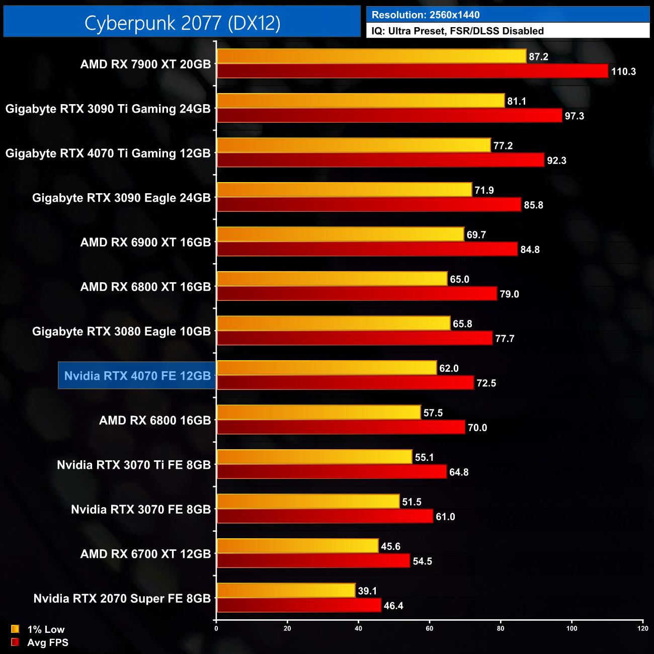 At 1440p the 4070 is still good for 63FPS on average, and that's before enabling DLSS (which we benchmark on the next page of this review.) It's still 5% slower than the RTX 3080, but also still 17% ahead of the RX 6900 XT, while that margin increases to 22% versus the RTX 3070 Ti.
