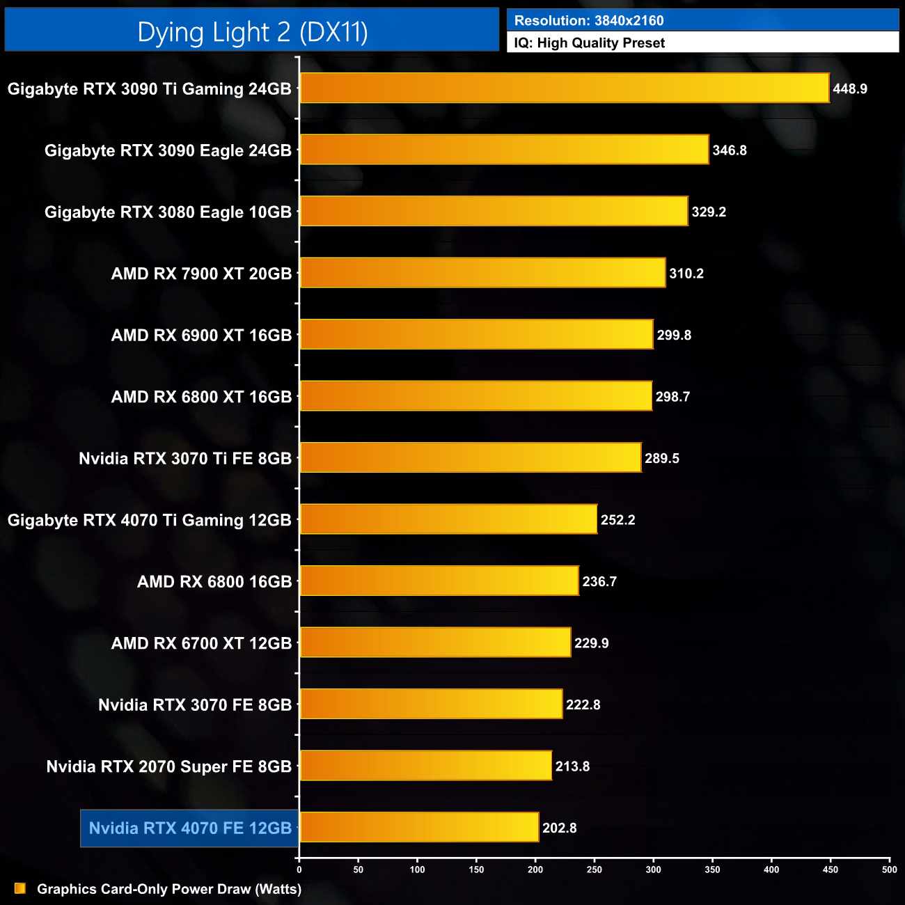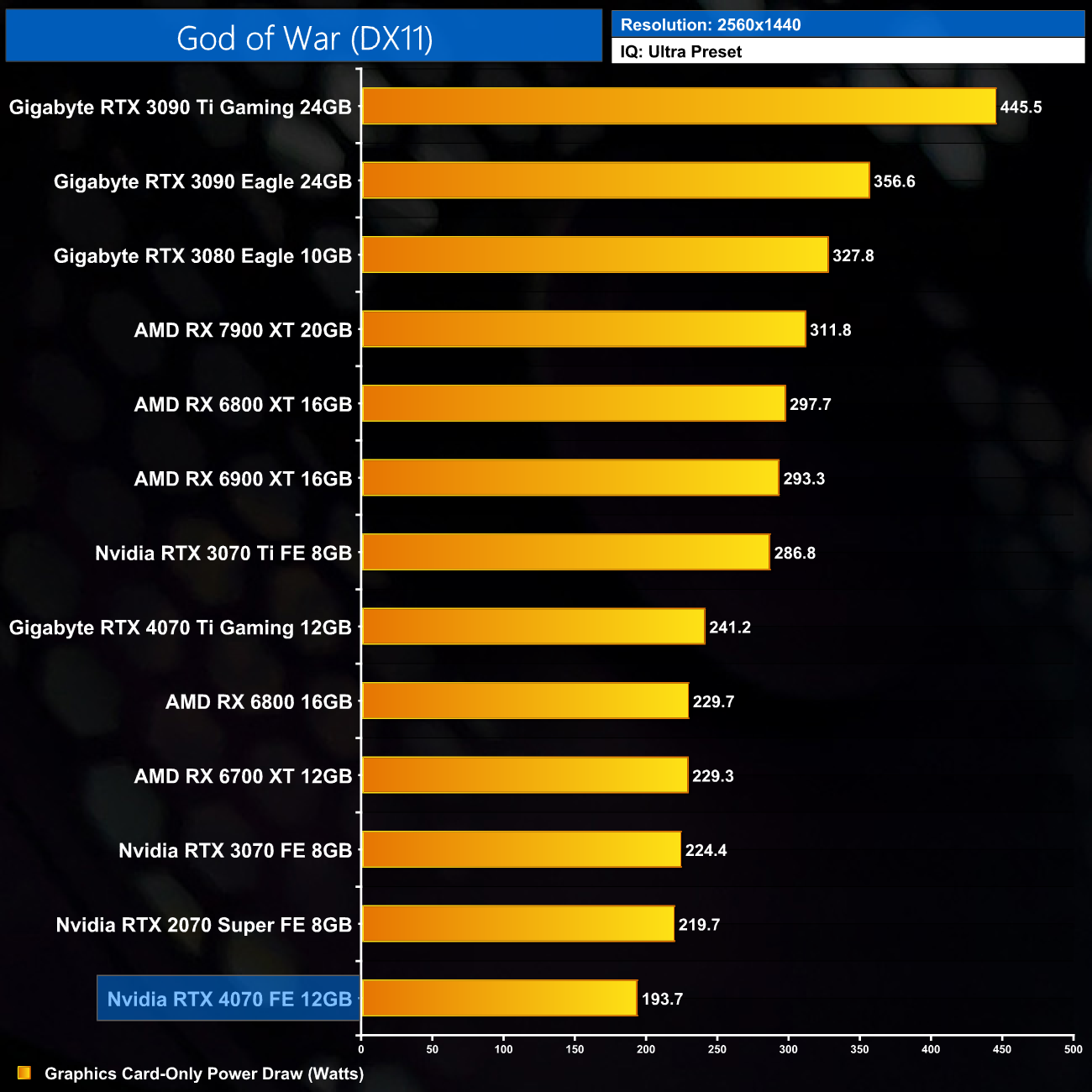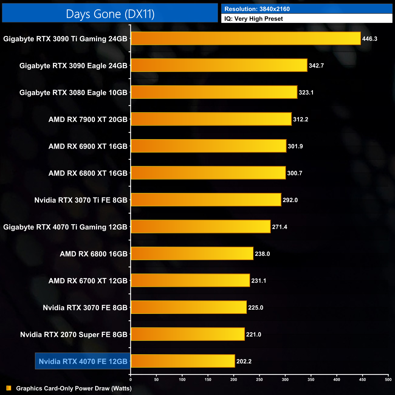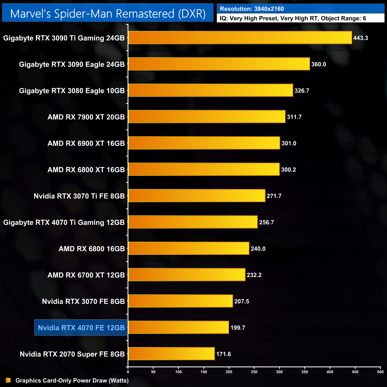 Although not an ideal 4K gaming GPU, the 4070 pulls 200W almost exactly at this resolution, averaging 199.8W to be exact.