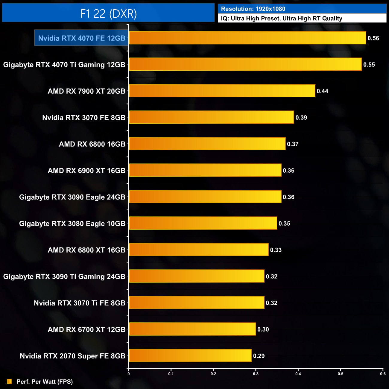 For our ray traced figures too, we can see the 4070 remains top dog. It's now 45% more efficient than the RTX 3080 on average at 4K.