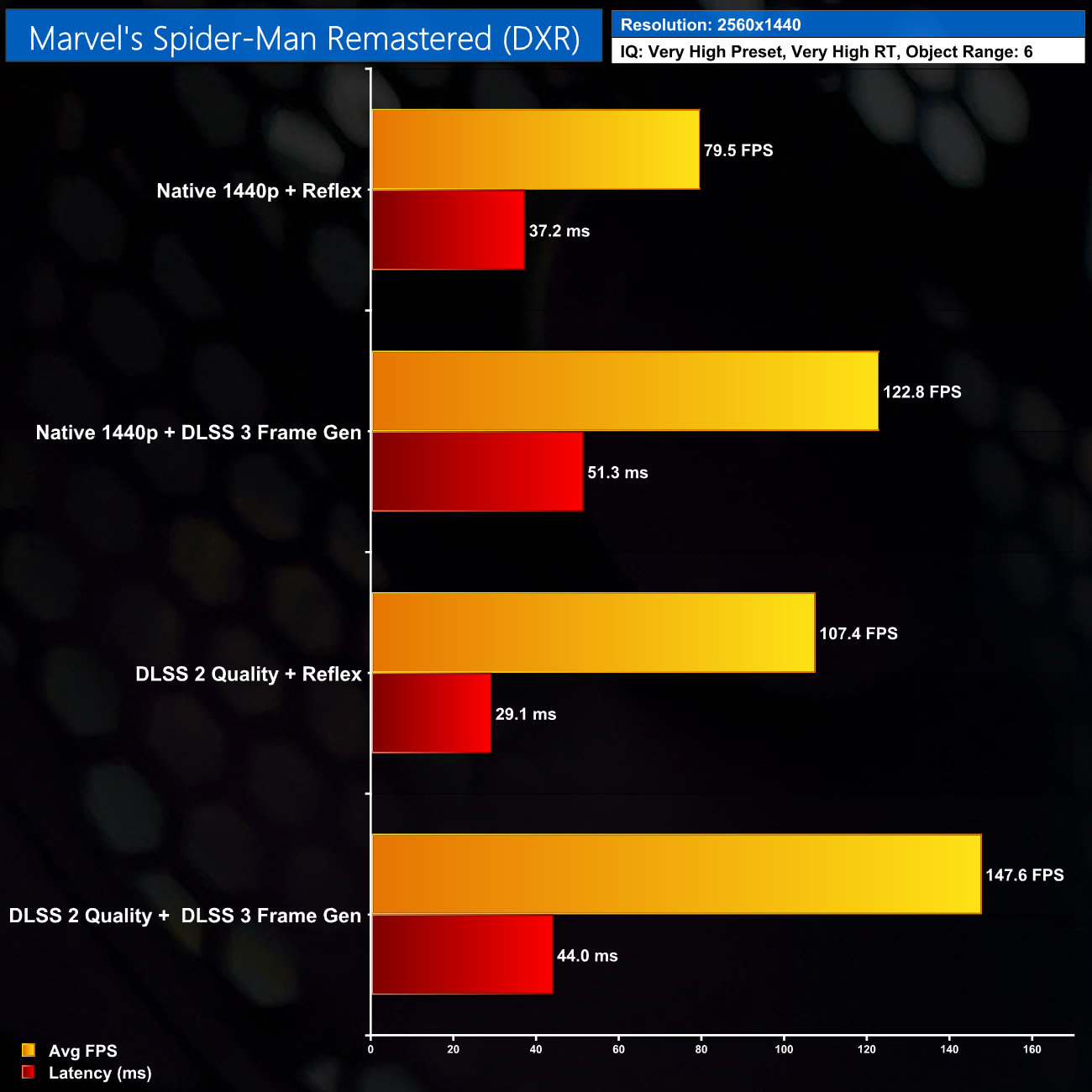 DLSS 3 Frame Gen works very well in Spider-Man (I actually used it for 90% of my play through in this game over Christmas), where it excels by alleviating CPU bottlenecks. Engaging both DLSS 2 and DLSS 3 Frame Gen results in almost 150FPS at 1440p, though latency is a few milliseconds higher than native resolution.