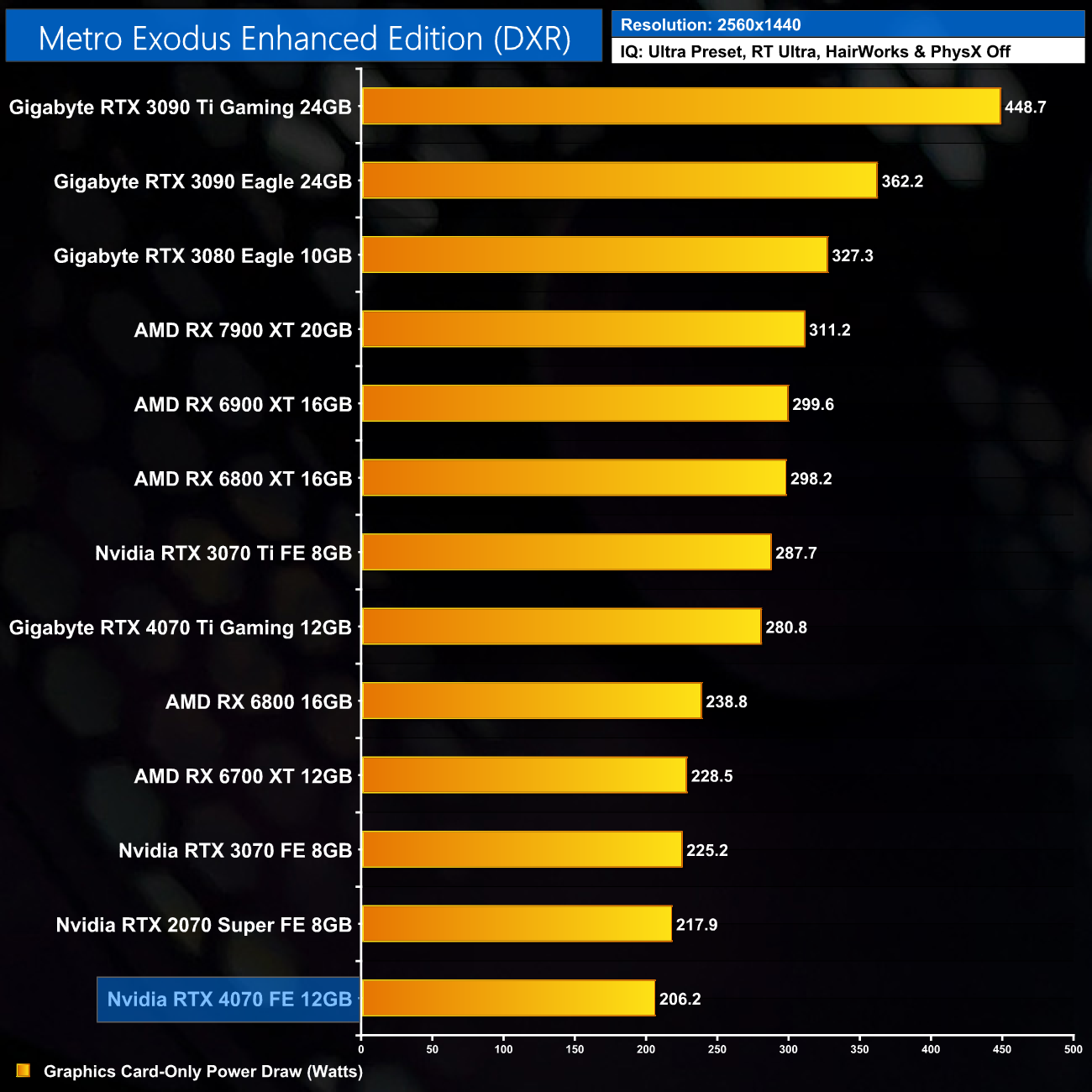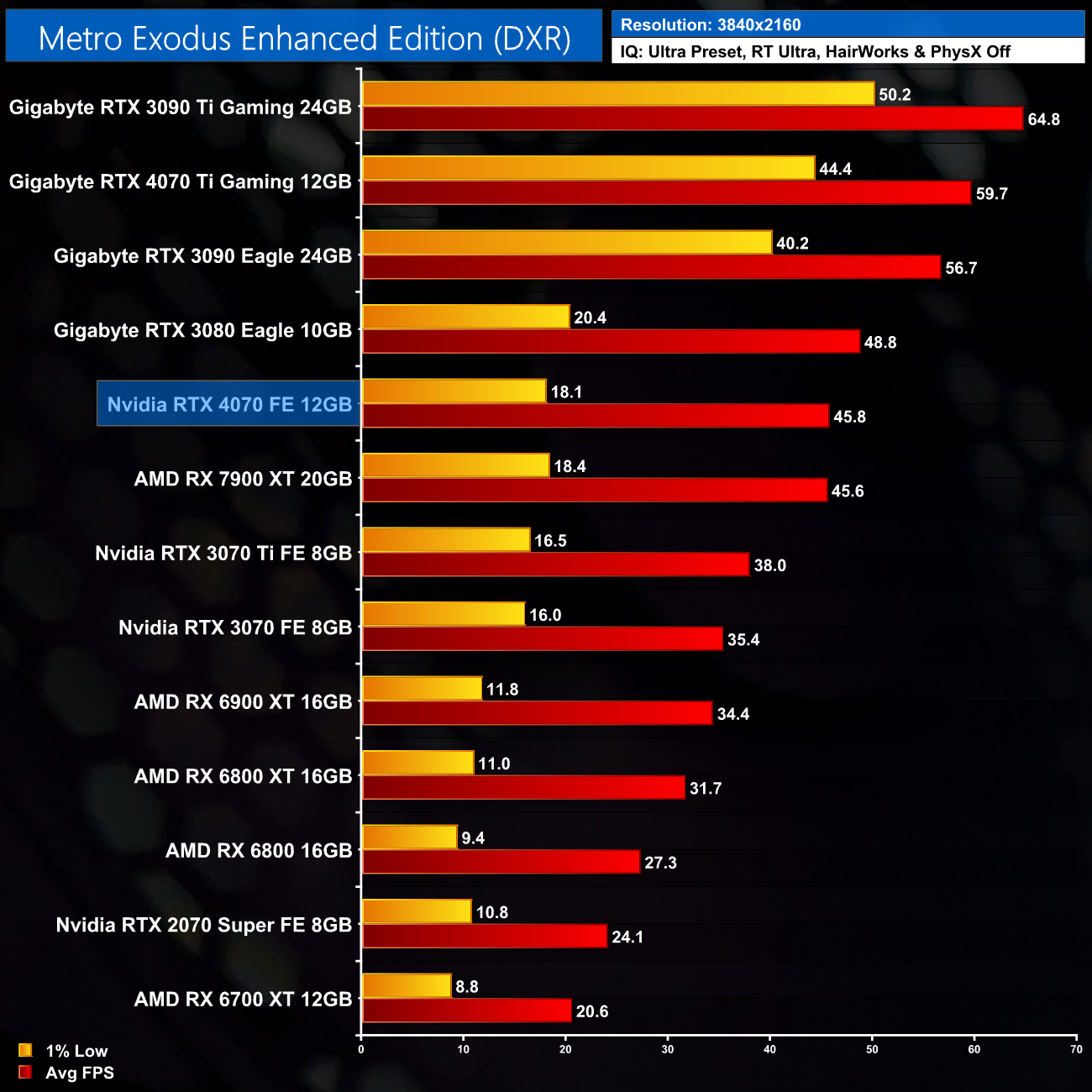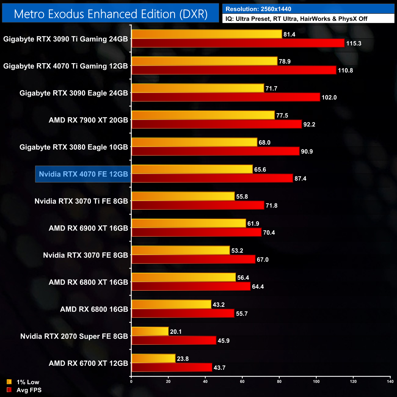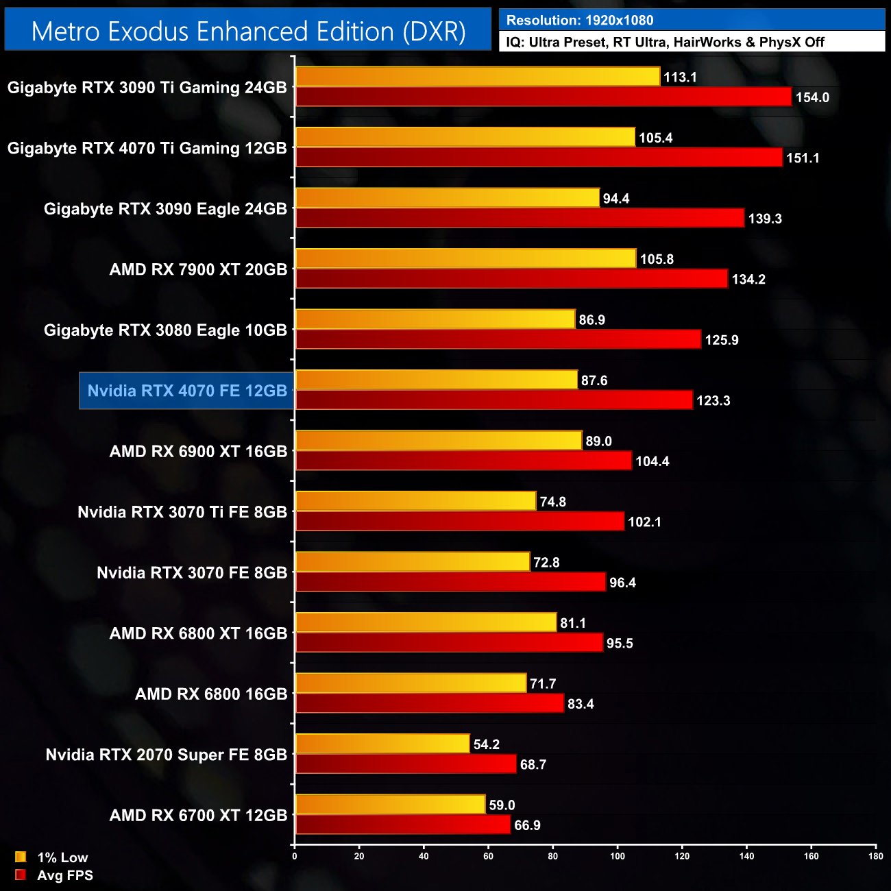 Lastly, we finish up with a look at Metro Exodus Enhanced Edition. Despite a large amount of ray tracing, this game is still very performant, with the 4070 hitting over 120FPS at 1440p, where it's within 2% of the 3080 and is within 8% of the RX 7900 XT.