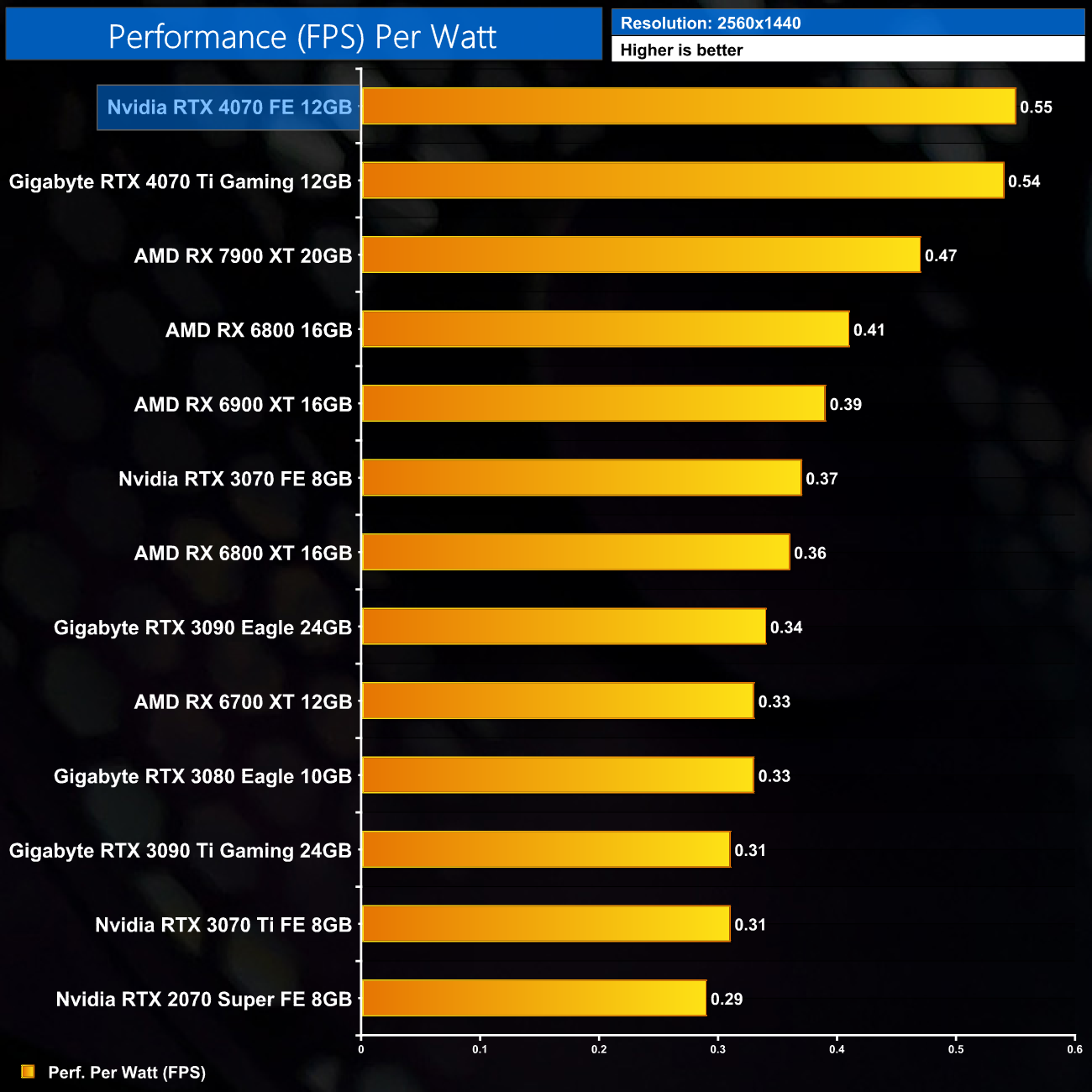 For ray tracing, the 4070 is still looking at a 60% uplift versus the RTX 3080. The increase in efficiency over the 7900 XT is lower than it was at 1080p, but is still a healthy 33% in favour of the 4070.