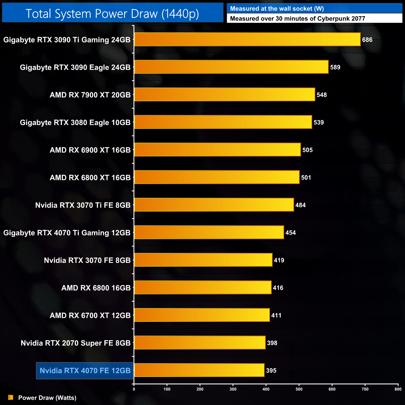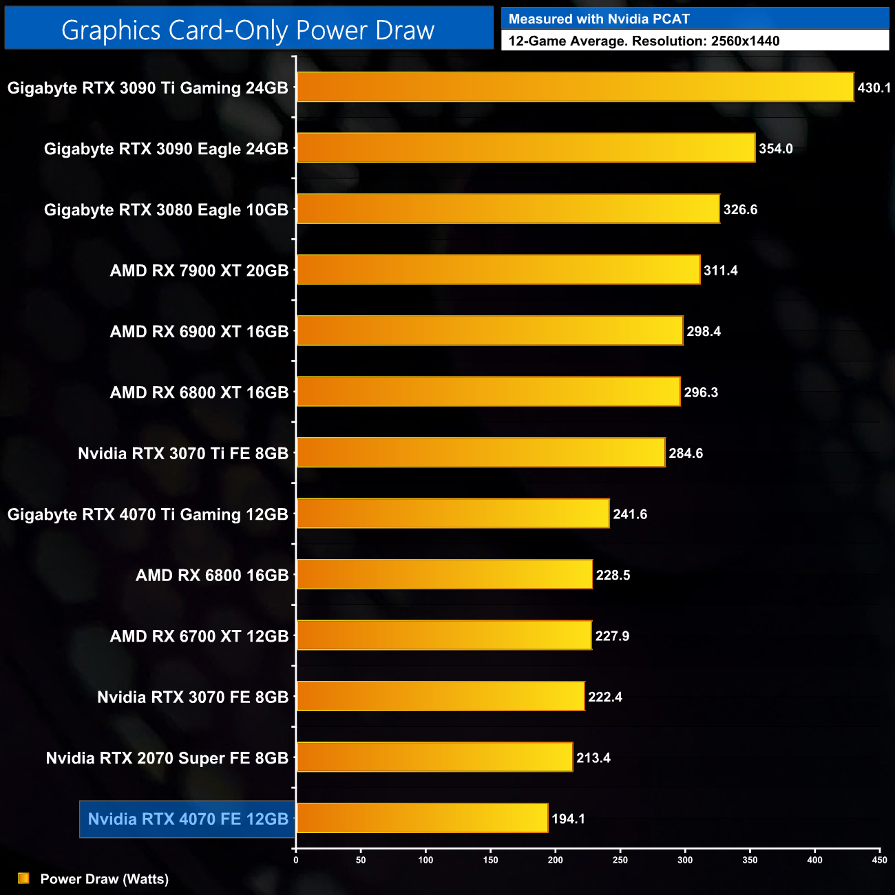 Stepping up to 1440p gaming does result in an increase to power draw, with the 4070 averaging 194W across the 12 rasterised titles we tested.