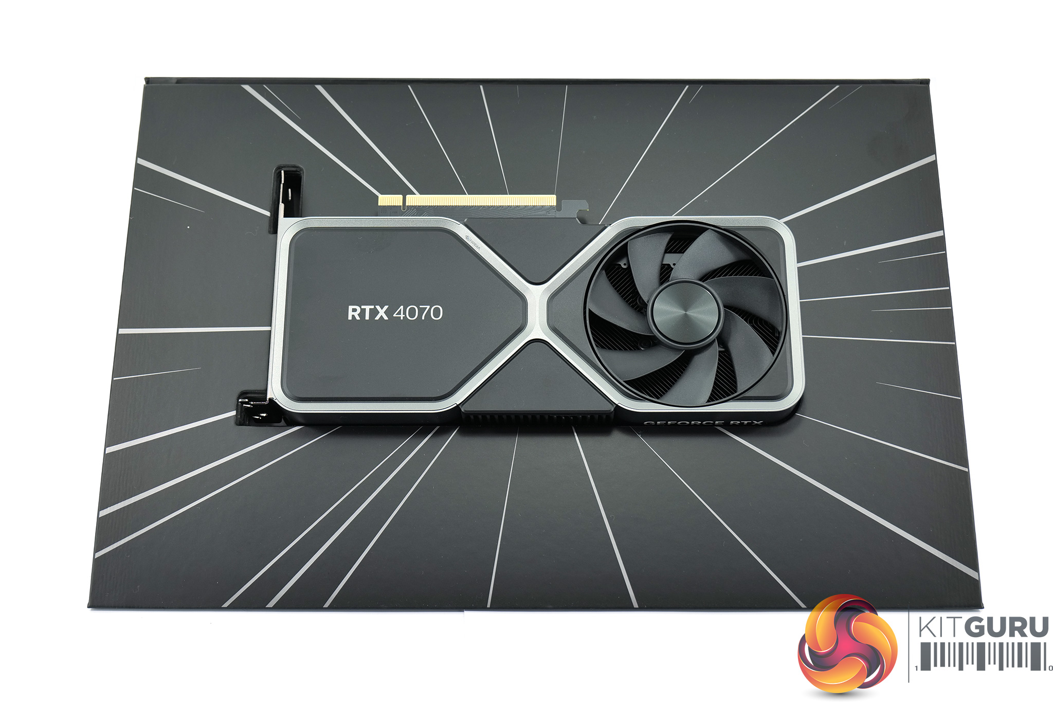 The RTX 4070 Founders Edition ships in identical packaging to the RTX 4080 or 4090 Founders. The front of the box opens up to reveal the card sitting in the middle of the cardboard surround.