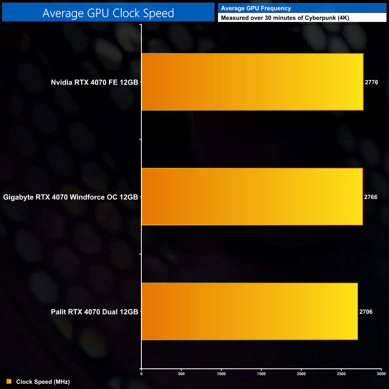 Here we present the average clock speed for each graphics card while running Cyberpunk 2077 for 30 minutes. We use GPU-Z to record the GPU core frequency during gameplay. We calculate the average core frequency during the 30 minute run to present here.