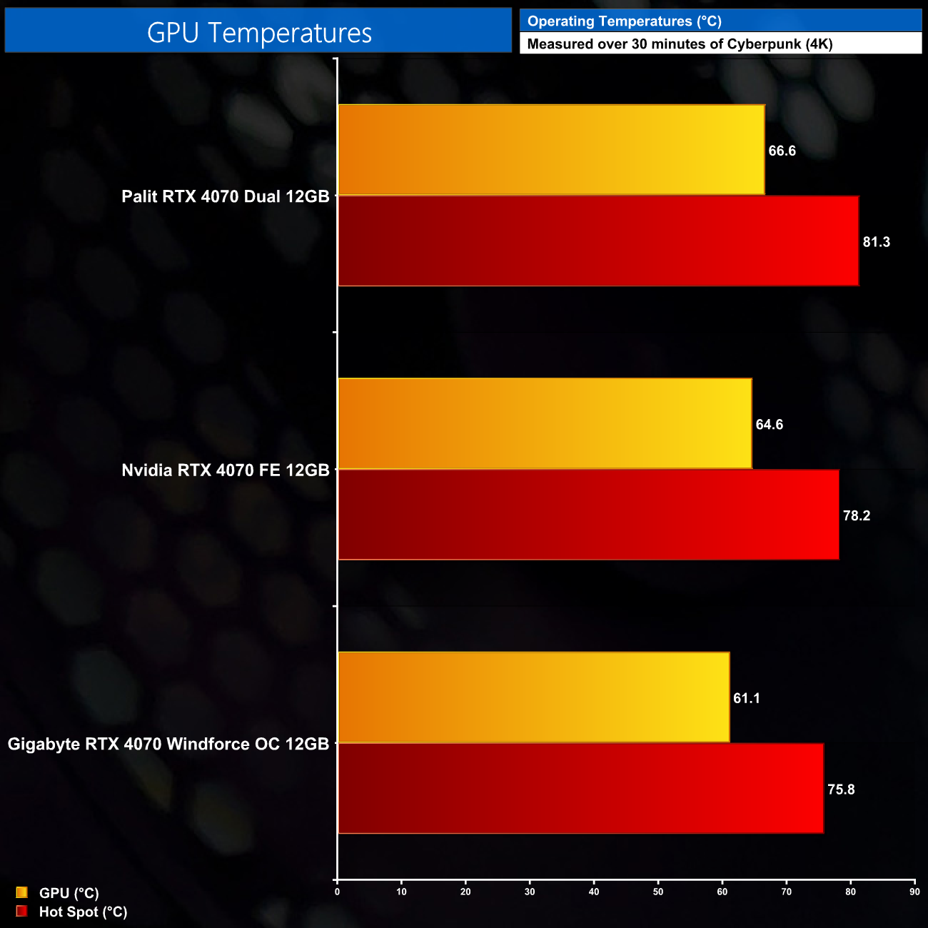 Temperatures for all three cards tested are thoroughly decent and leave little to be desired. The Palit Dual runs the hottest, but only up to a peak of 66.6C on the GPU and 81.3C for the hot spot. The Founders Edition sits just below that, hitting 64.6C for the GPU and 78.2C for the hot spot, while Gigabyte's Windforce OC is about 3C cooler still for both metrics.