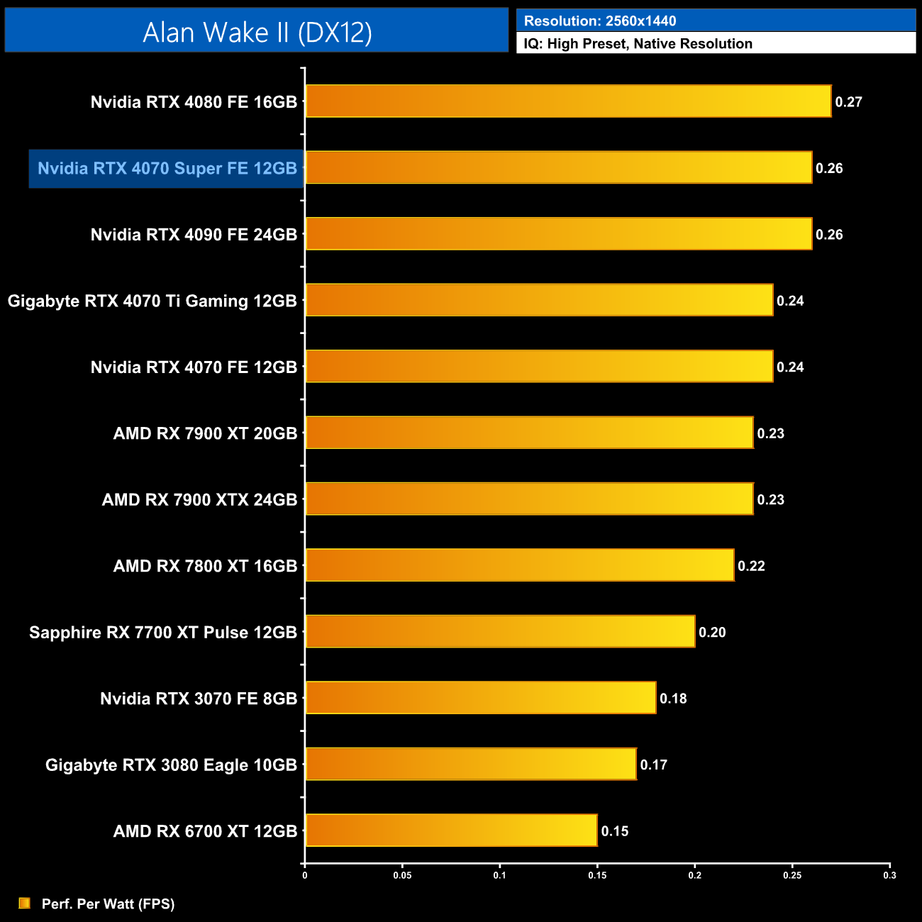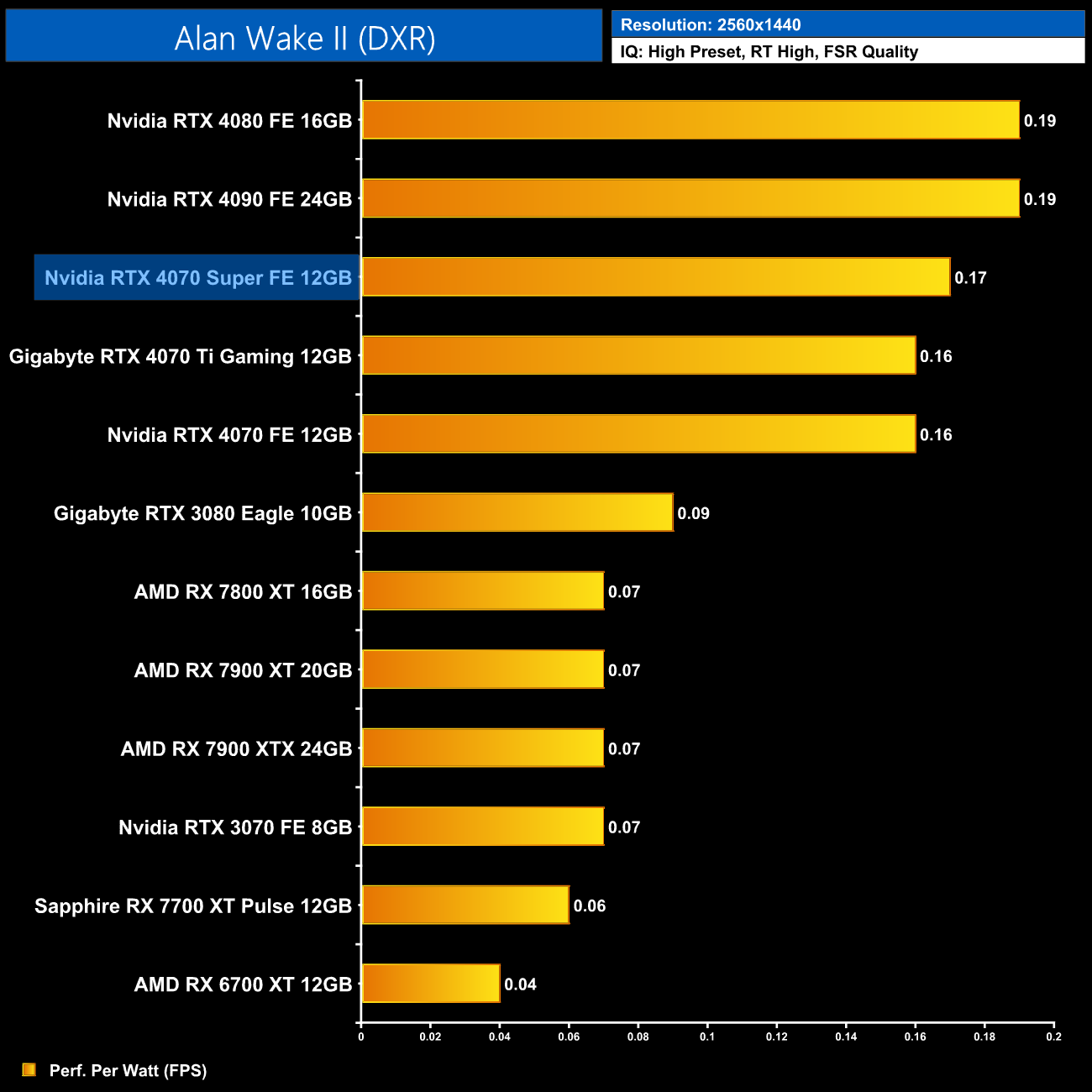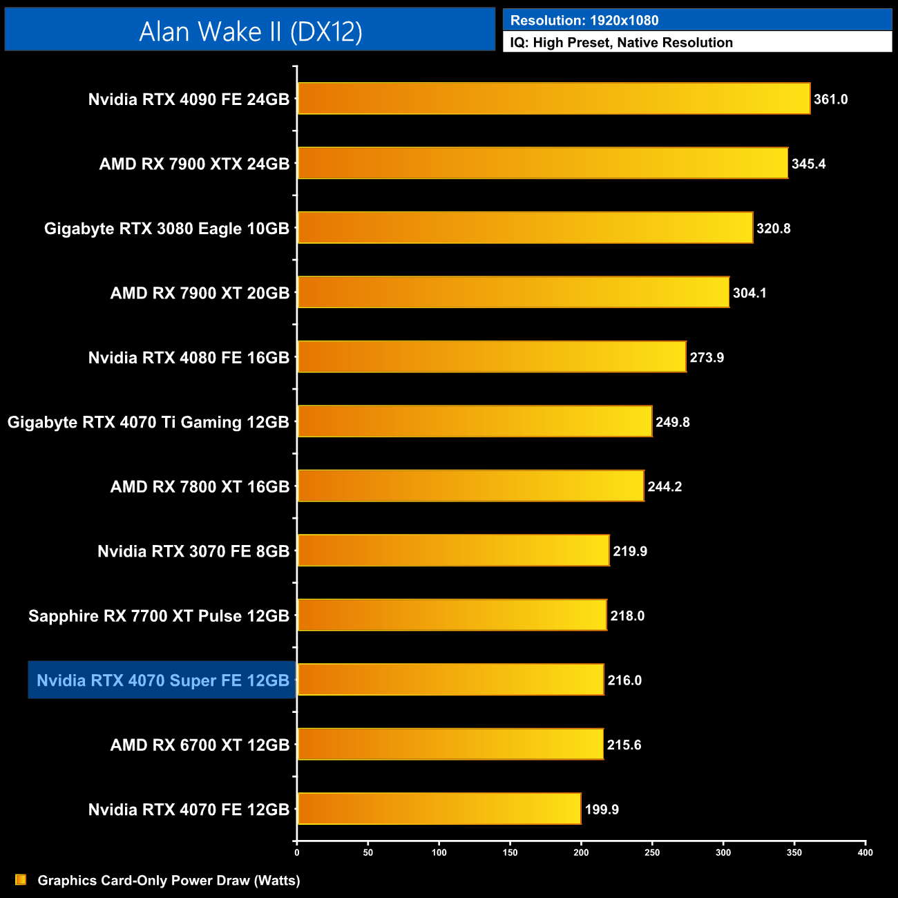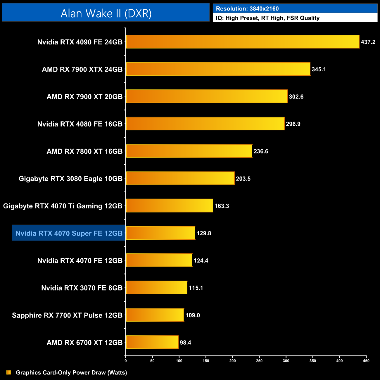 Interestingly, average power draw drops at 4K when looking at the ray traced games. This is mainly due to Alan Wake II, which chokes the 4070 Super at 4K with maximum ray tracing details – the GPU appears to be memory bandwidth or possibly VRAM starved, dropping power draw significantly.