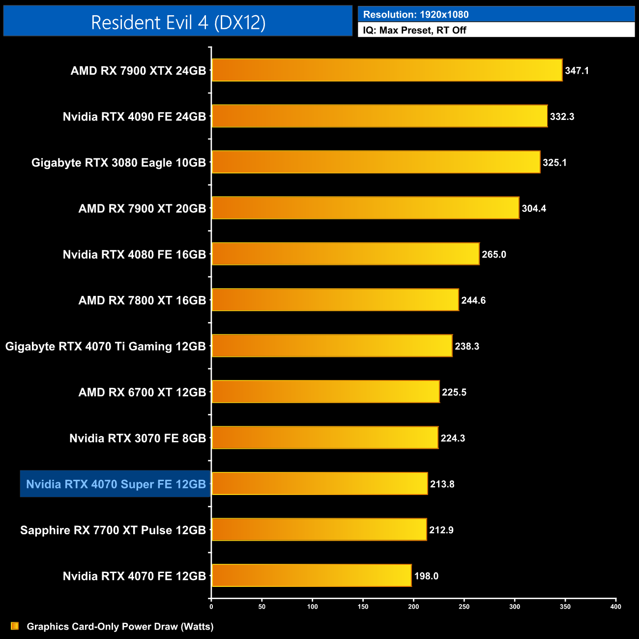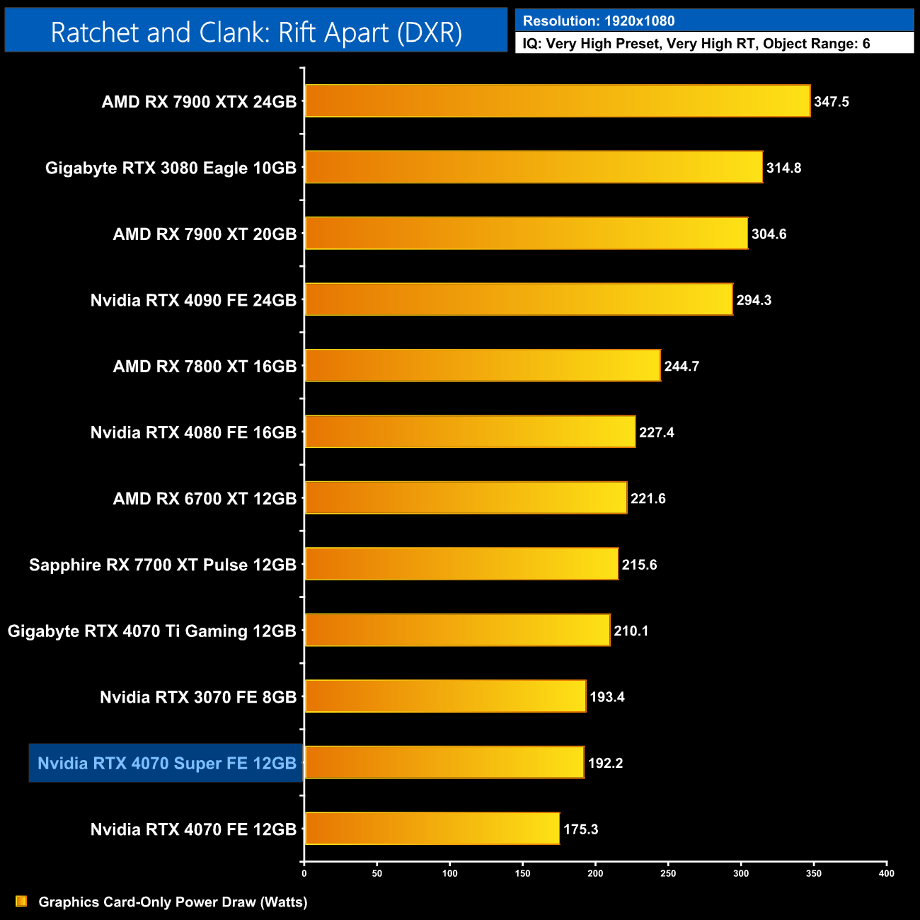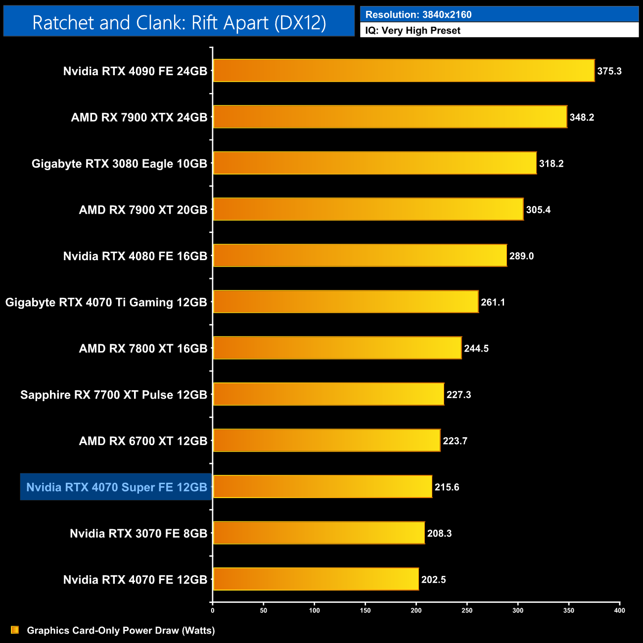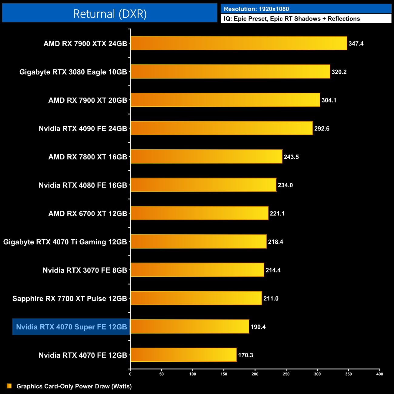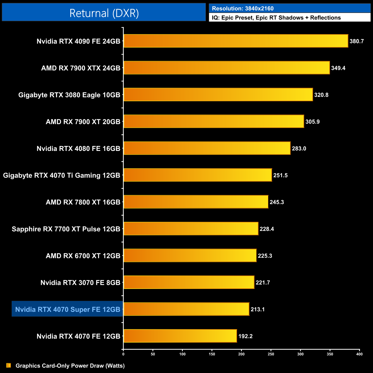 Interestingly, average power draw drops at 4K when looking at the ray traced games. This is mainly due to Alan Wake II, which chokes the 4070 Super at 4K with maximum ray tracing details – the GPU appears to be memory bandwidth or possibly VRAM starved, dropping power draw significantly.