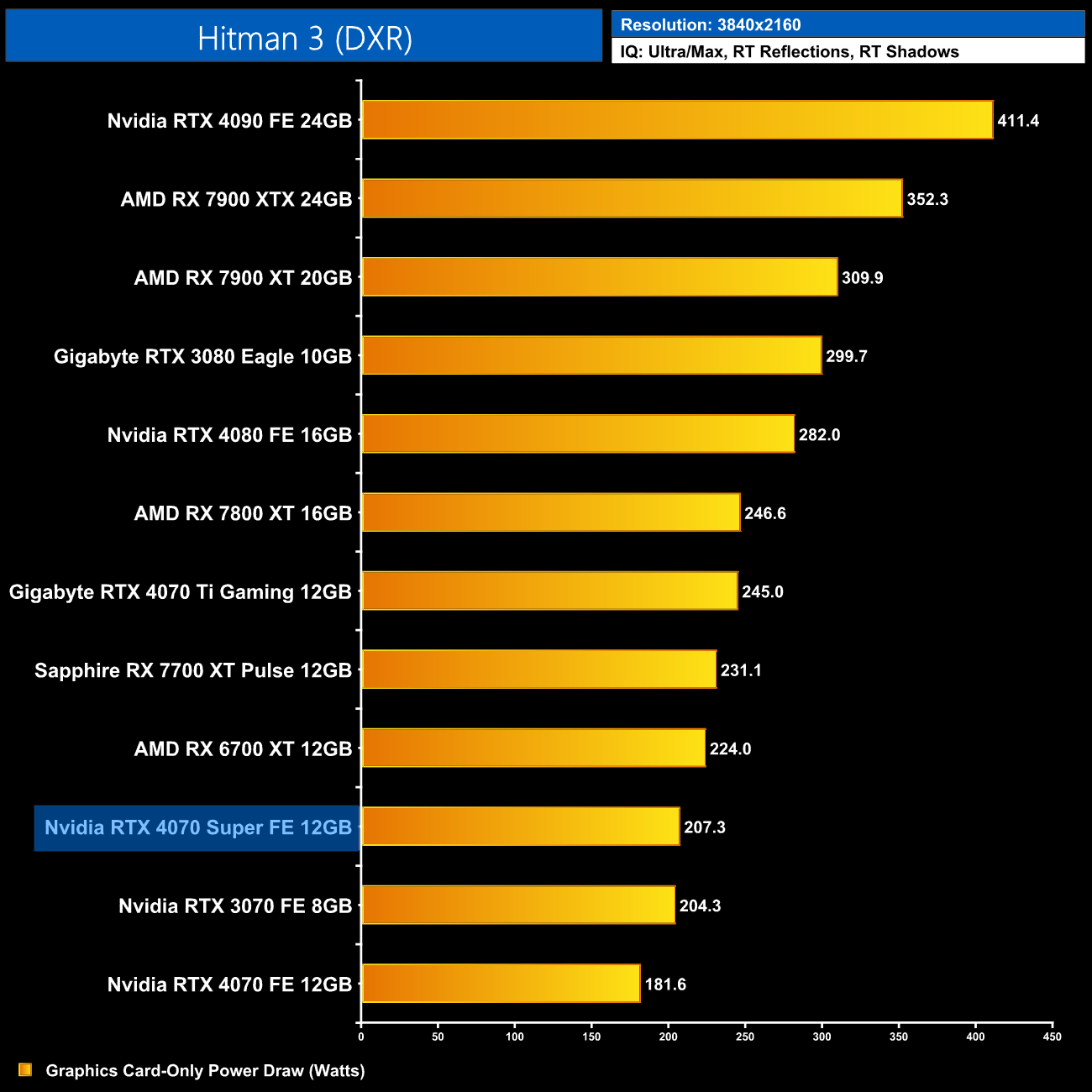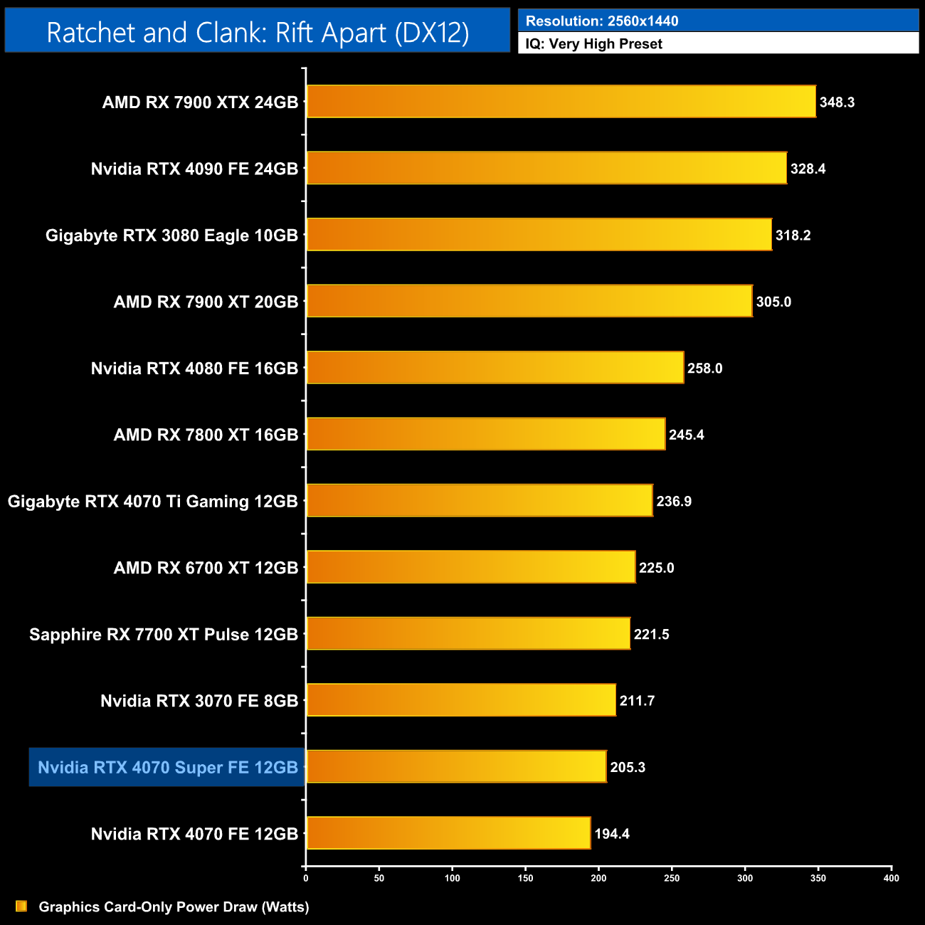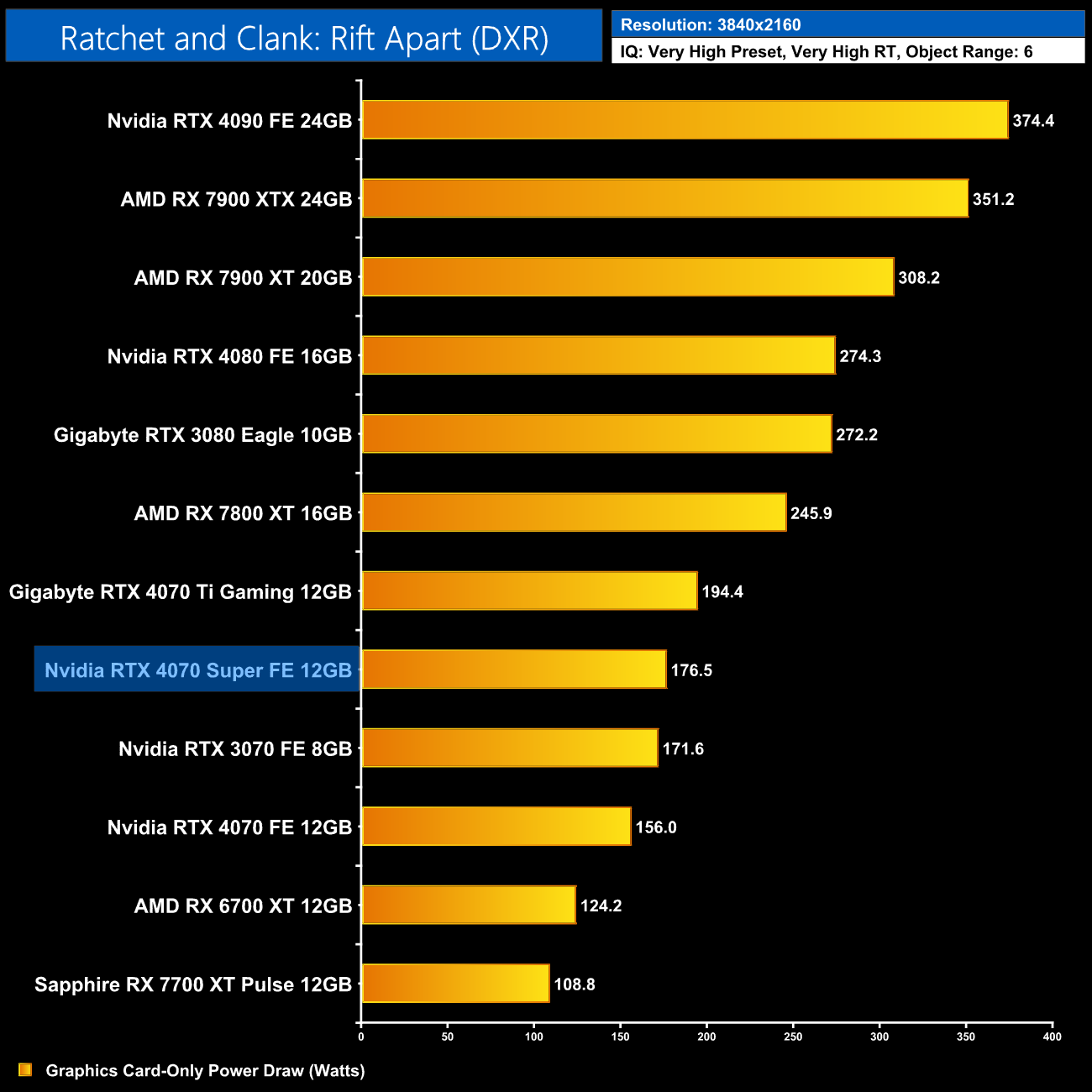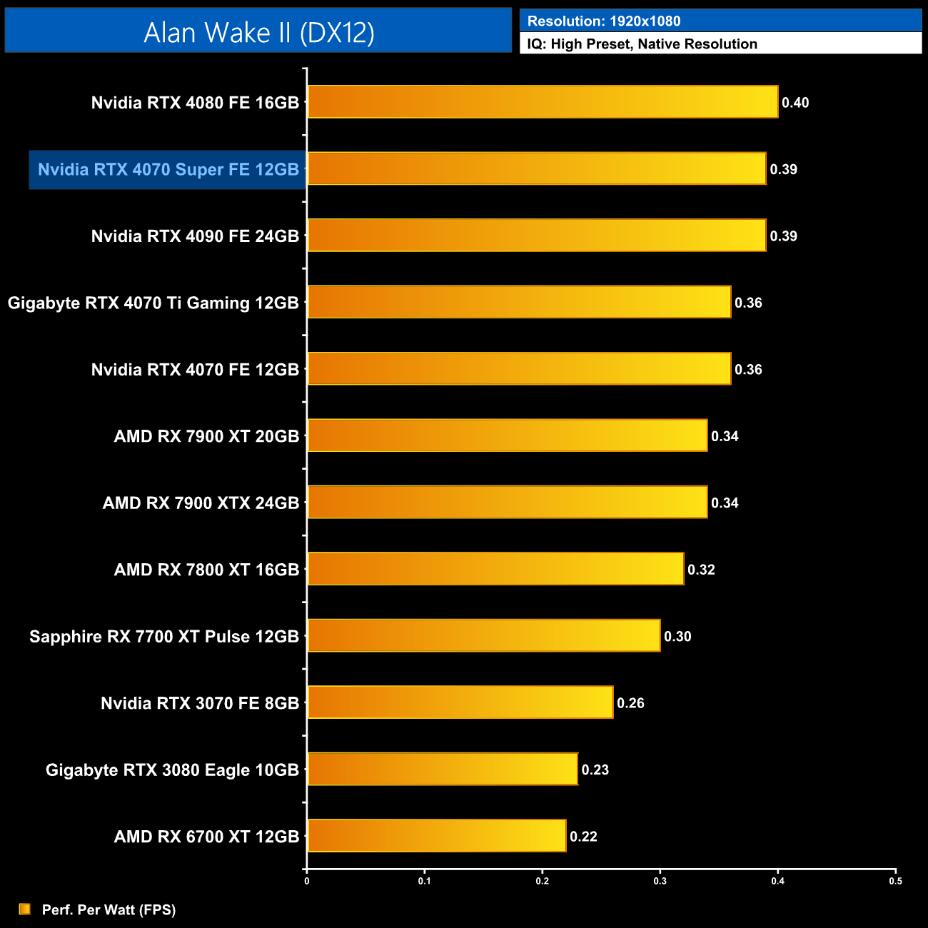 Interestingly, average power draw drops at 4K when looking at the ray traced games. This is mainly due to Alan Wake II, which chokes the 4070 Super at 4K with maximum ray tracing details – the GPU appears to be memory bandwidth or possibly VRAM starved, dropping power draw significantly.