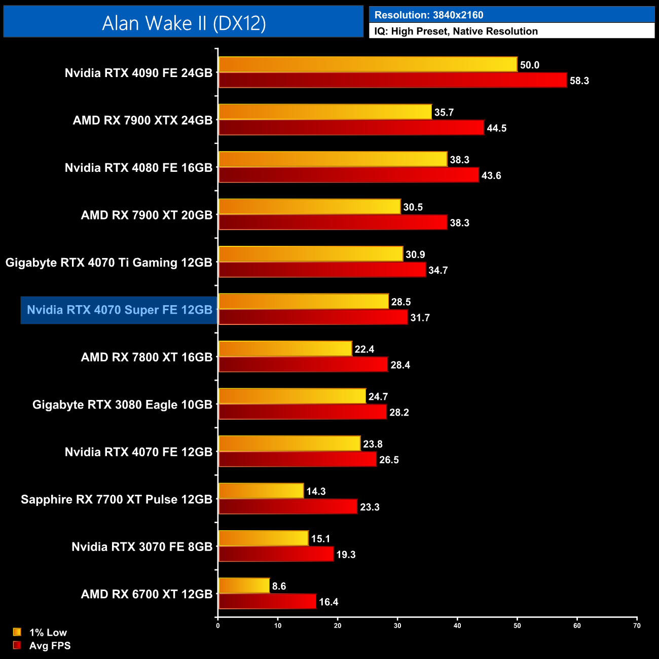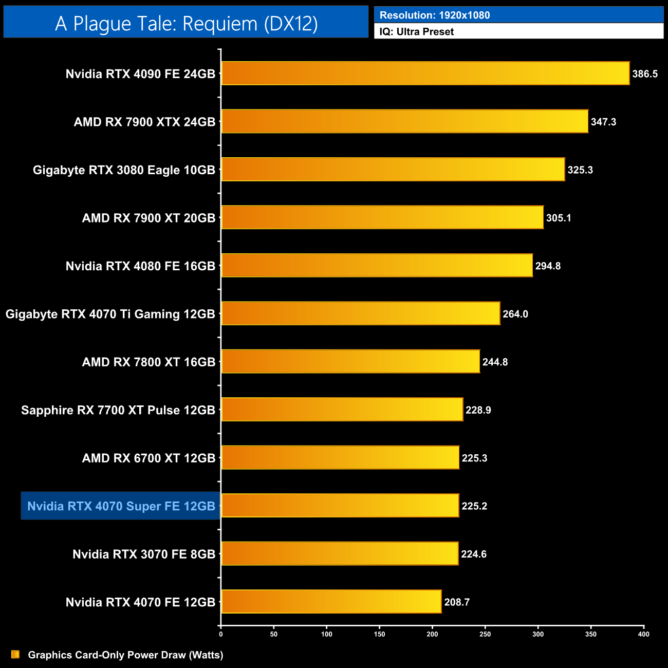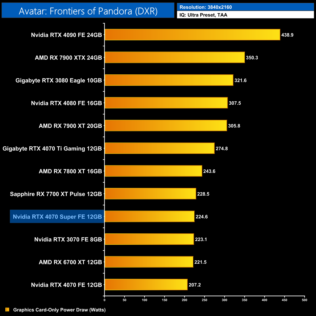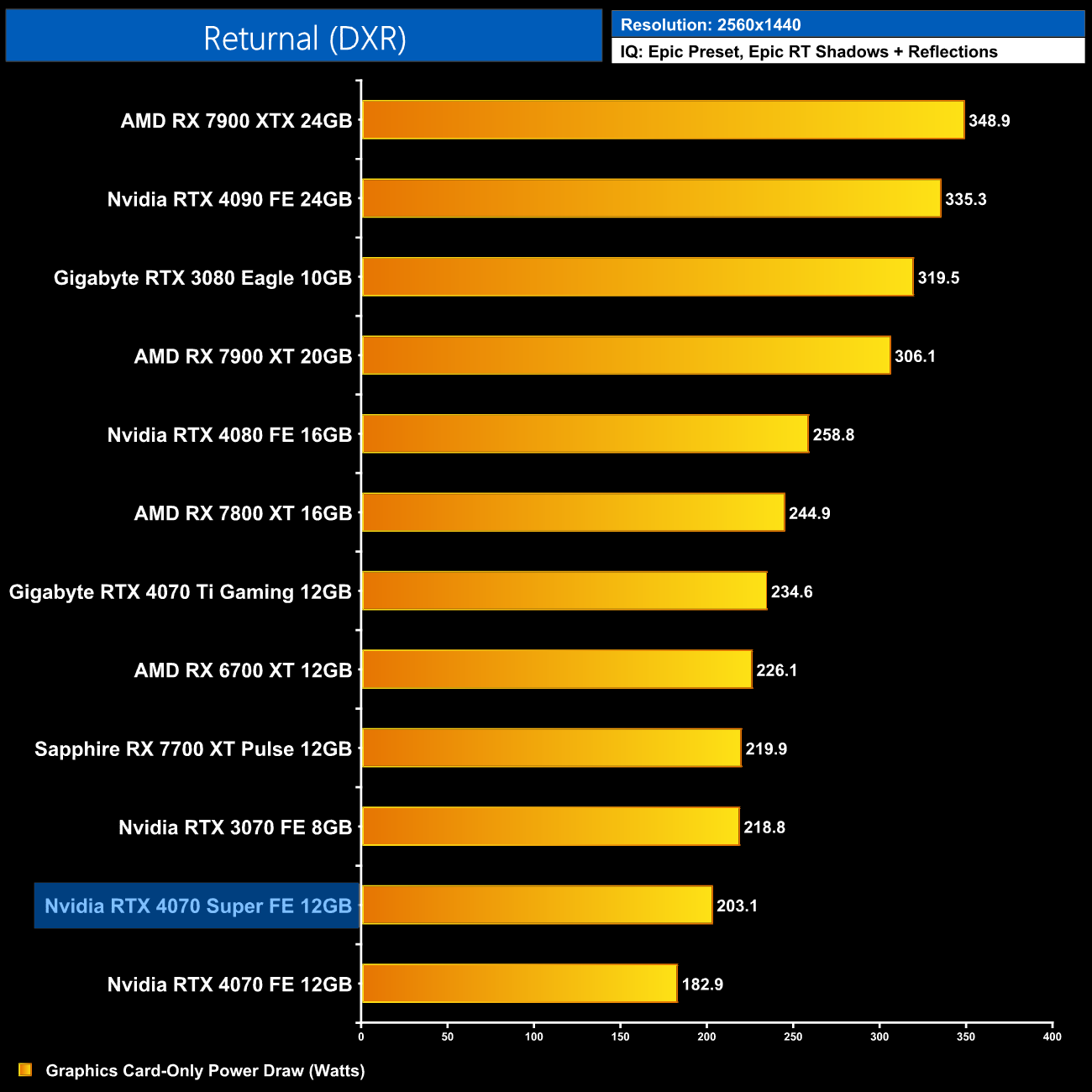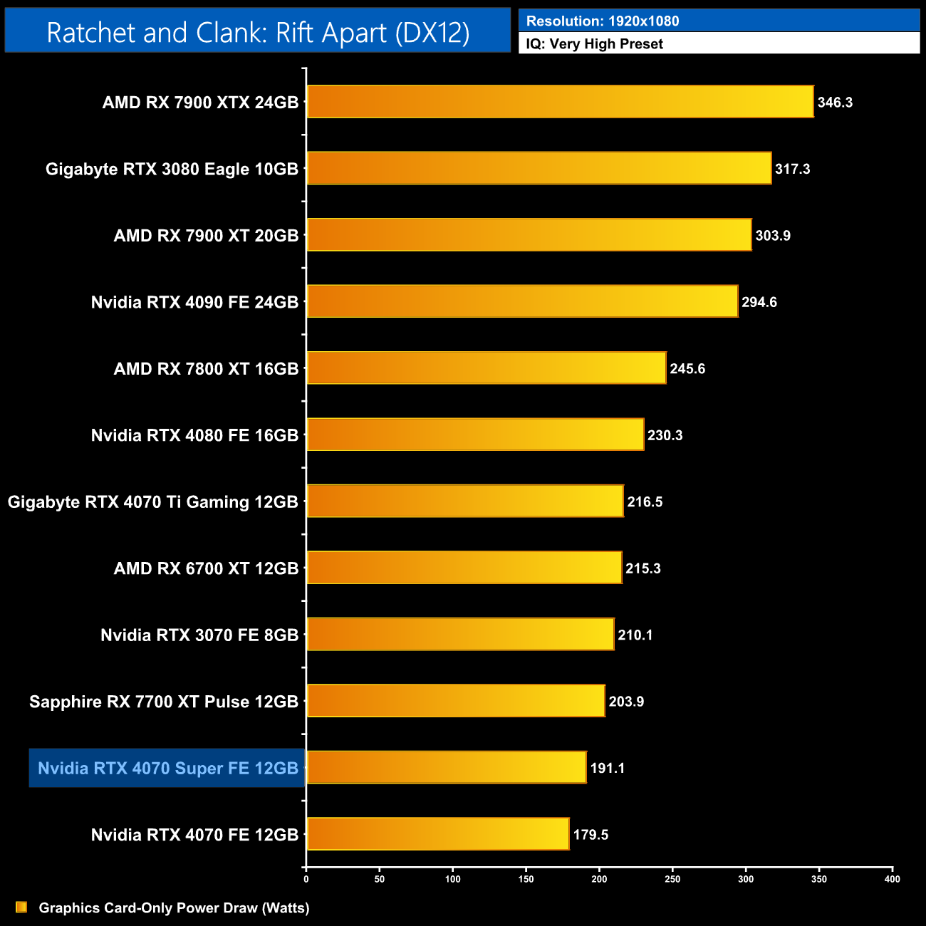 Interestingly, average power draw drops at 4K when looking at the ray traced games. This is mainly due to Alan Wake II, which chokes the 4070 Super at 4K with maximum ray tracing details – the GPU appears to be memory bandwidth or possibly VRAM starved, dropping power draw significantly.