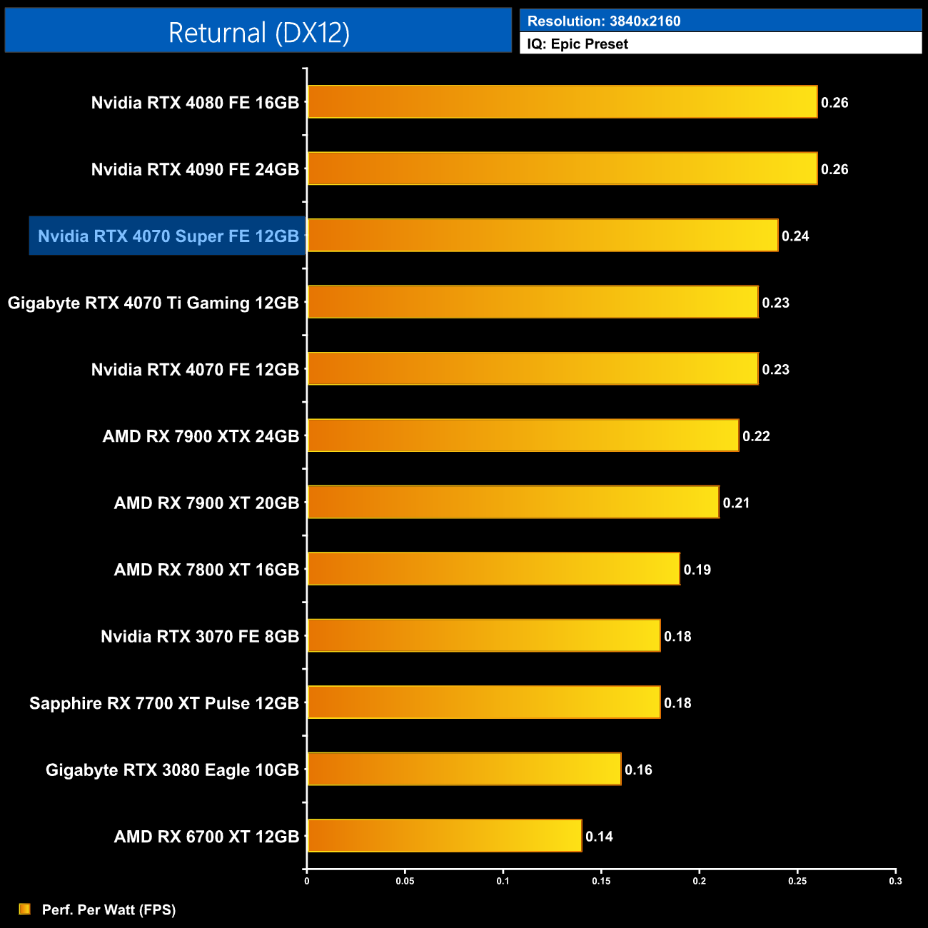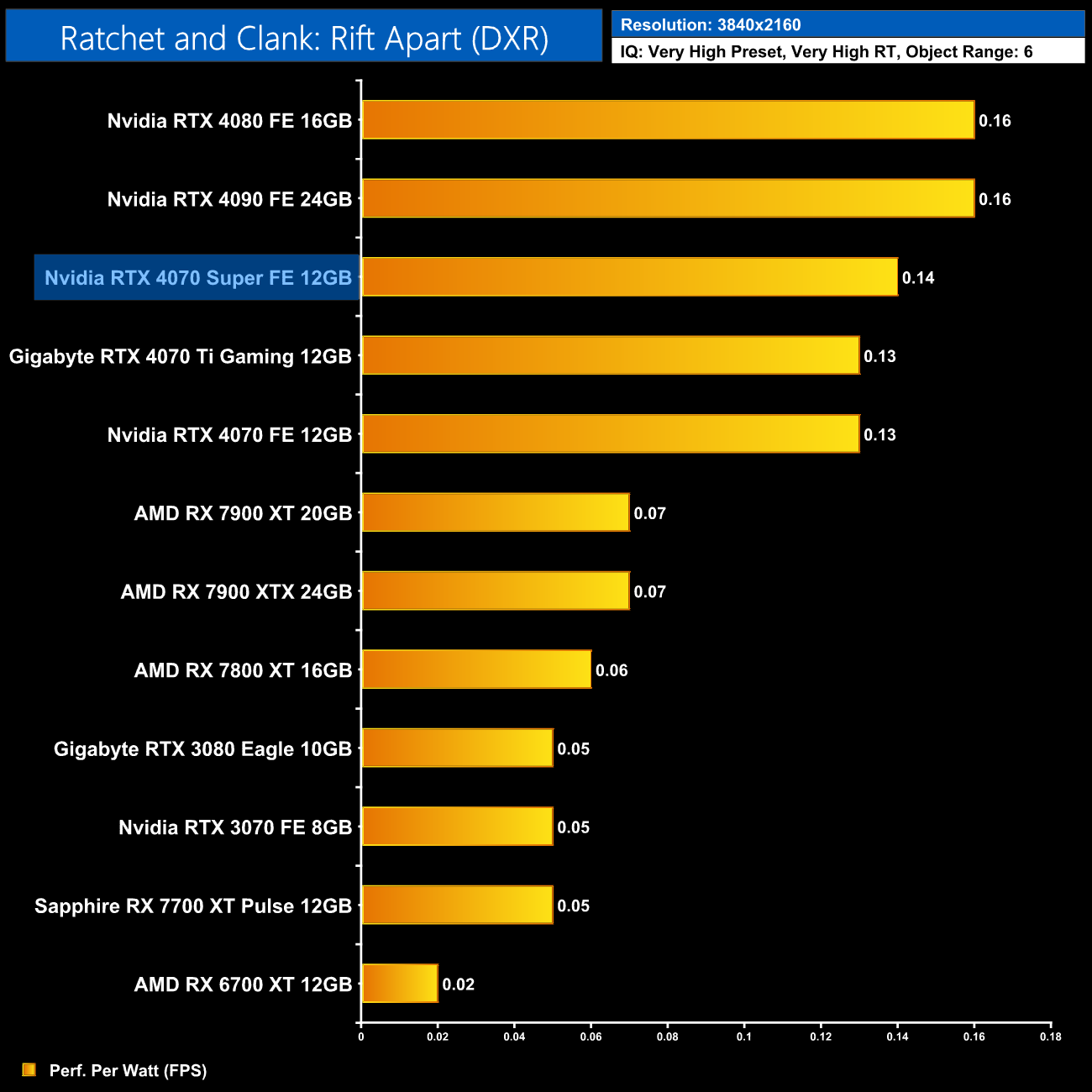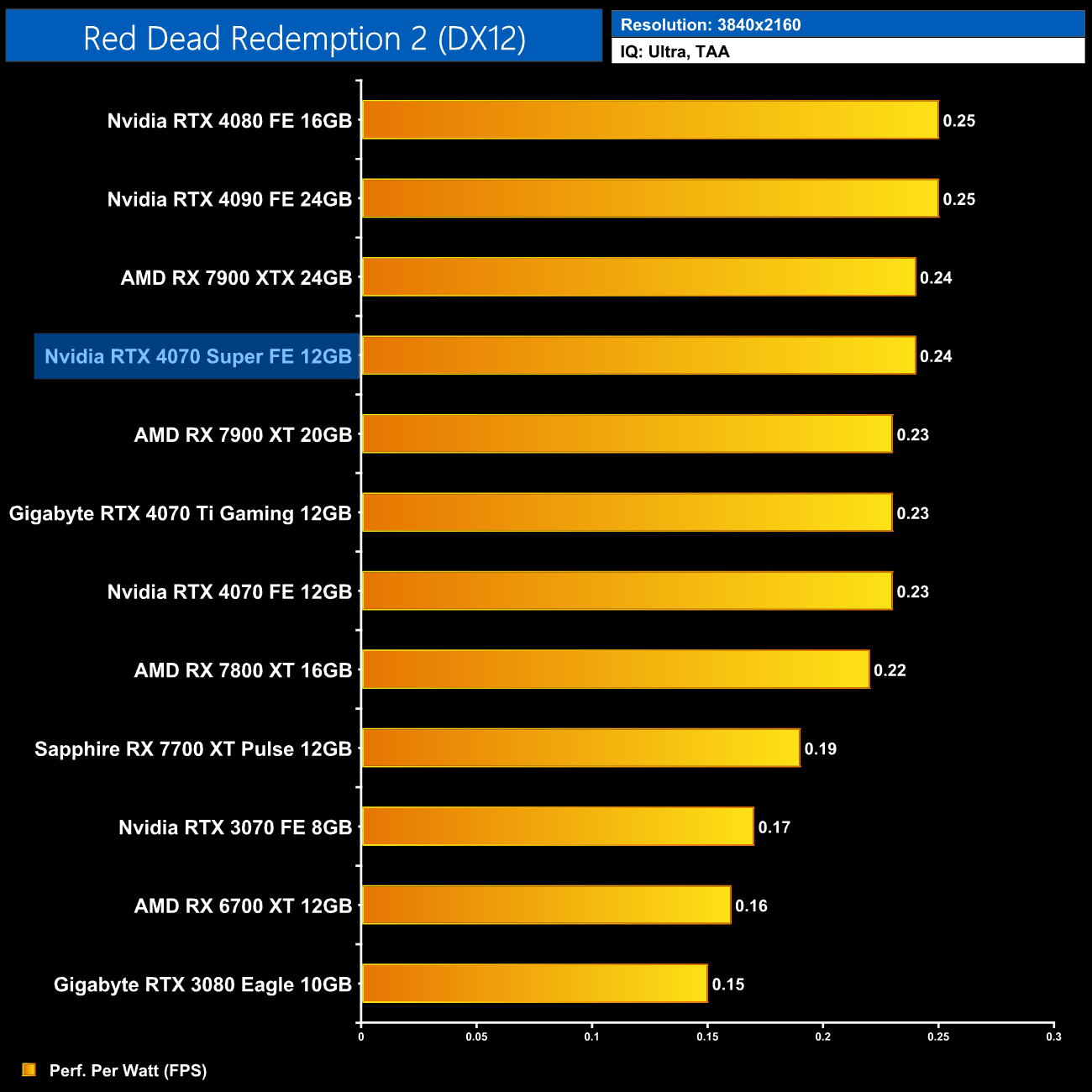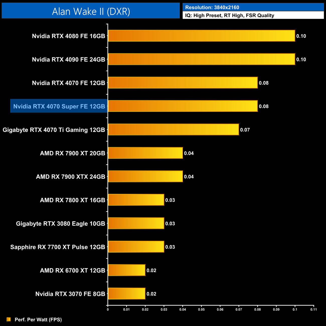 Lastly, at 4K, we see very similar results to the 1440p data, with the 4080 and 4090 still being a touch more efficient than the 4070 Super, but this new GPU is right up there.