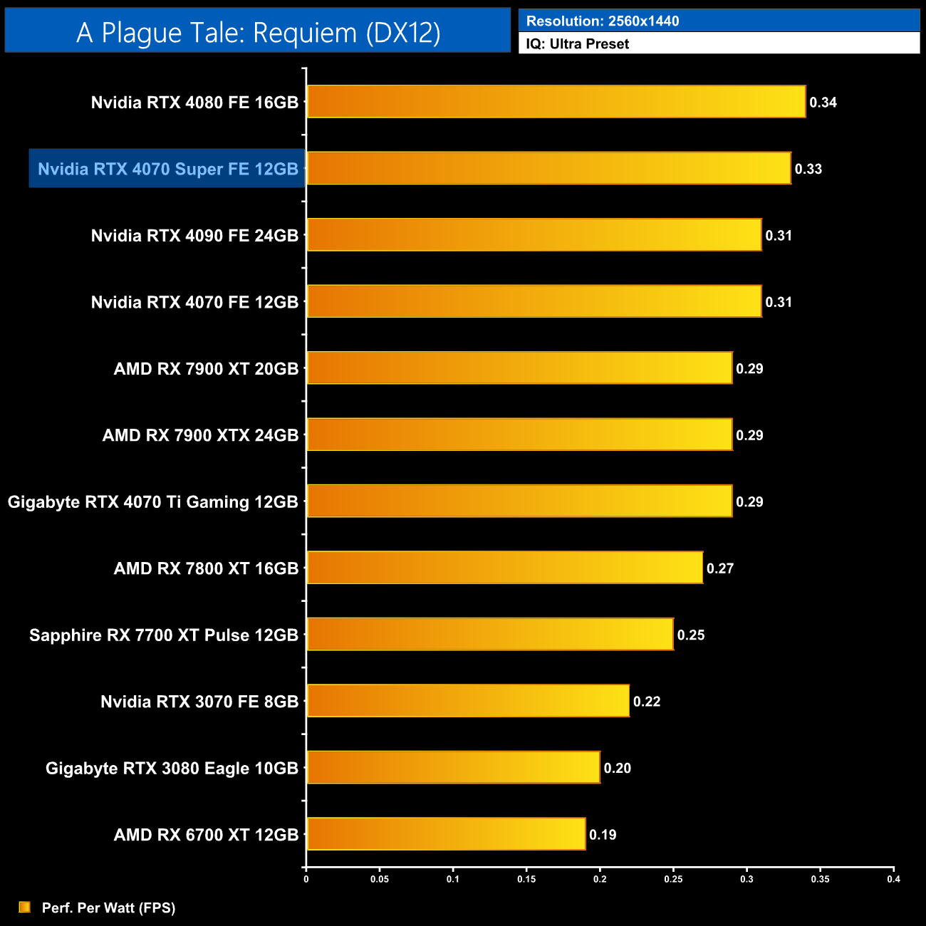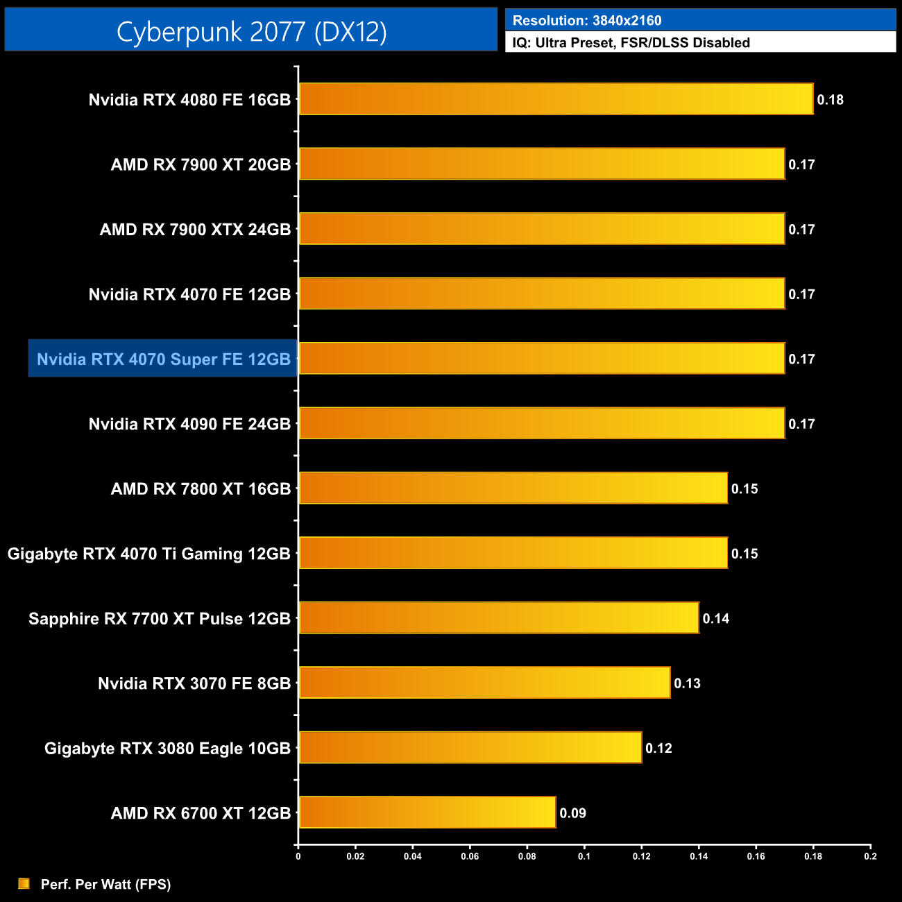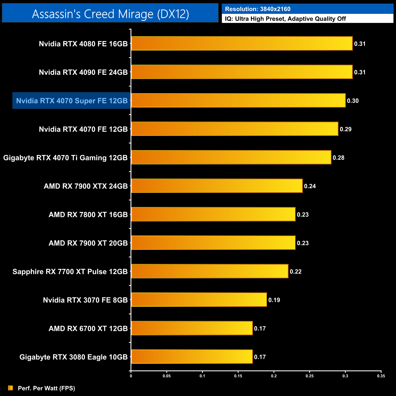 Lastly, at 4K, we see very similar results to the 1440p data, with the 4080 and 4090 still being a touch more efficient than the 4070 Super, but this new GPU is right up there.
