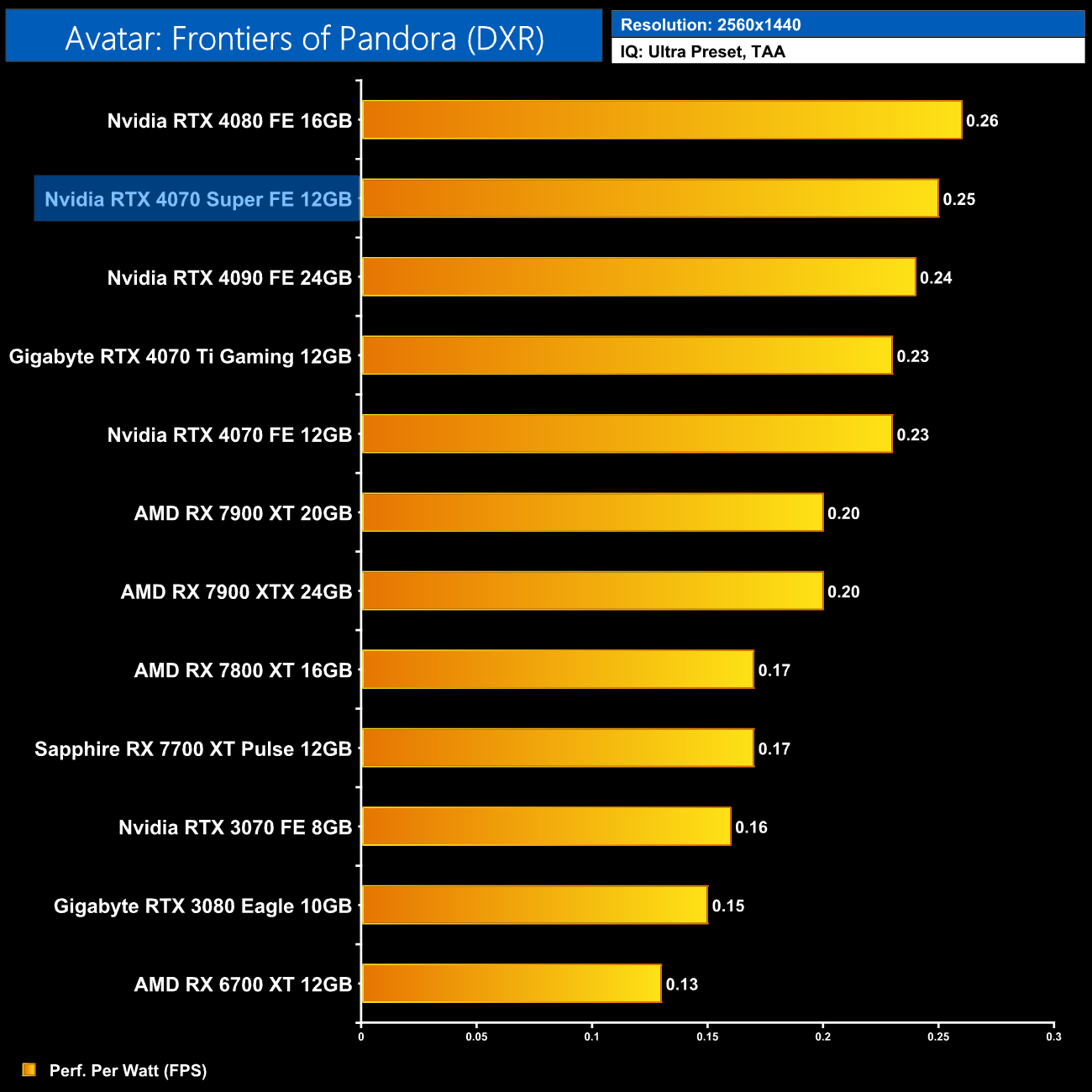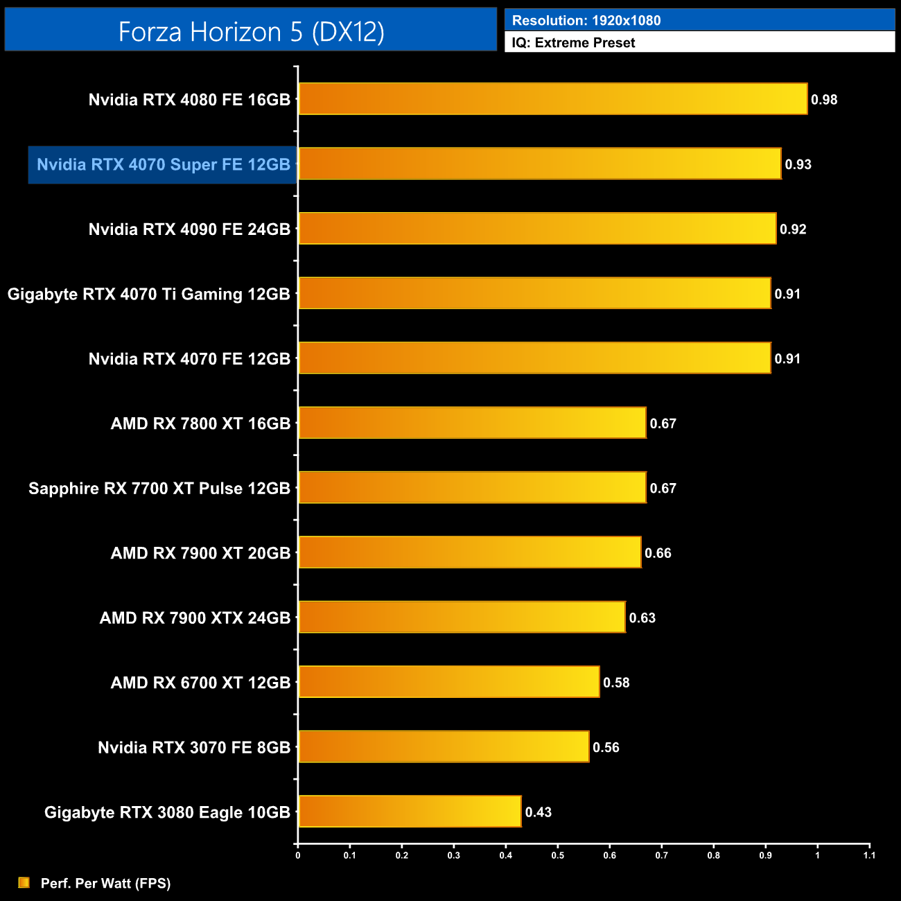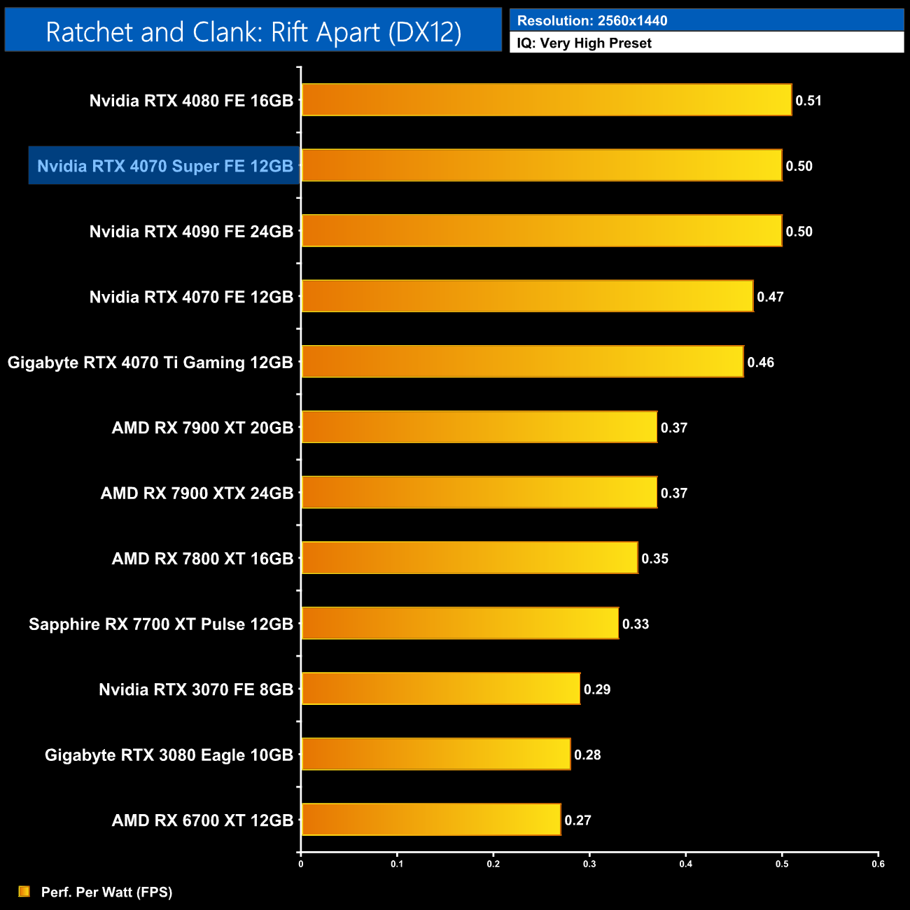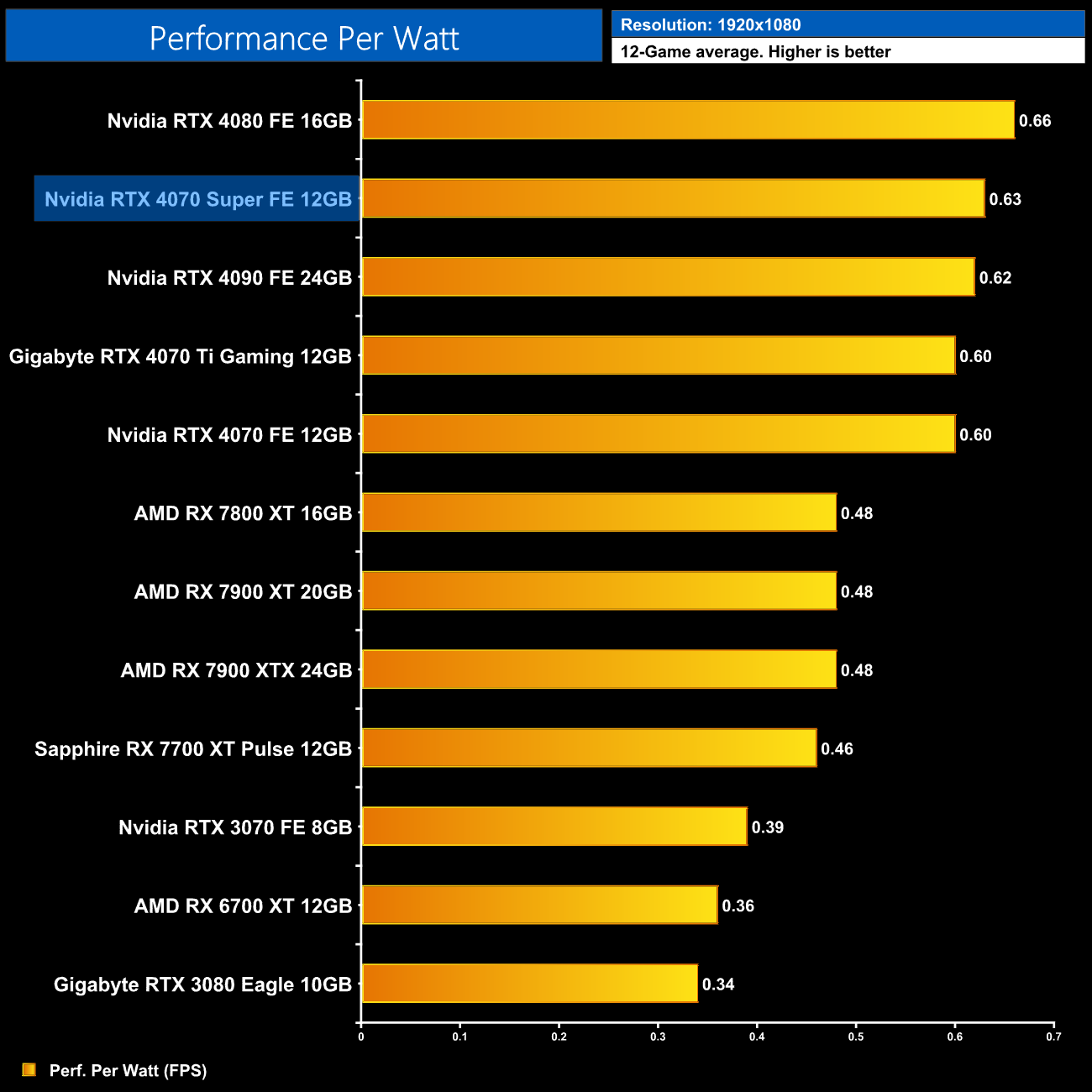 At 1440p, average performance per Watt has increased by 5% compared to the vanilla RTX 4070. The 4080 remains the most efficient GPU we've tested, but compared to RDNA 3, there is a clear lead for Nvidia's Ada architecture on show – the 4070 Super is 19% more efficient than AMD's RX 7900 XT and 7900 XTX.