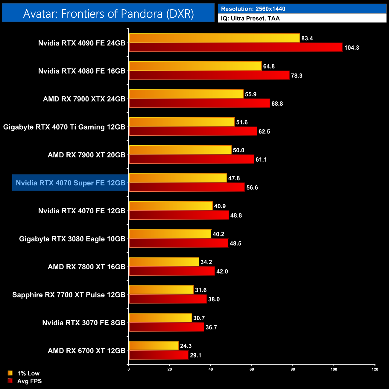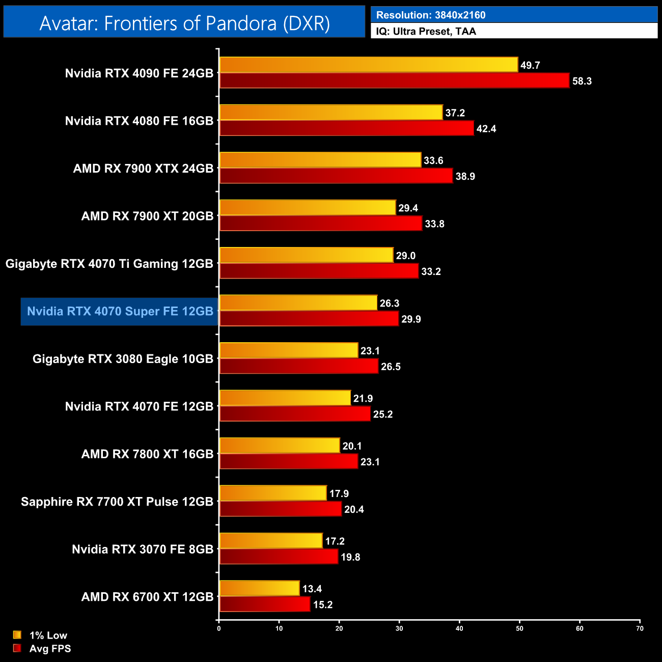 Avatar: Frontiers of Pandora is another new game today that has ray tracing baked into the core of the engine. The 4070 Super delivers 57FPS, and that's a typical 16% uplift versus the RTX 4070. It's also 35% faster than the 7800 XT, and only a handful of frames slower than the 7900 XT.