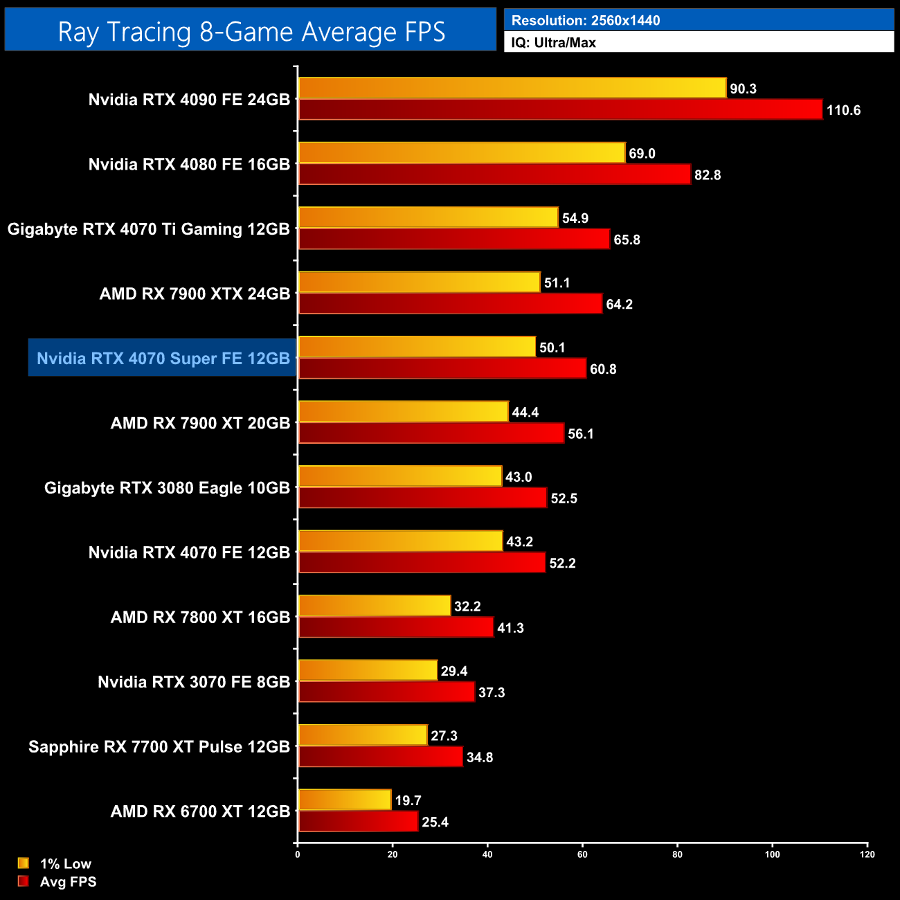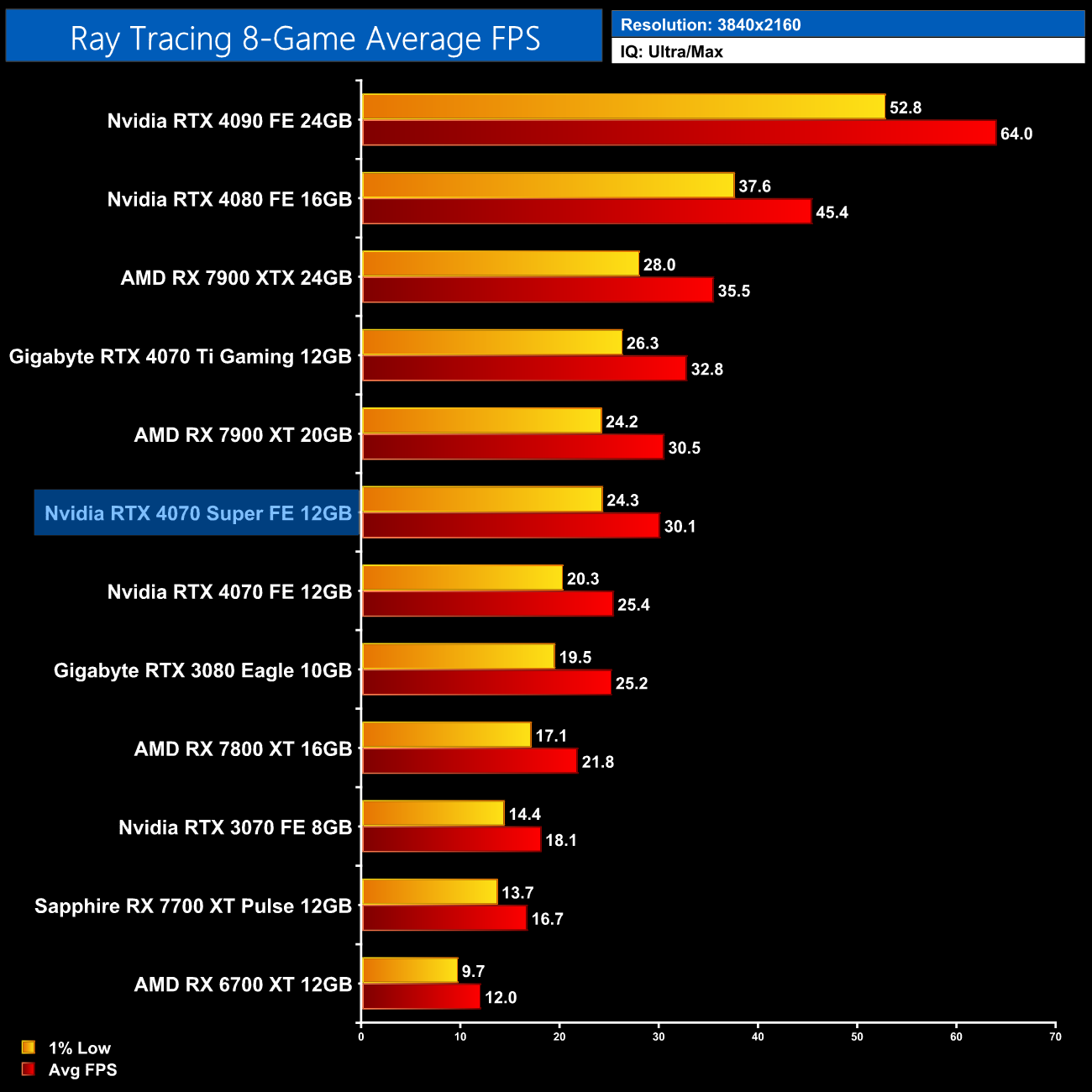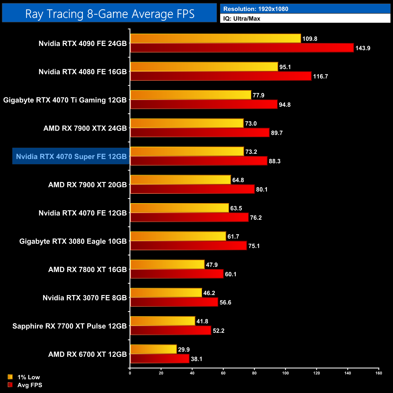 Overall, for ray tracing it is clear that Nvidia hardware does have the edge. We can see that in the average results at 1440p, where the 4070 Super comes in 47% faster than the RX 7800 XT, 8% ahead of the RX 7900 XT and is only 5% behind the much more expensive 7900 XTX. Relative to Nvidia's own offerings, we see pretty typical results, with the 4070 Super 17% faster than the 4070 and 8% slower than the 4070 Ti.