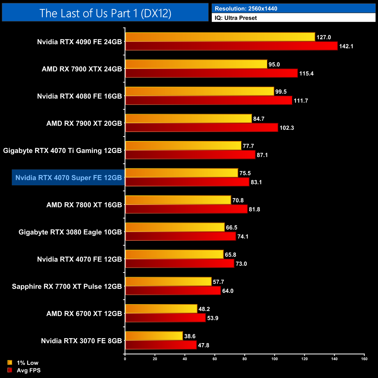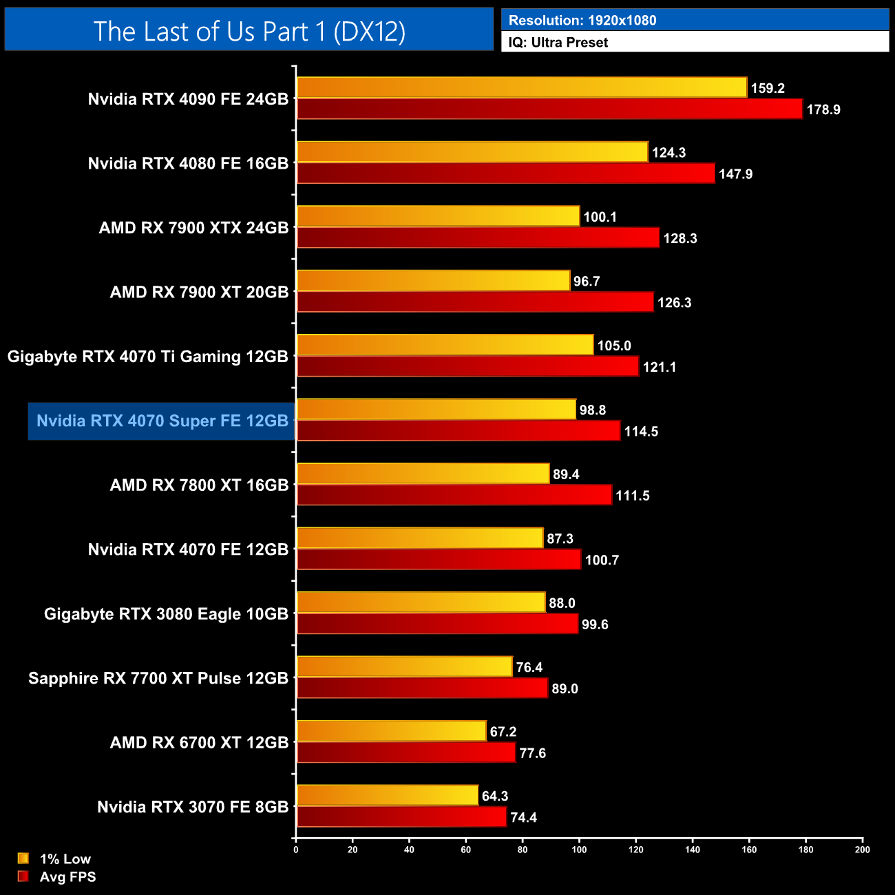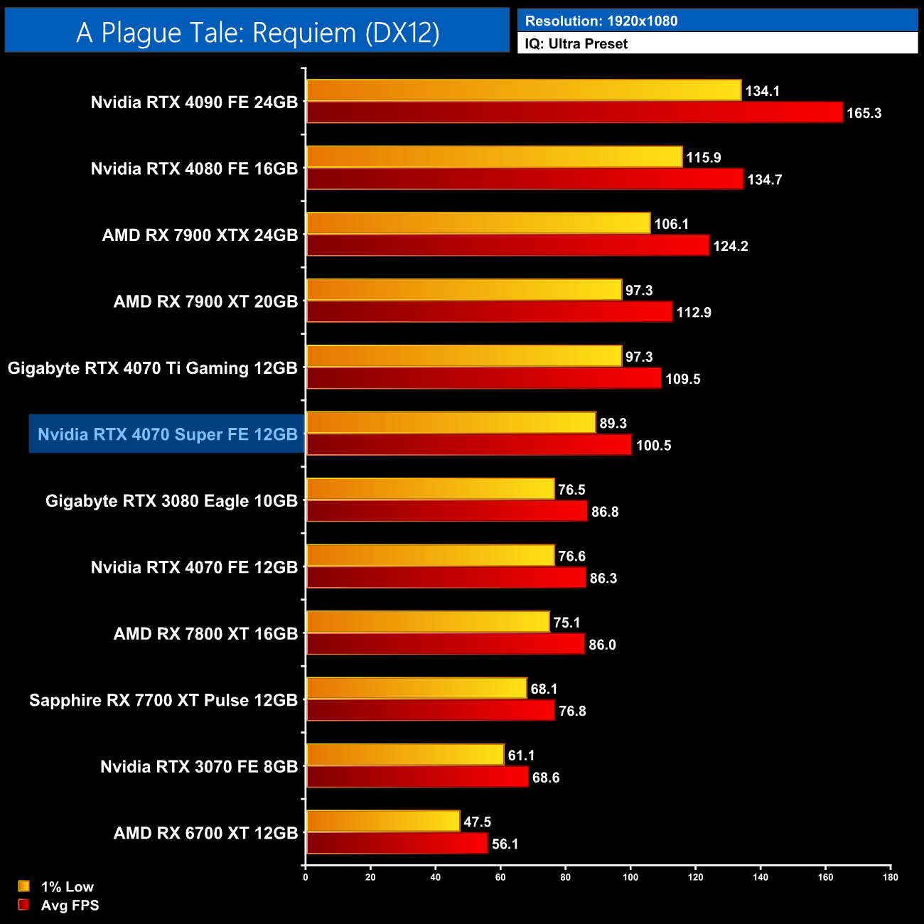 Overall, for ray tracing it is clear that Nvidia hardware does have the edge. We can see that in the average results at 1440p, where the 4070 Super comes in 47% faster than the RX 7800 XT, 8% ahead of the RX 7900 XT and is only 5% behind the much more expensive 7900 XTX. Relative to Nvidia's own offerings, we see pretty typical results, with the 4070 Super 17% faster than the 4070 and 8% slower than the 4070 Ti.