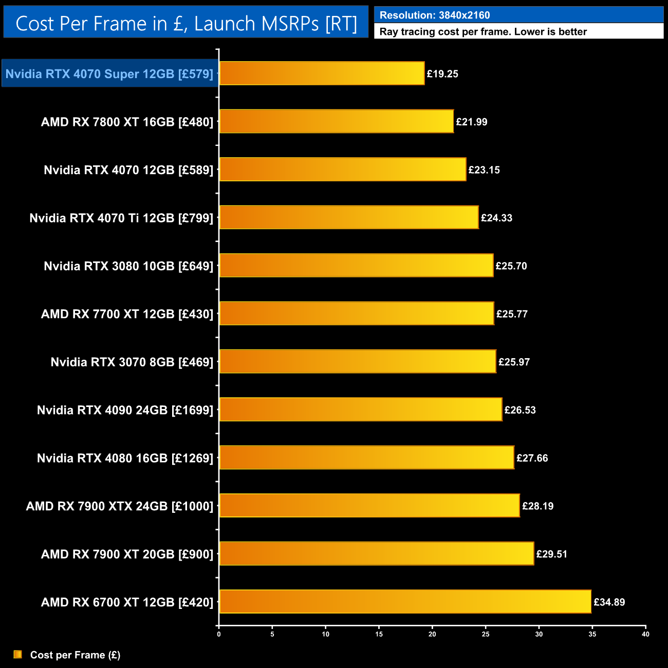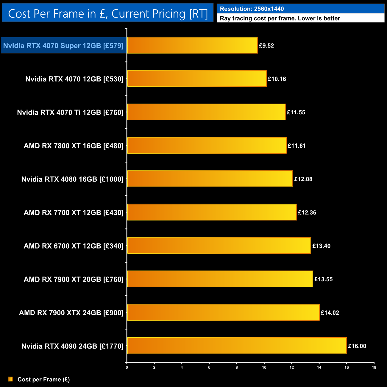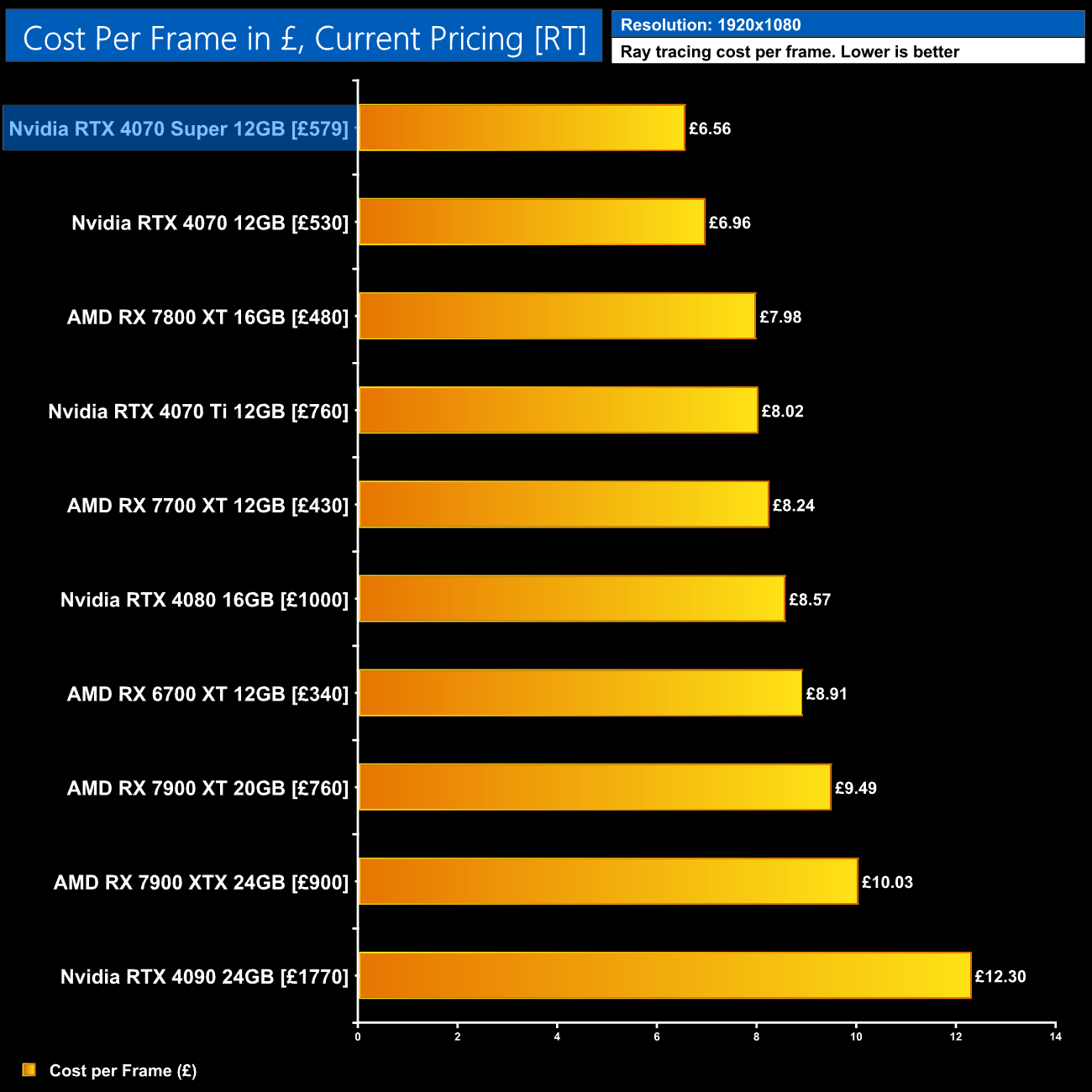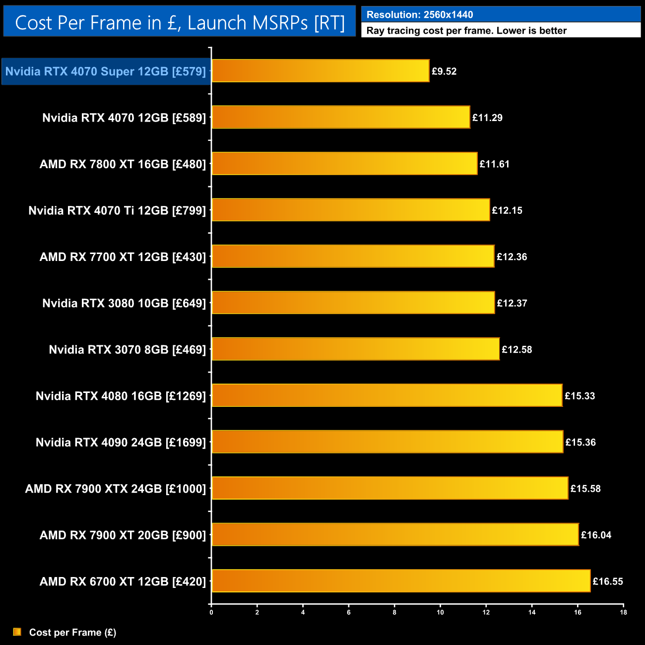 Even with the RTX 4070 on sale for as little as £530, the 4070 Super at £579 would represent a 6% improvement in ray tracing cost per frame when looking at the 1440p data using current retail prices.