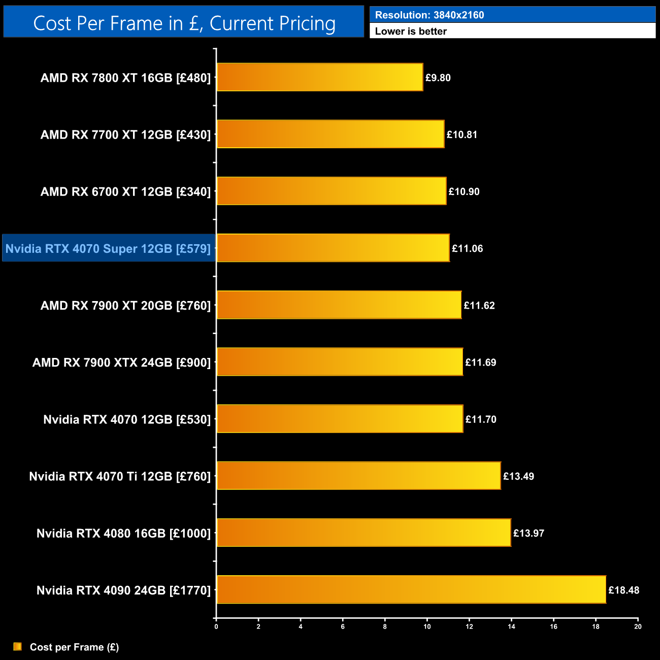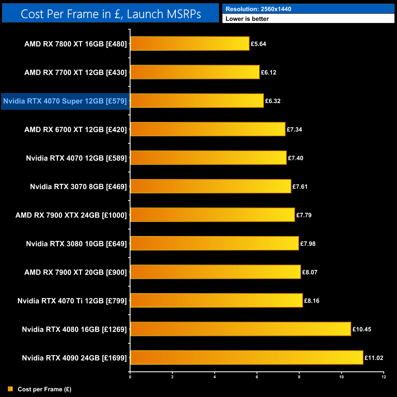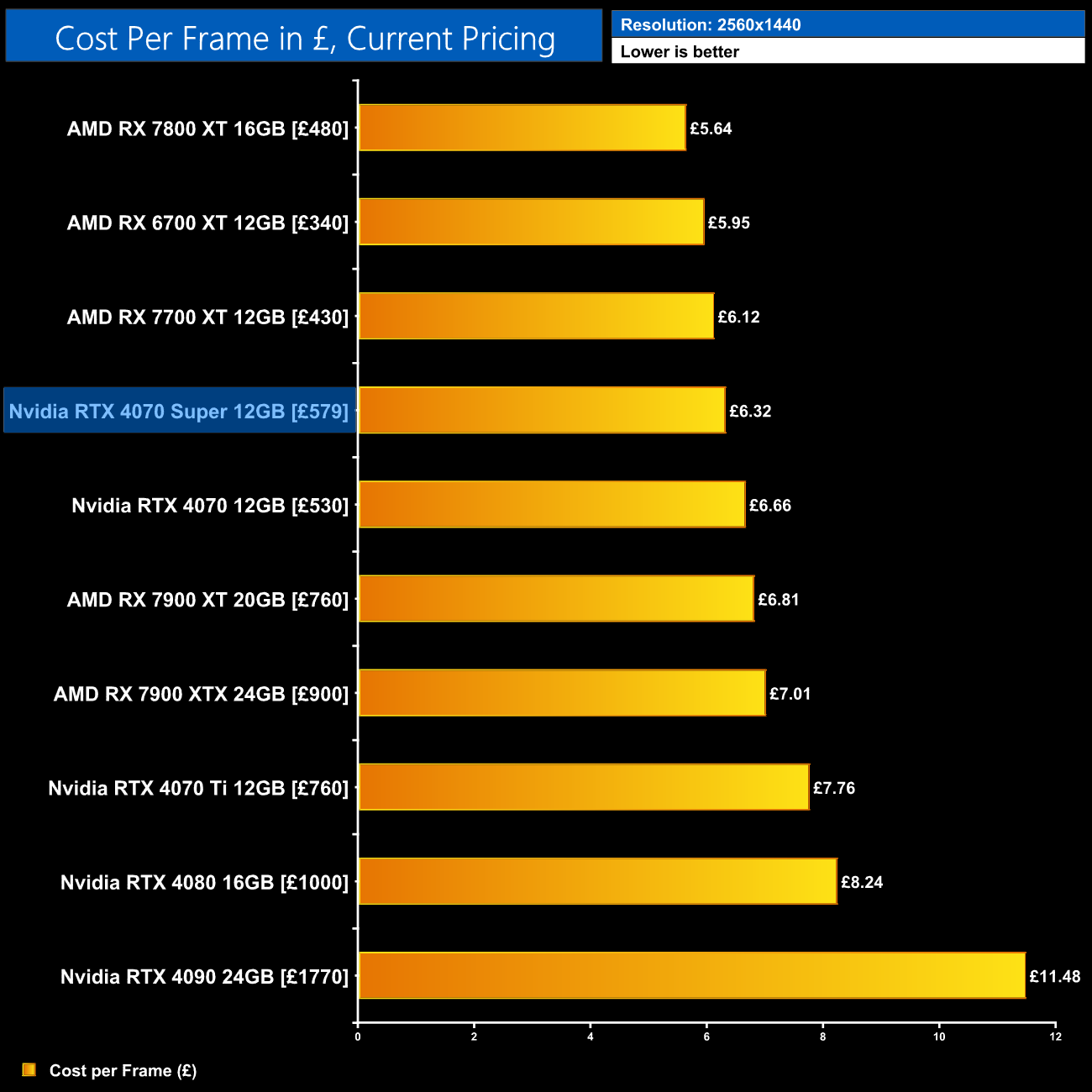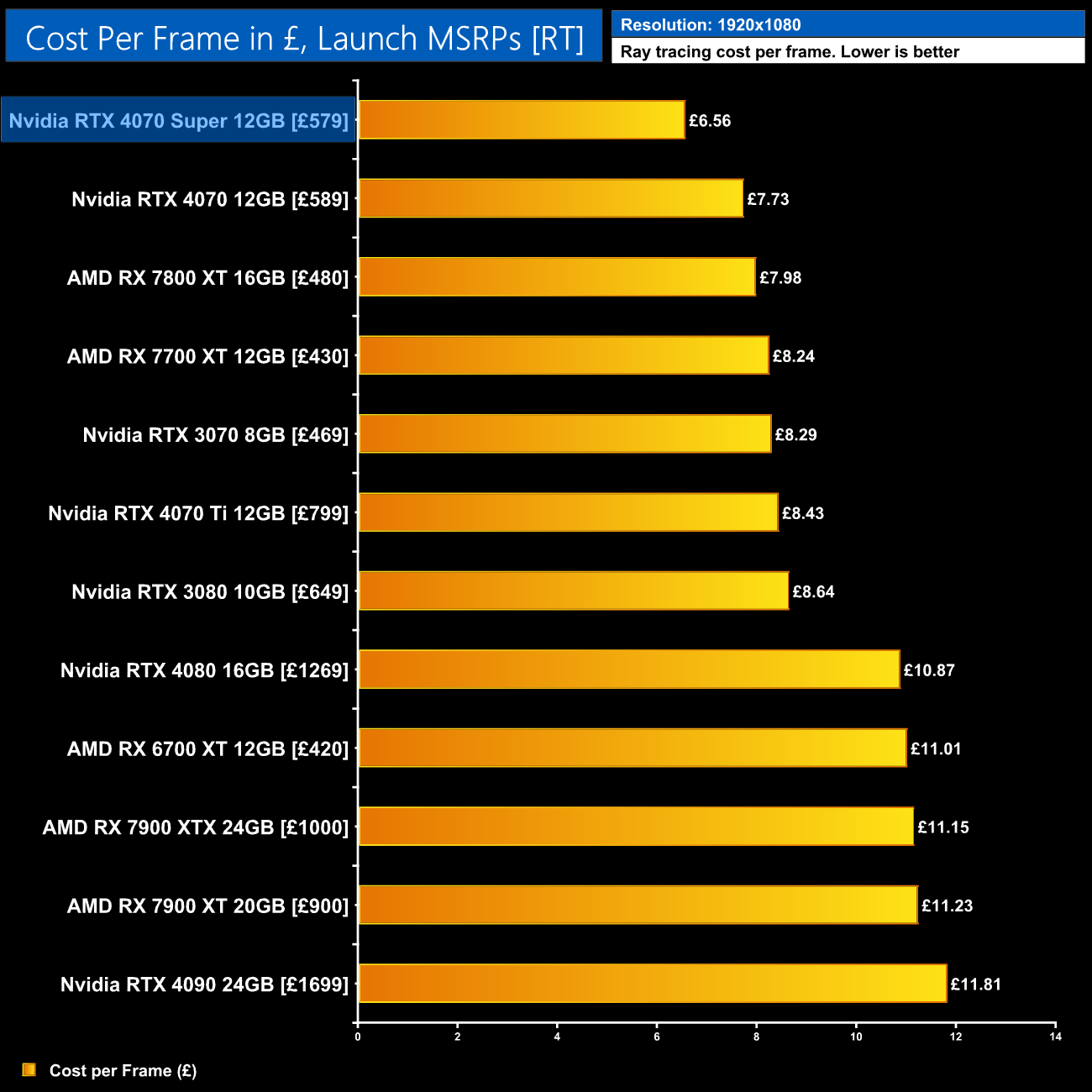 Even with the RTX 4070 on sale for as little as £530, the 4070 Super at £579 would represent a 6% improvement in ray tracing cost per frame when looking at the 1440p data using current retail prices.