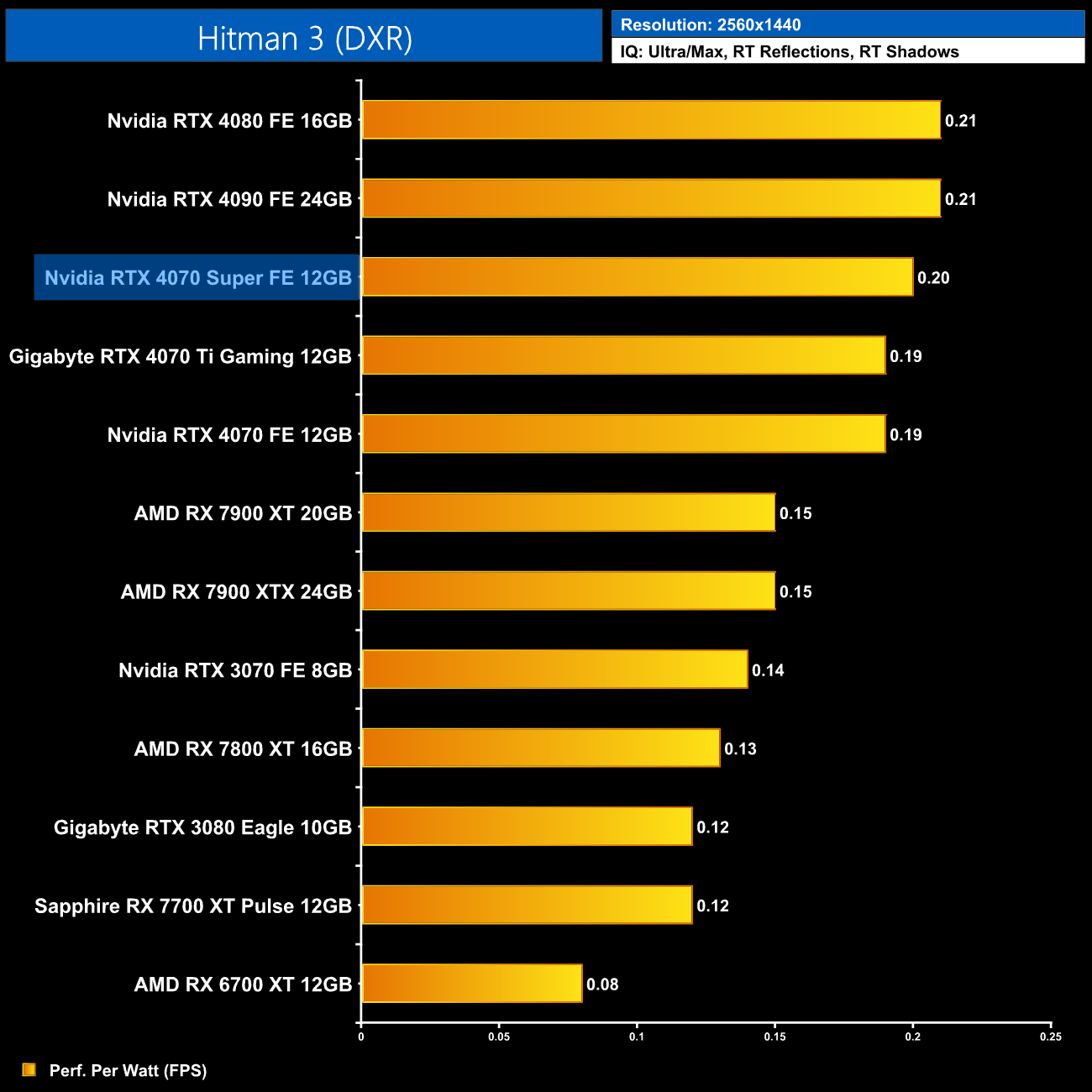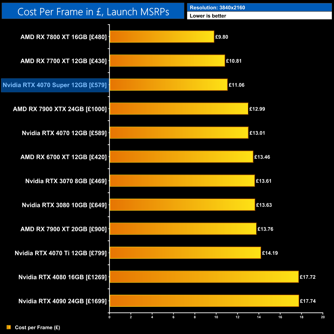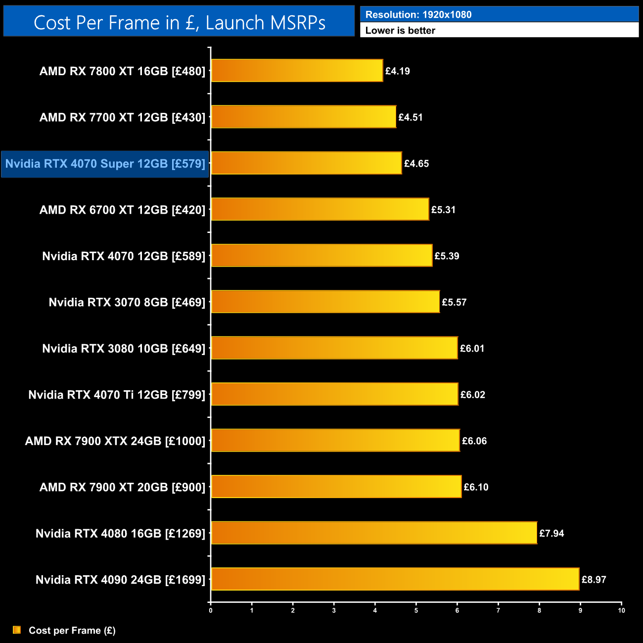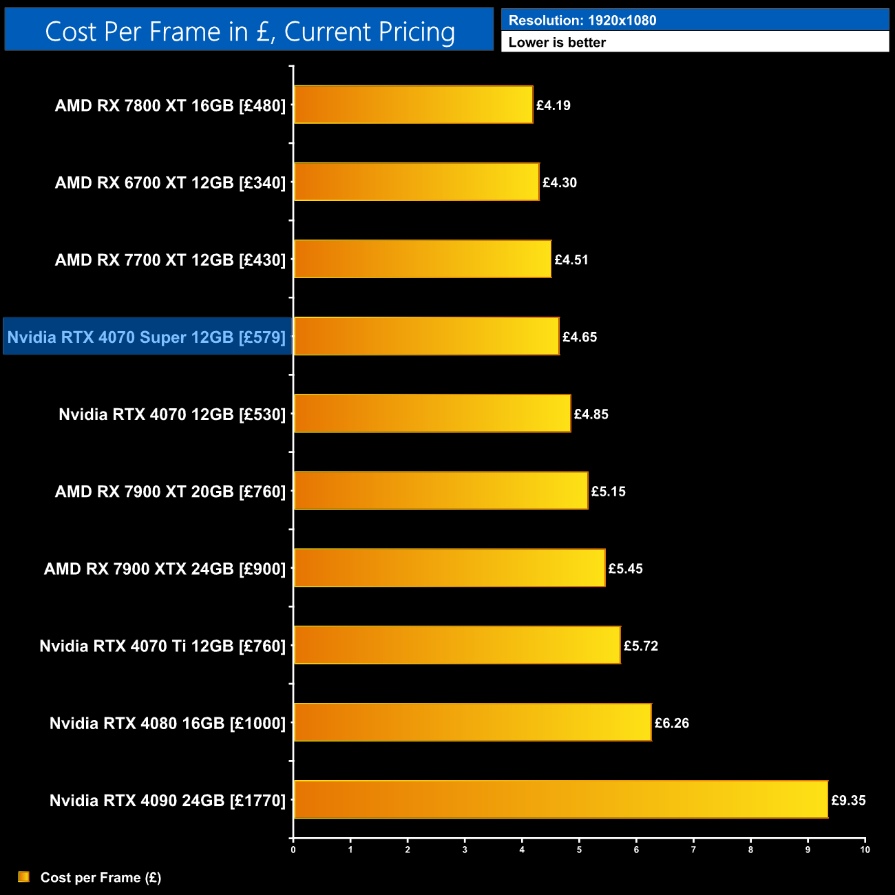 Even with the RTX 4070 on sale for as little as £530, the 4070 Super at £579 would represent a 6% improvement in ray tracing cost per frame when looking at the 1440p data using current retail prices.