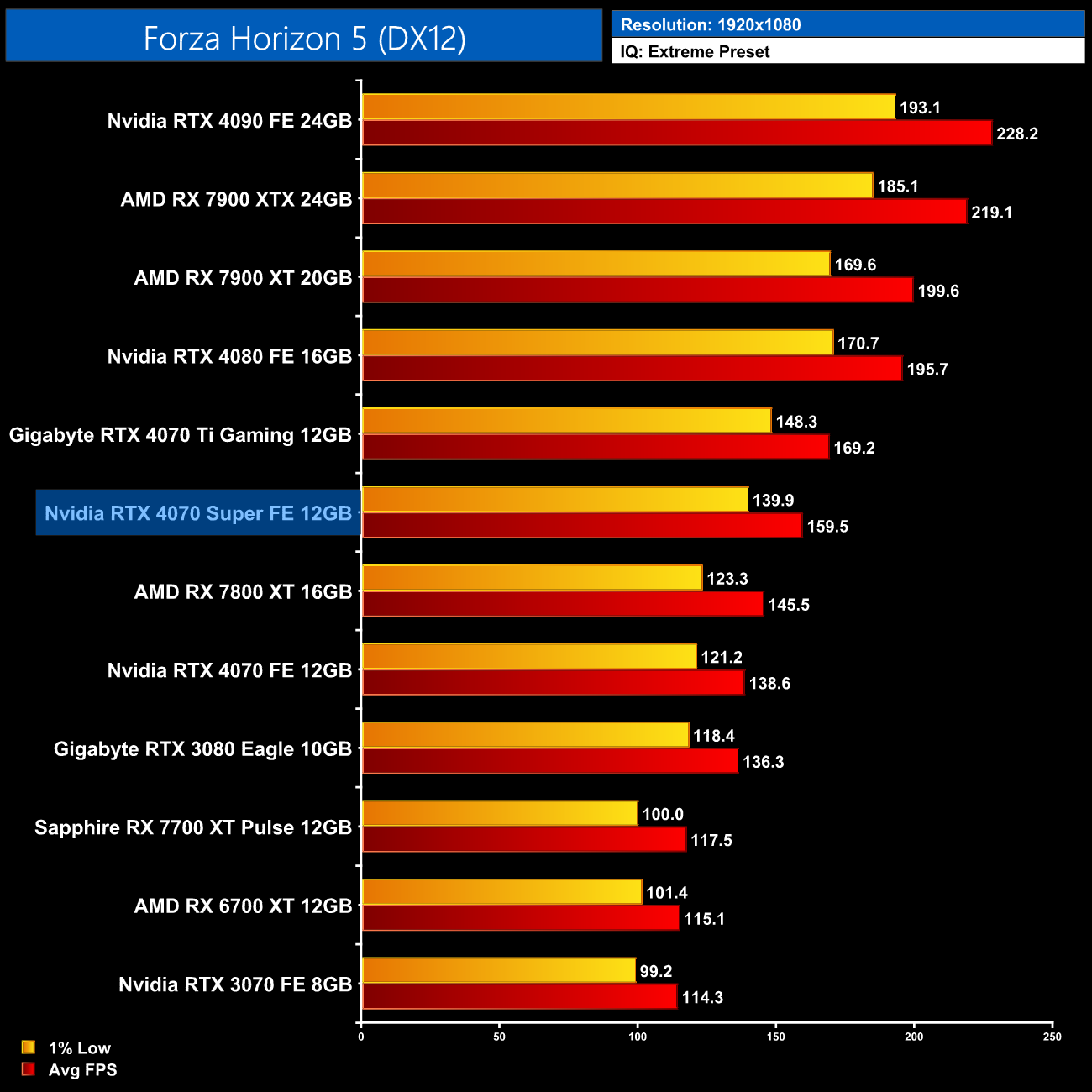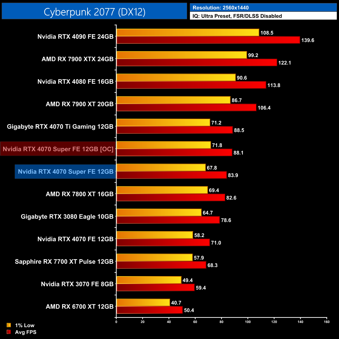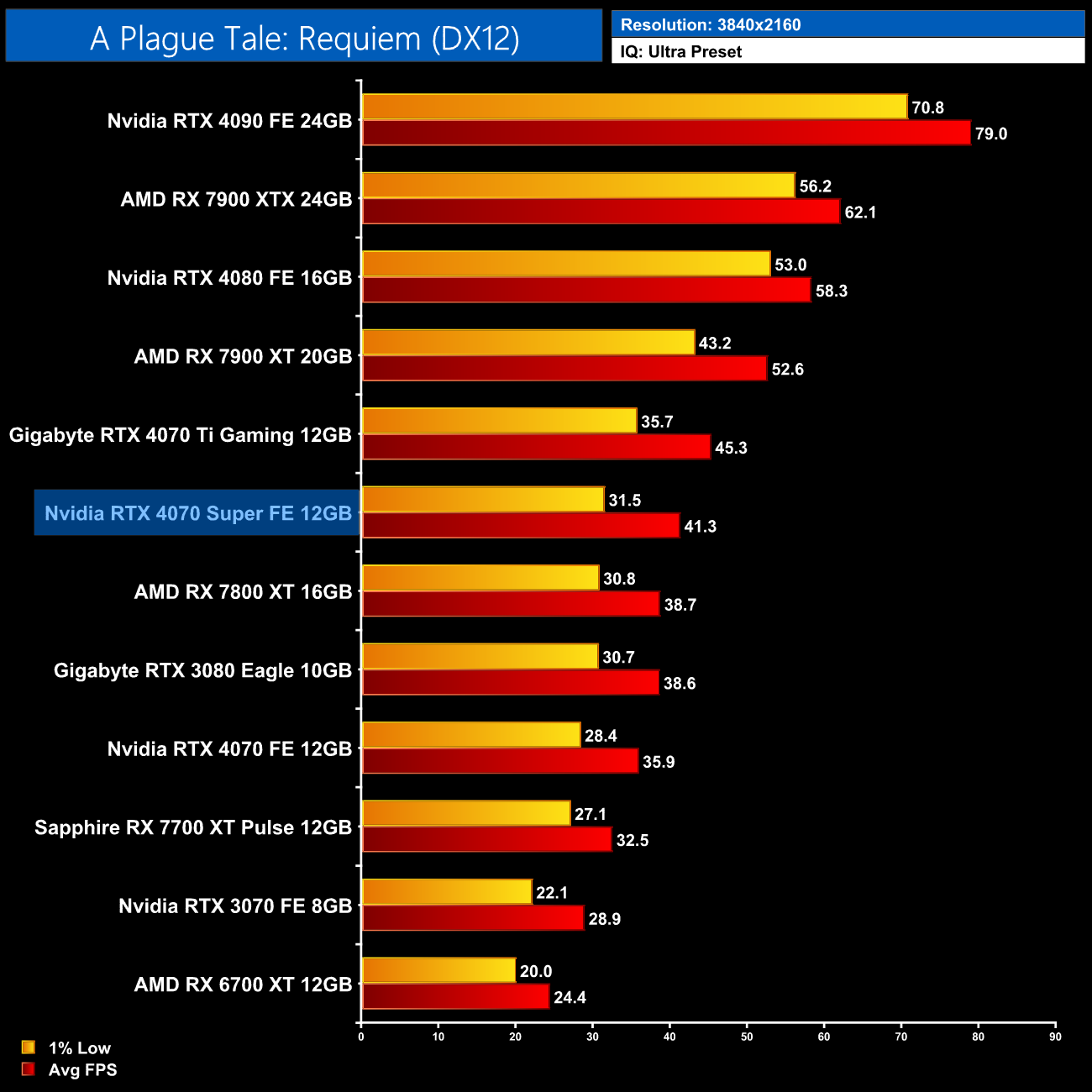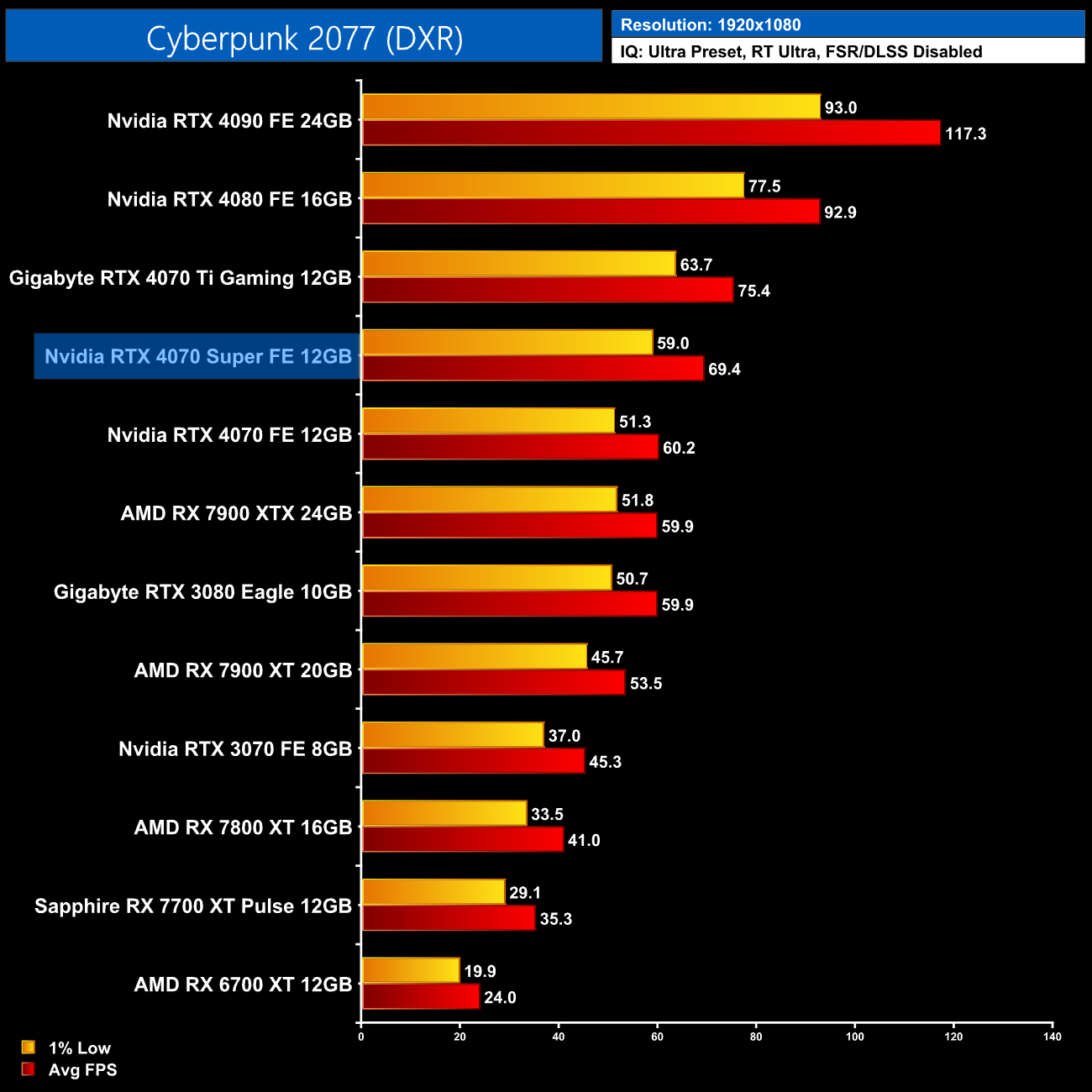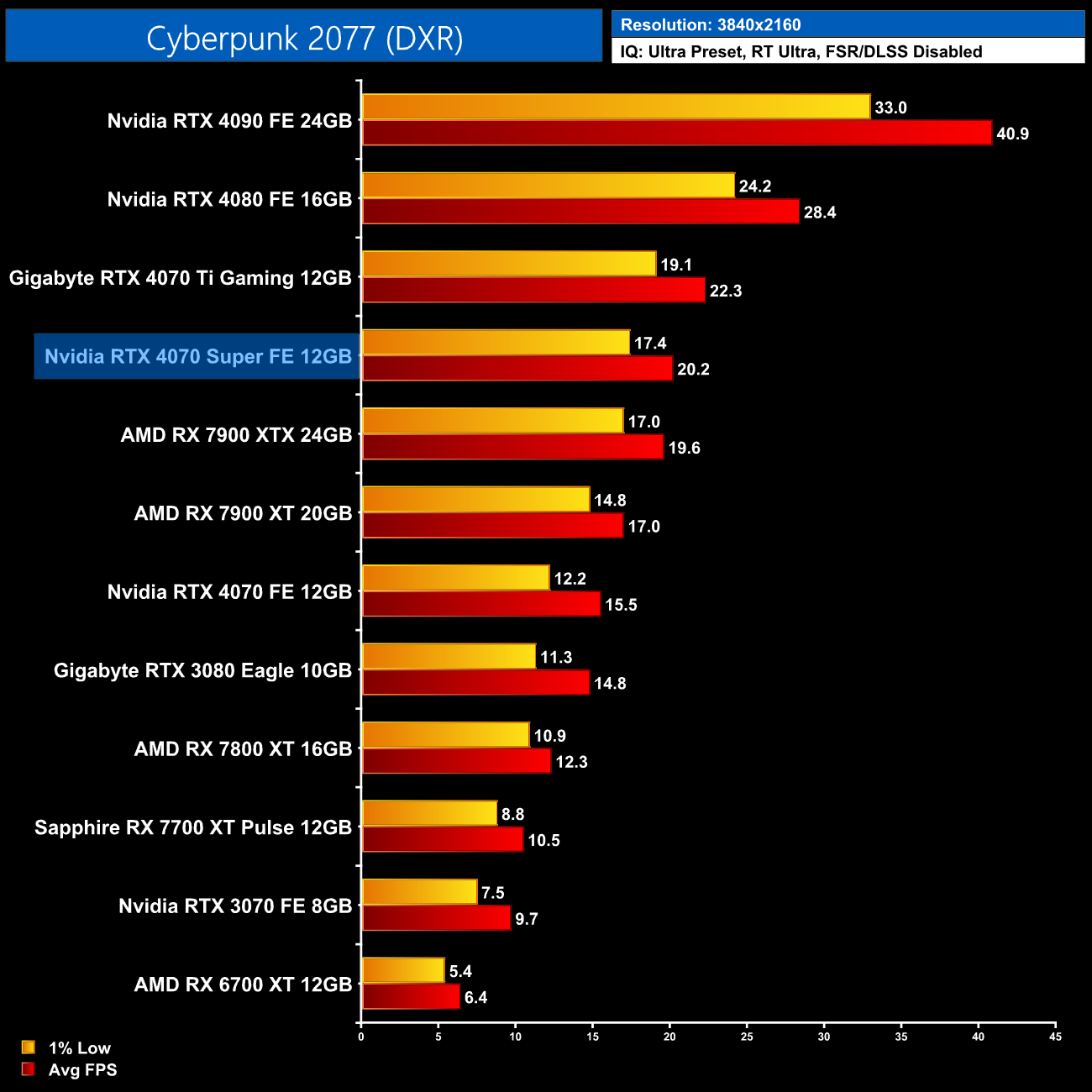 As for Cyberpunk 2077, we're on using the RT Ultra preset here – not the path-traced RT Overdrive mode – but it's still very punishing, bringing the 4070 Super to just 43FPS on average without any form of upscaling. That still makes it faster than the RX 7900 XTX though, and it's the usual 17% faster than the 4070.