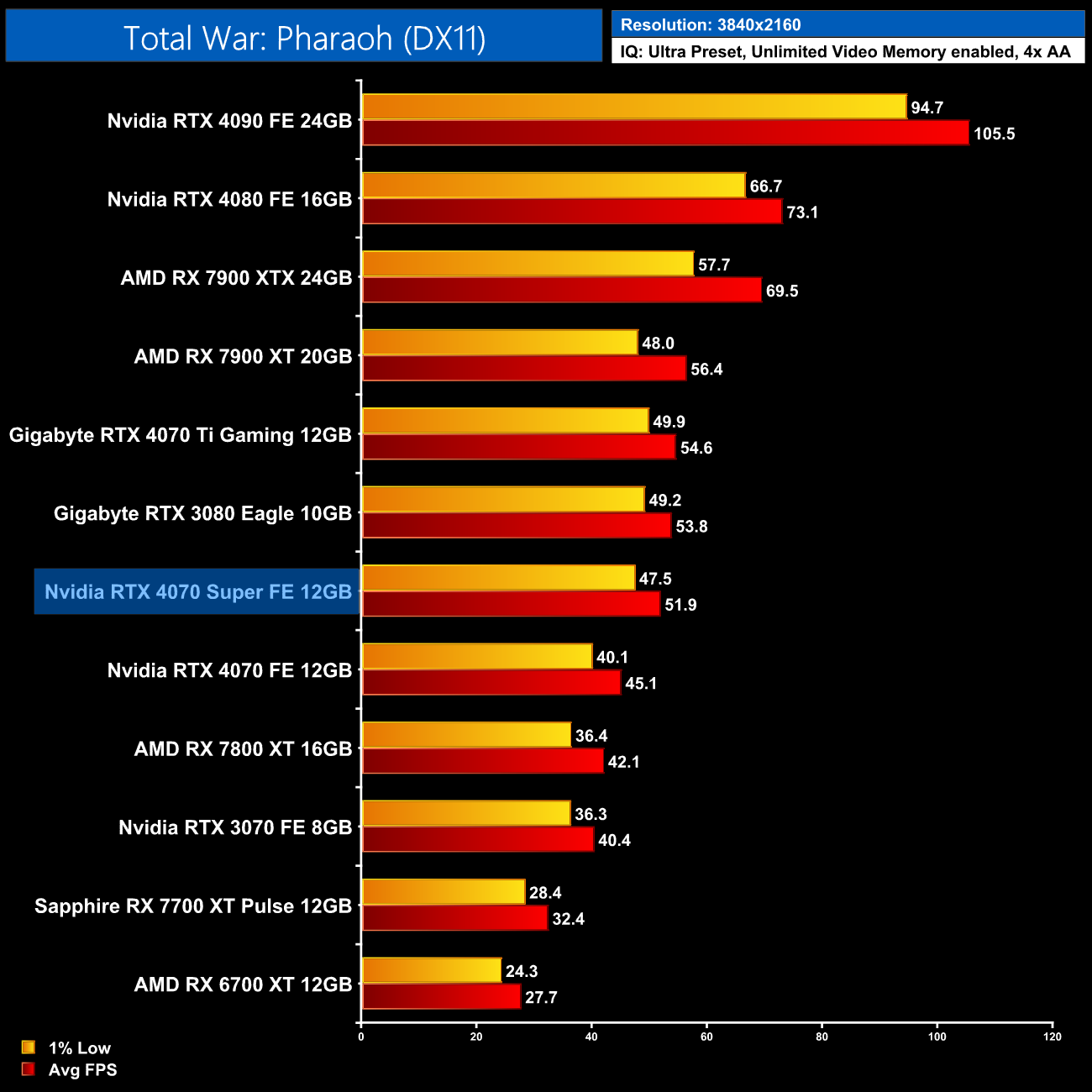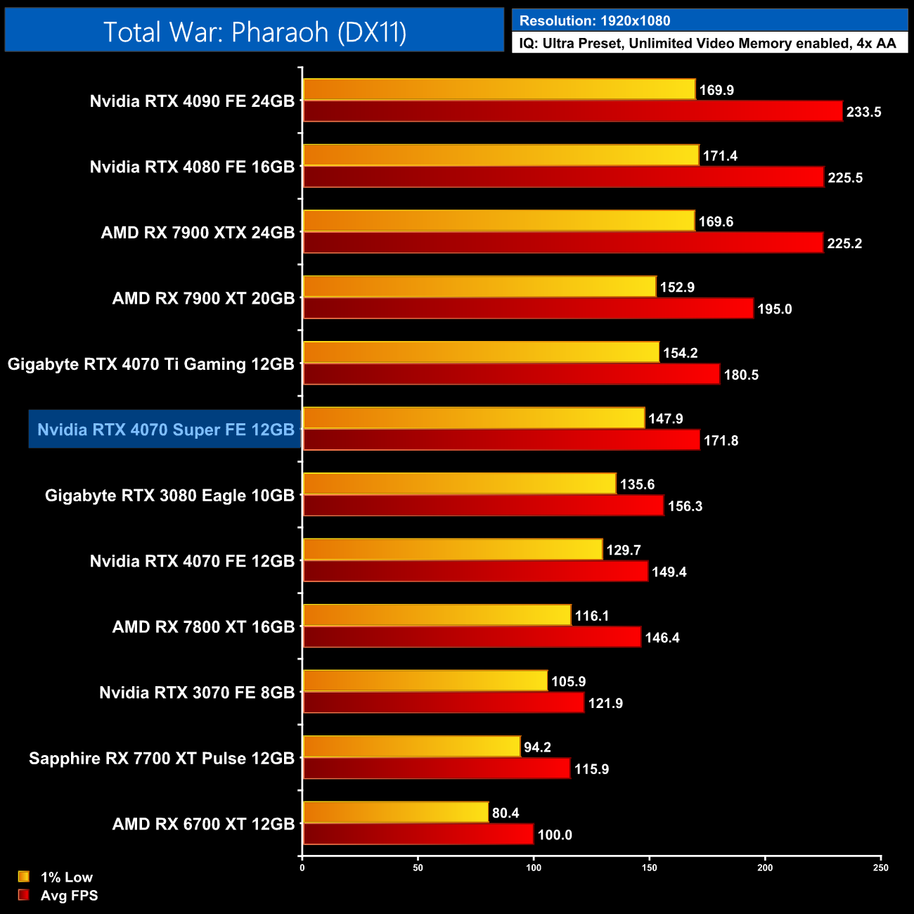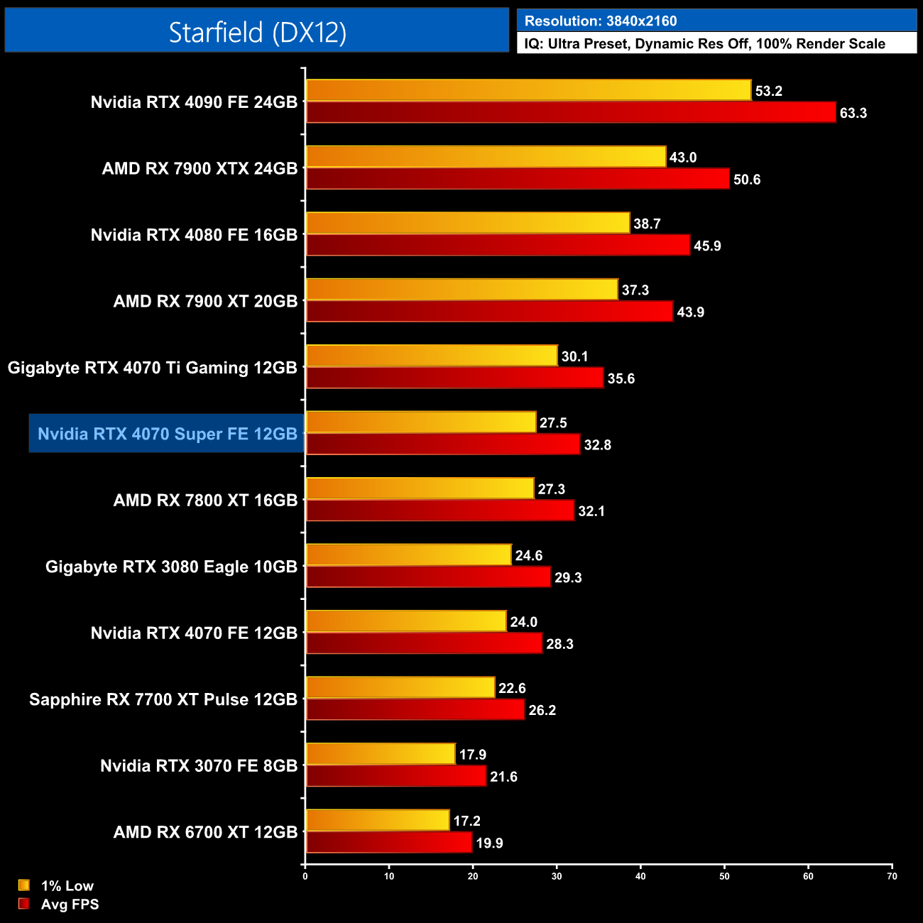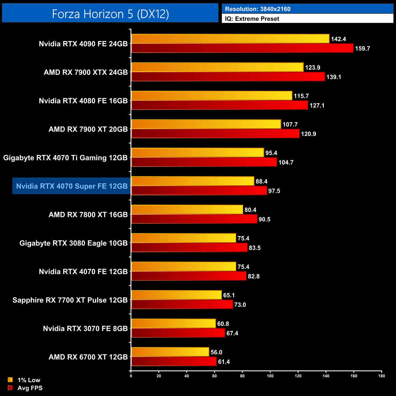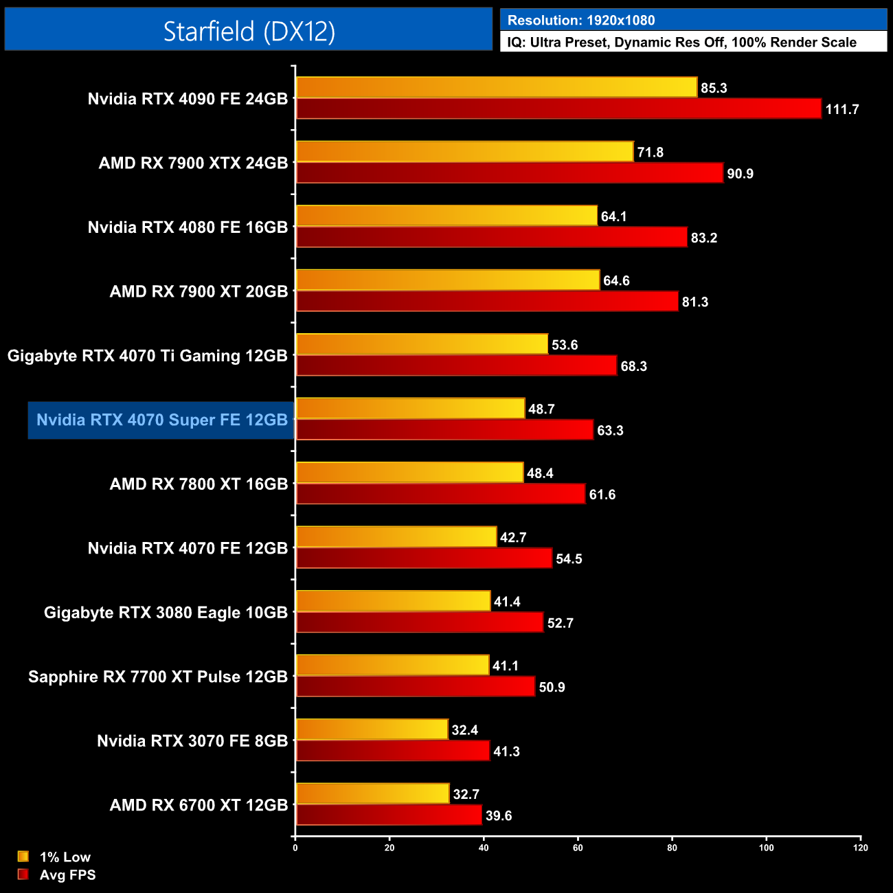 As for Cyberpunk 2077, we're on using the RT Ultra preset here – not the path-traced RT Overdrive mode – but it's still very punishing, bringing the 4070 Super to just 43FPS on average without any form of upscaling. That still makes it faster than the RX 7900 XTX though, and it's the usual 17% faster than the 4070.