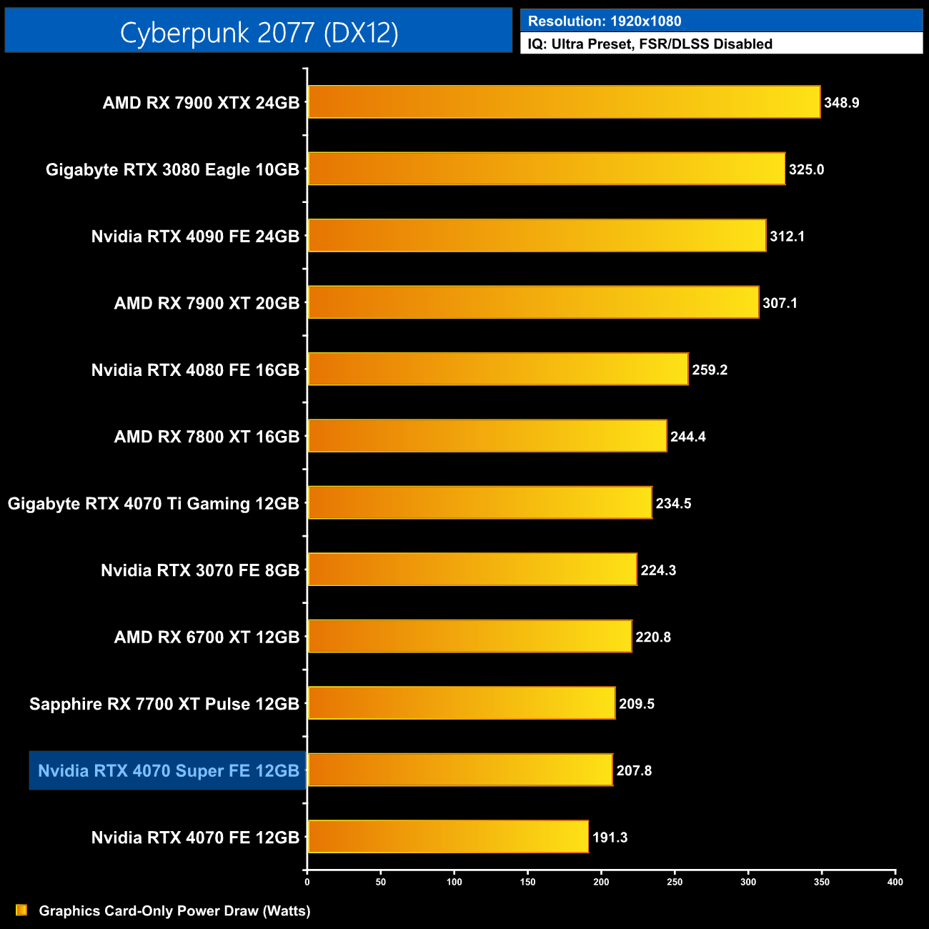 For a quick look at total system power draw, my test rig with an i9-13900KS pulled below 400W with the 4070 Super, when running Cyberpunk 2077 at 4K. Of course this will vary depending on the CPU and game, though Nvidia does recommend a 650W power supply.