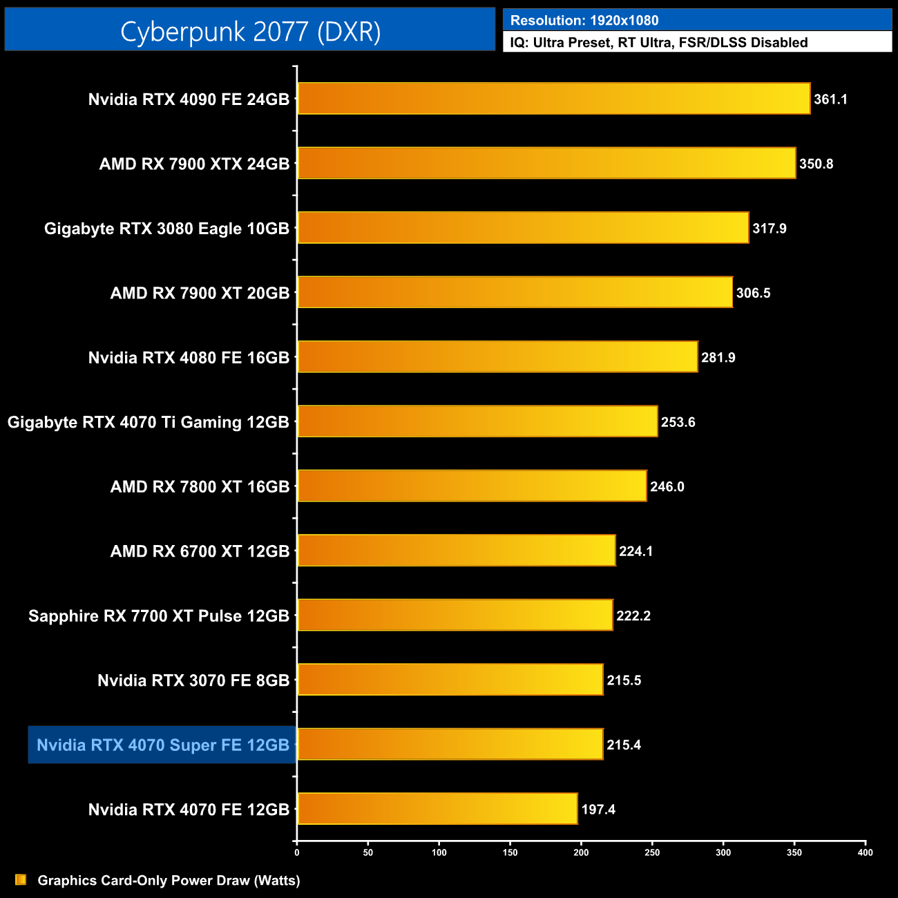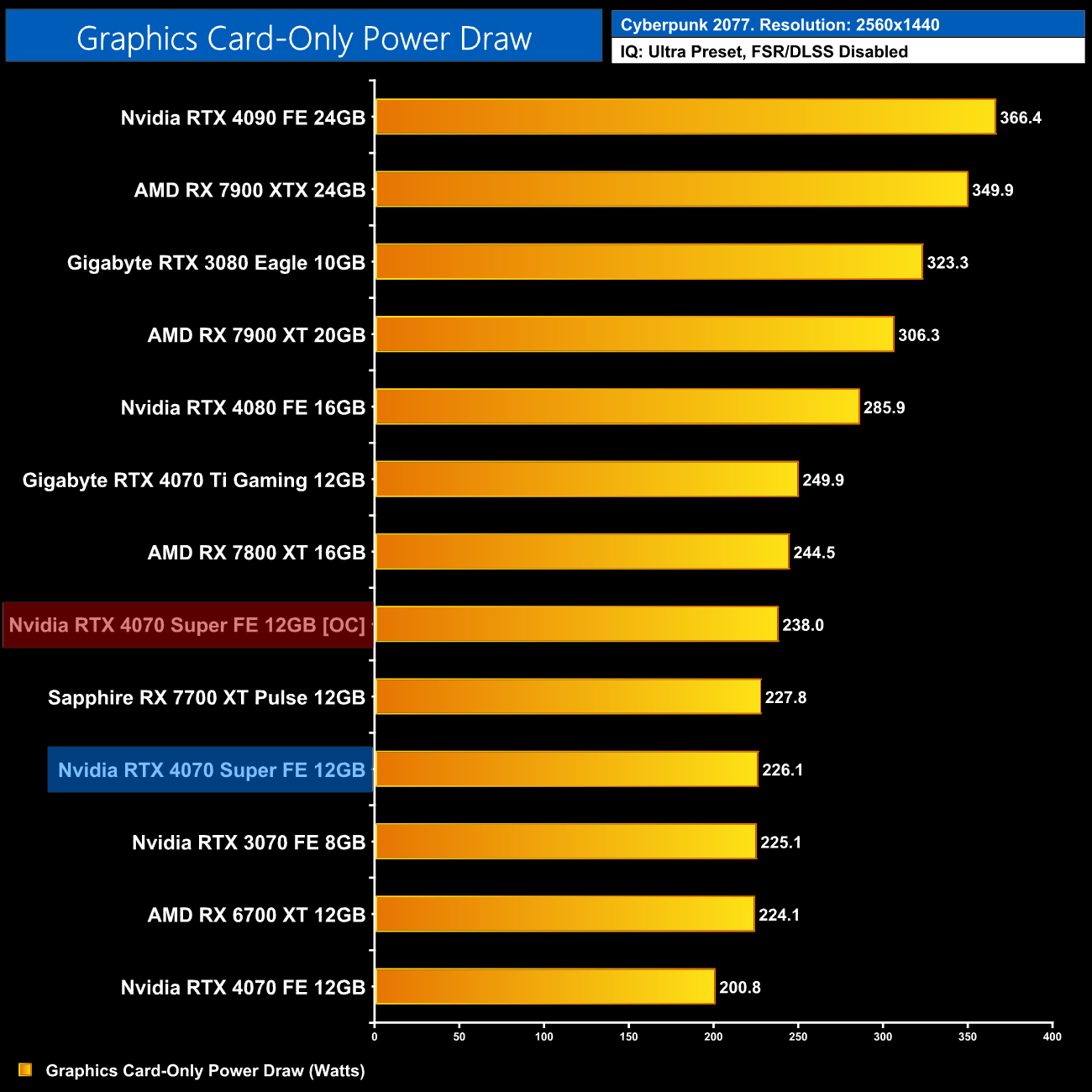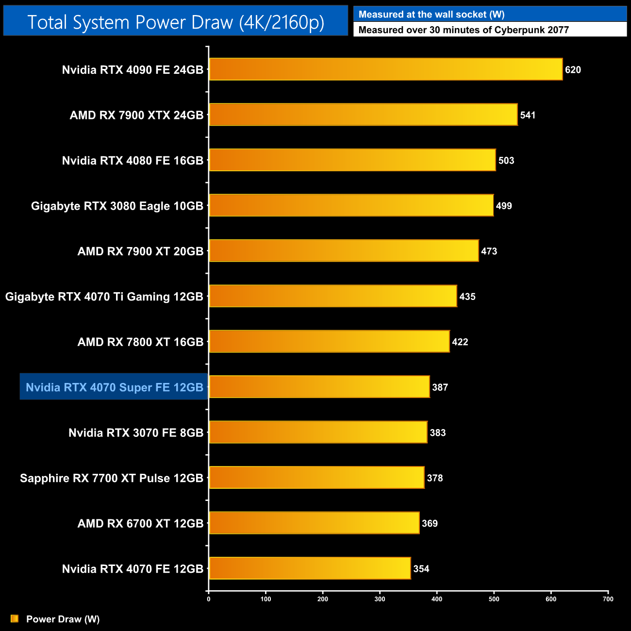 We measure system-wide power draw from the wall while running Cyberpunk 2077 for 30 minutes at 2160p (4K) resolution.